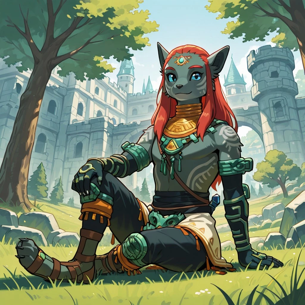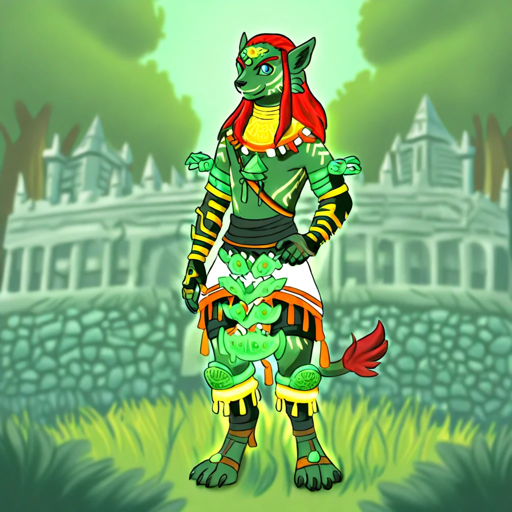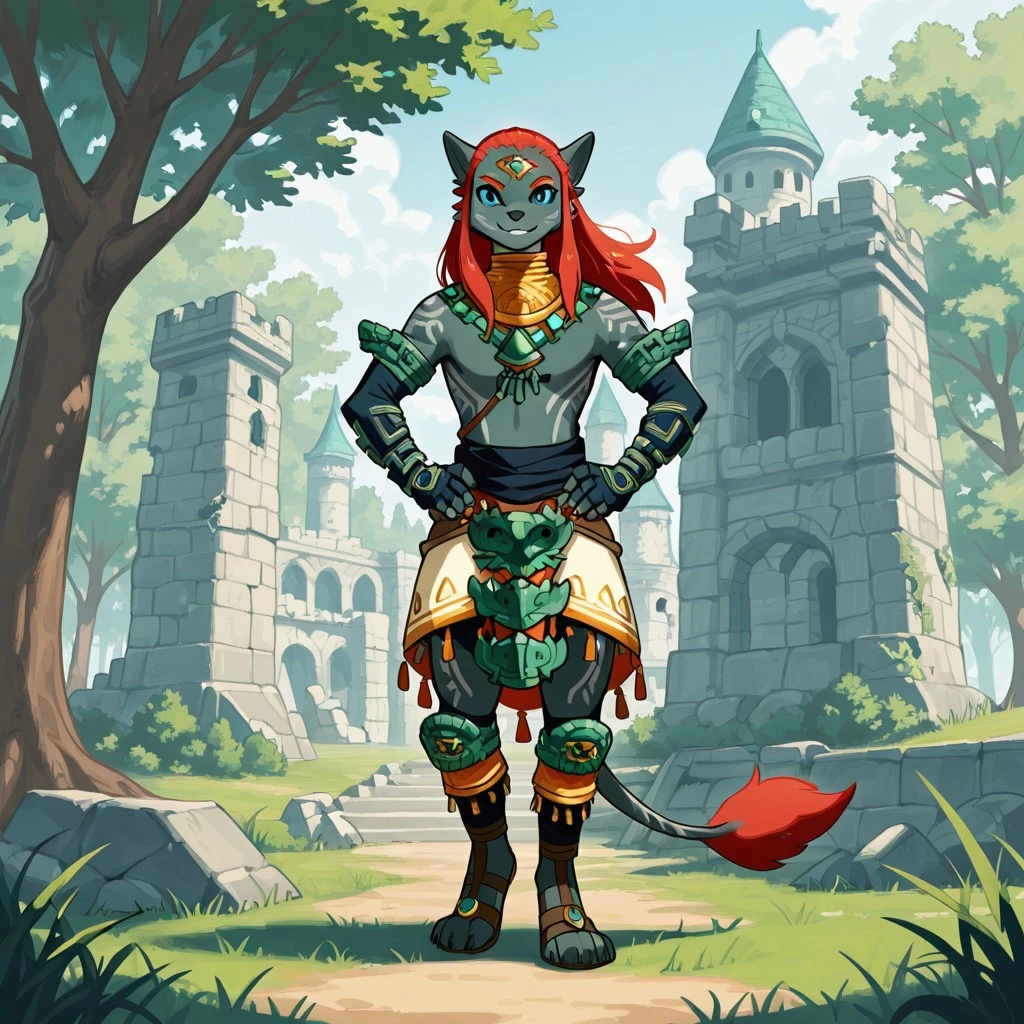 Ancient hero(character), male, anthro, red hair, grey body markings, hero outfit, Masculine, blue sclera