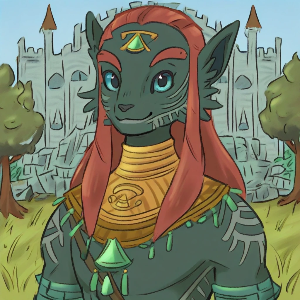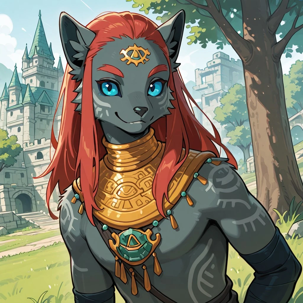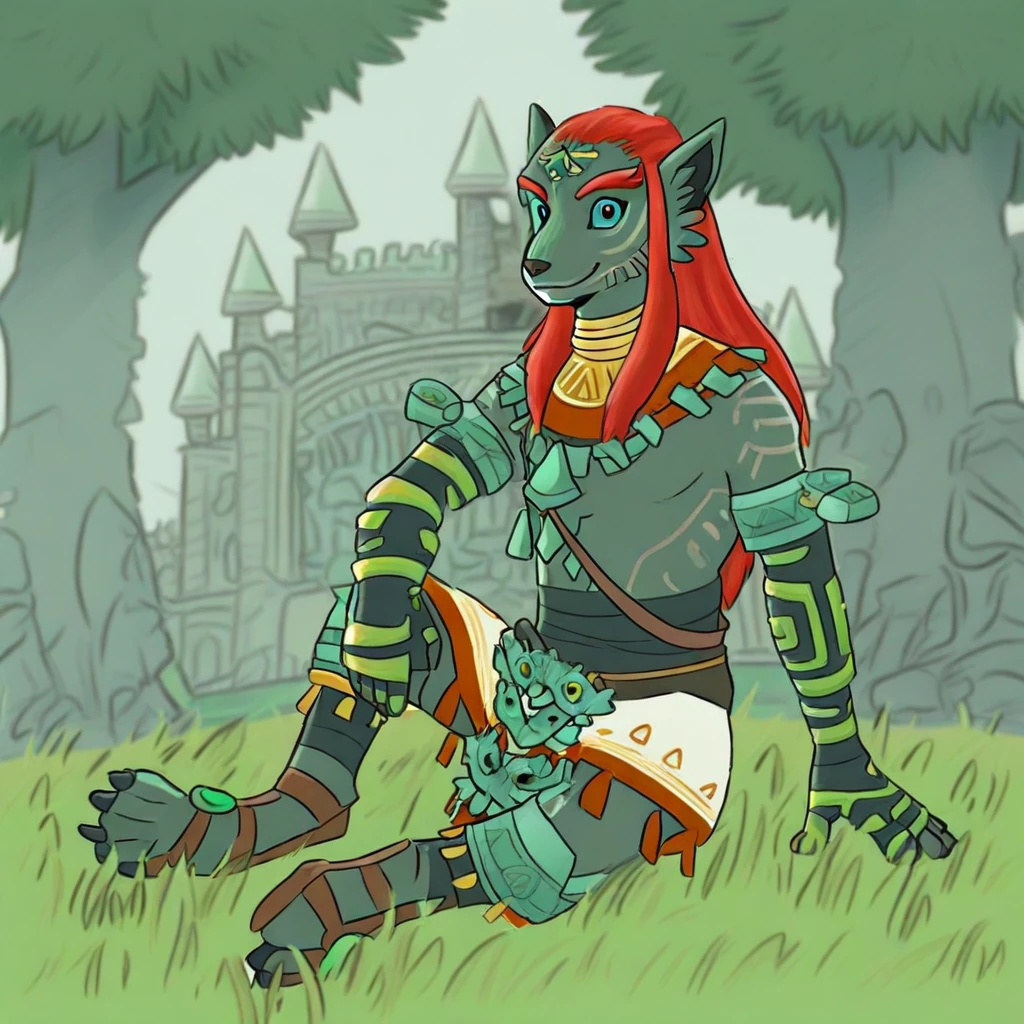 Ancient hero(character), male, anthro, red hair, grey body markings, hero outfit, Masculine, blue sclera