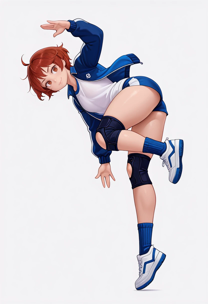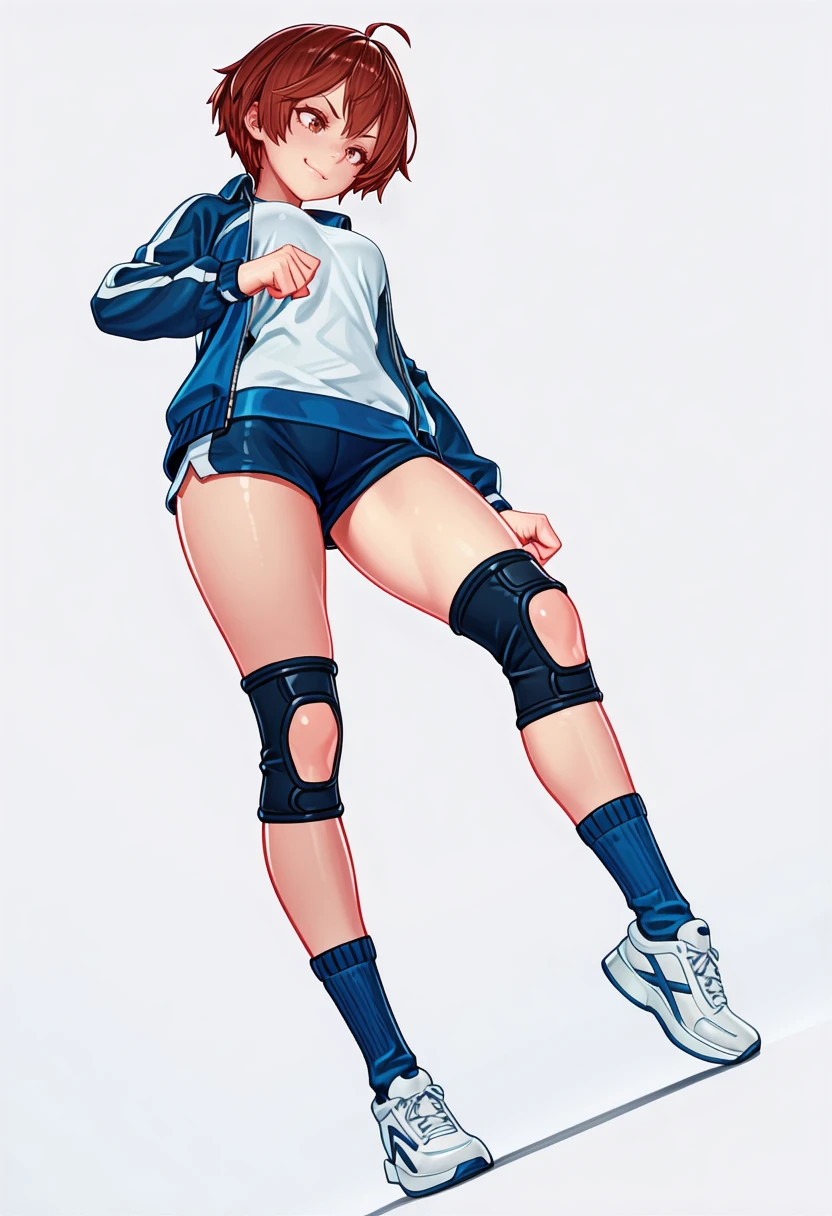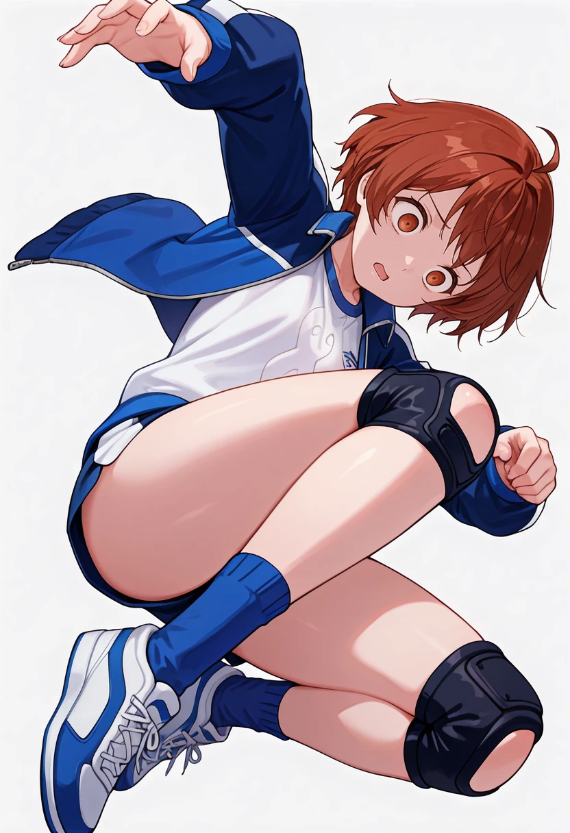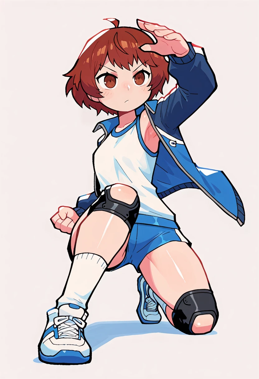 blue track jacket, , long sleeves, white shirt, knee pads,sneakers, socks, short shorts,