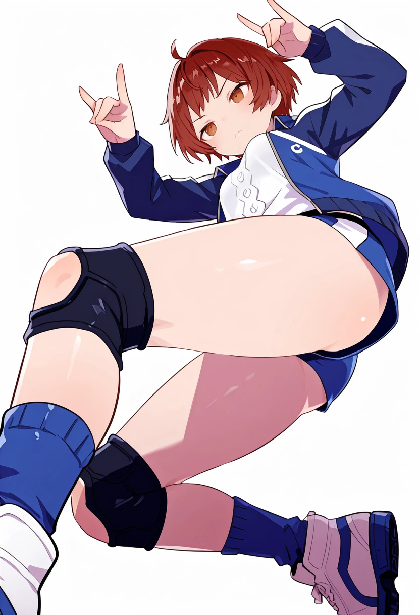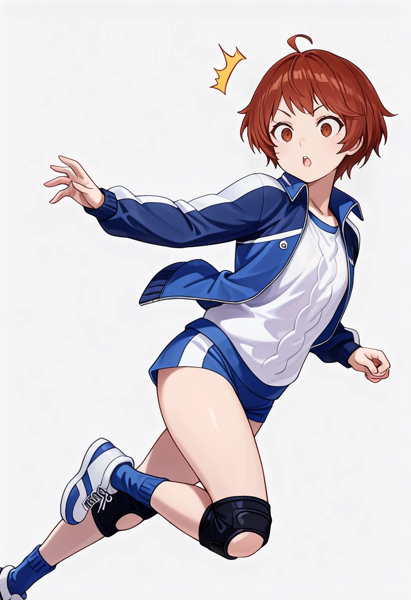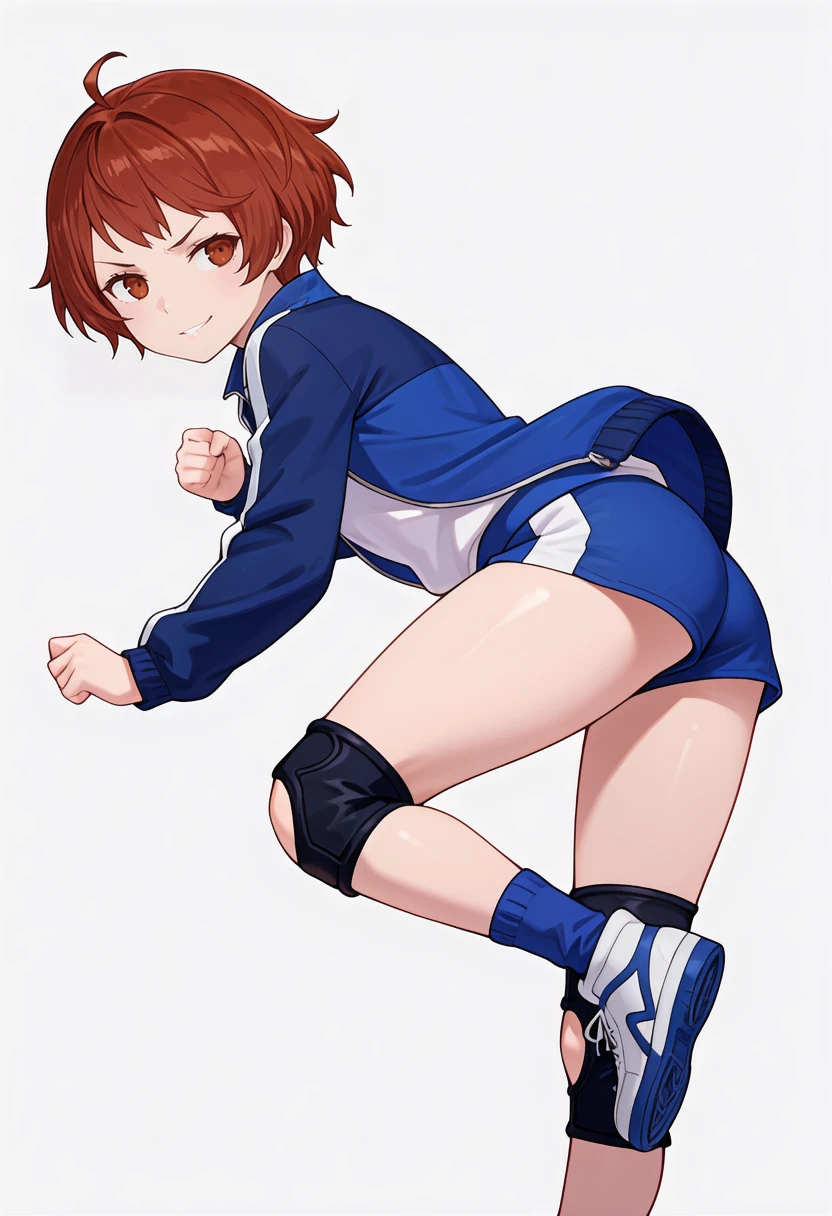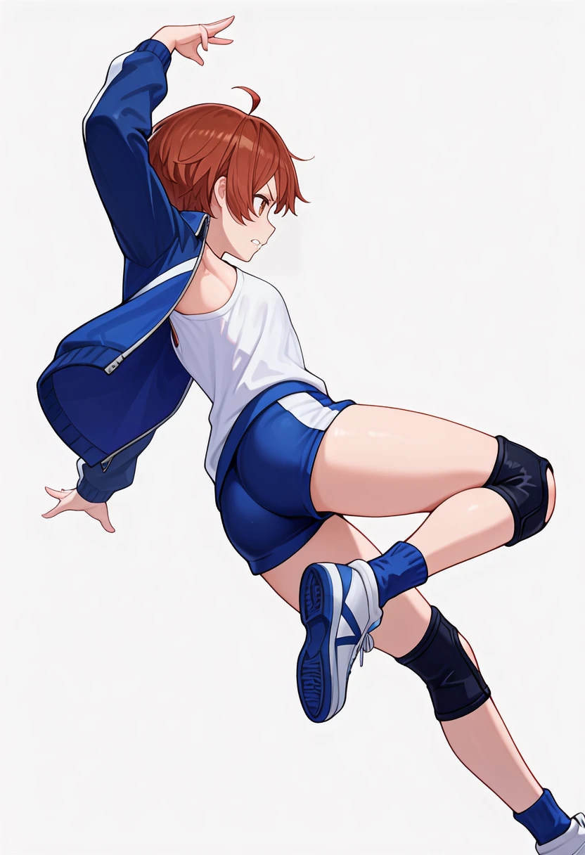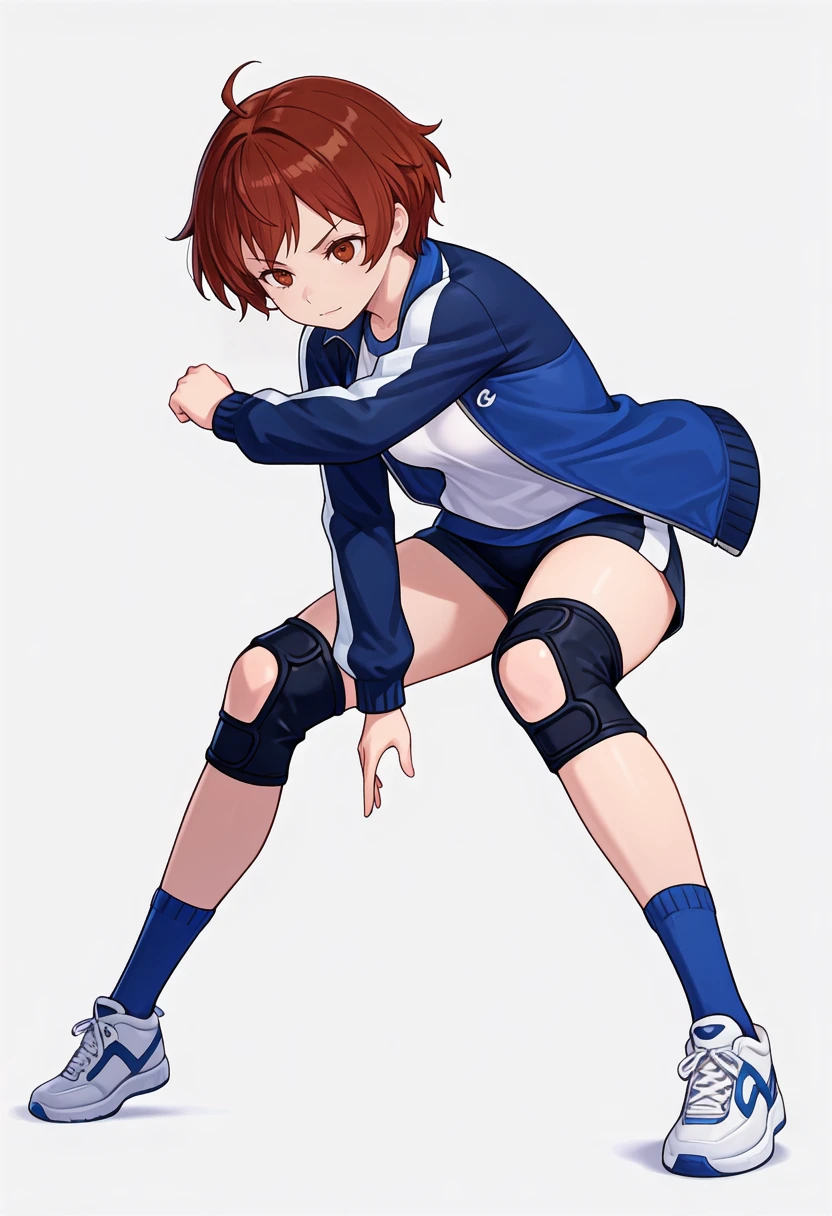 blue track jacket, , long sleeves, white shirt, knee pads,sneakers, socks, short shorts,