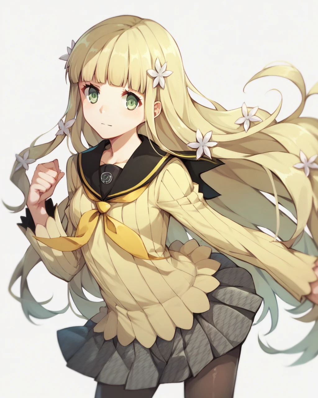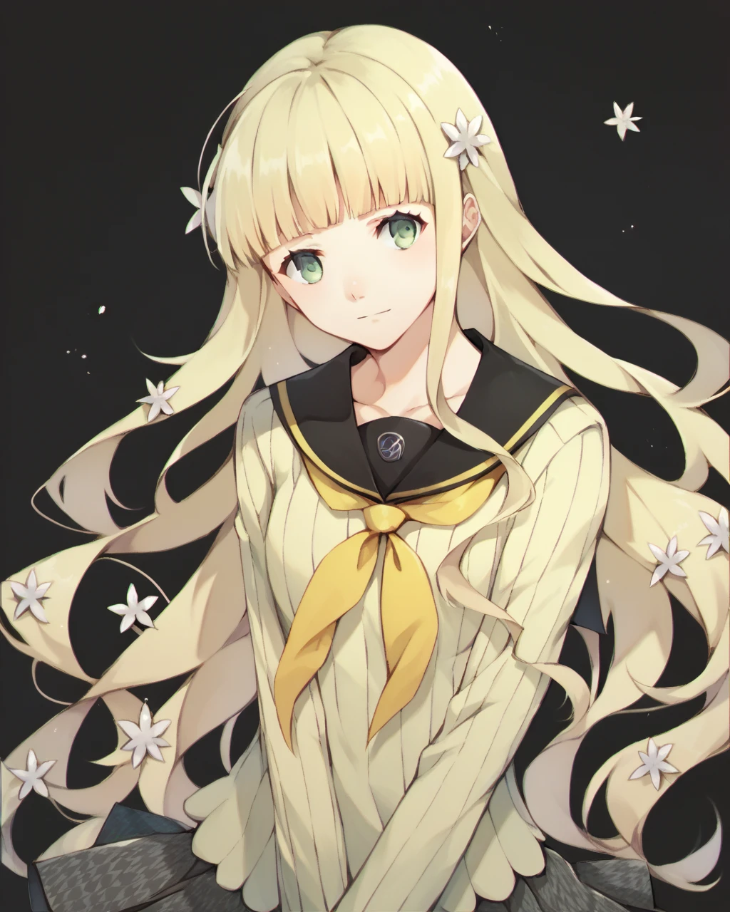 persona q rei,1girl, solo,very long hair, green eyes,blunt bangs,flower,blonde hair, hair ornament, hair flower, yasogami school uniform, school uniform, skirt, serafuku, pantyhose,