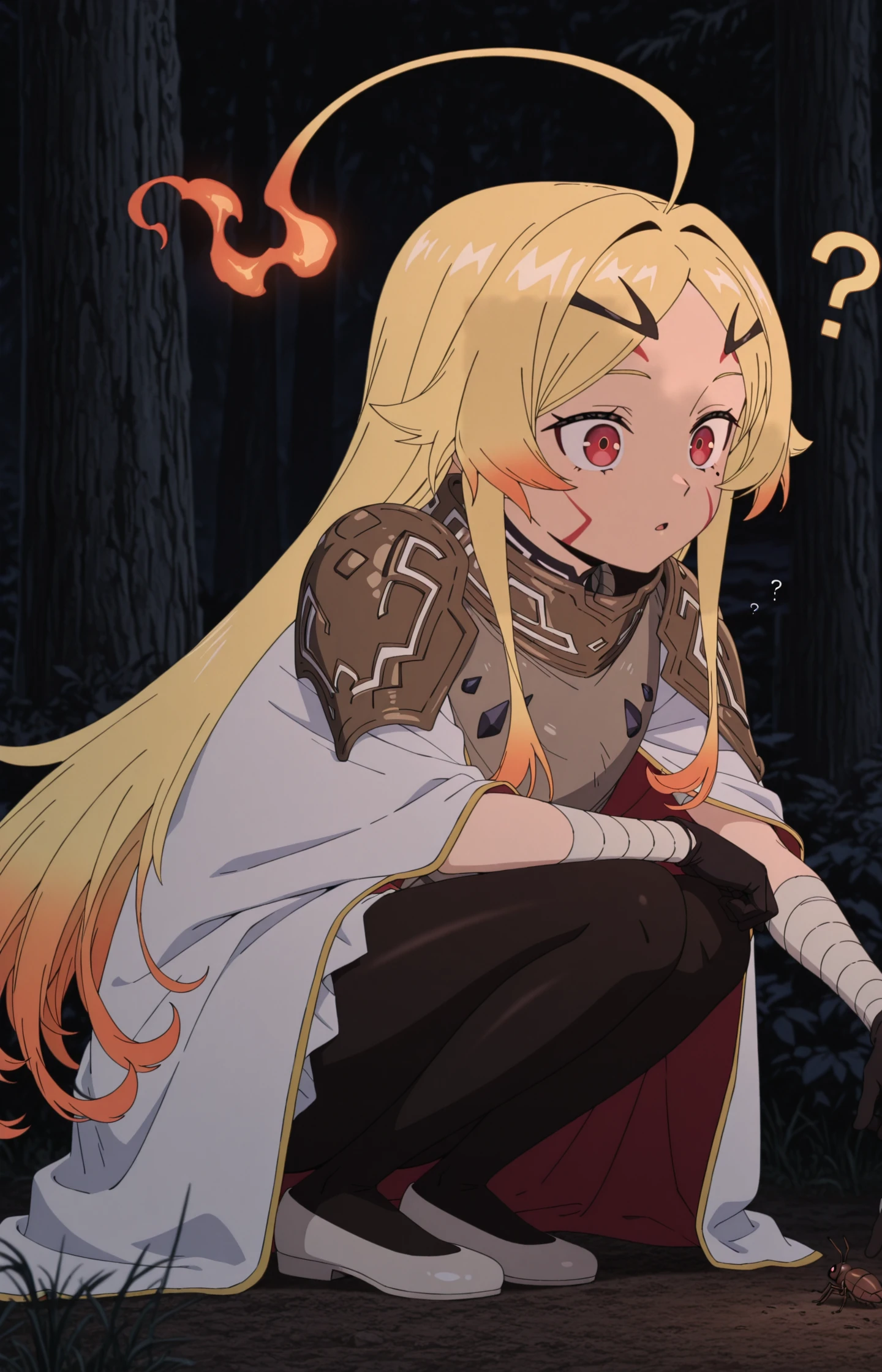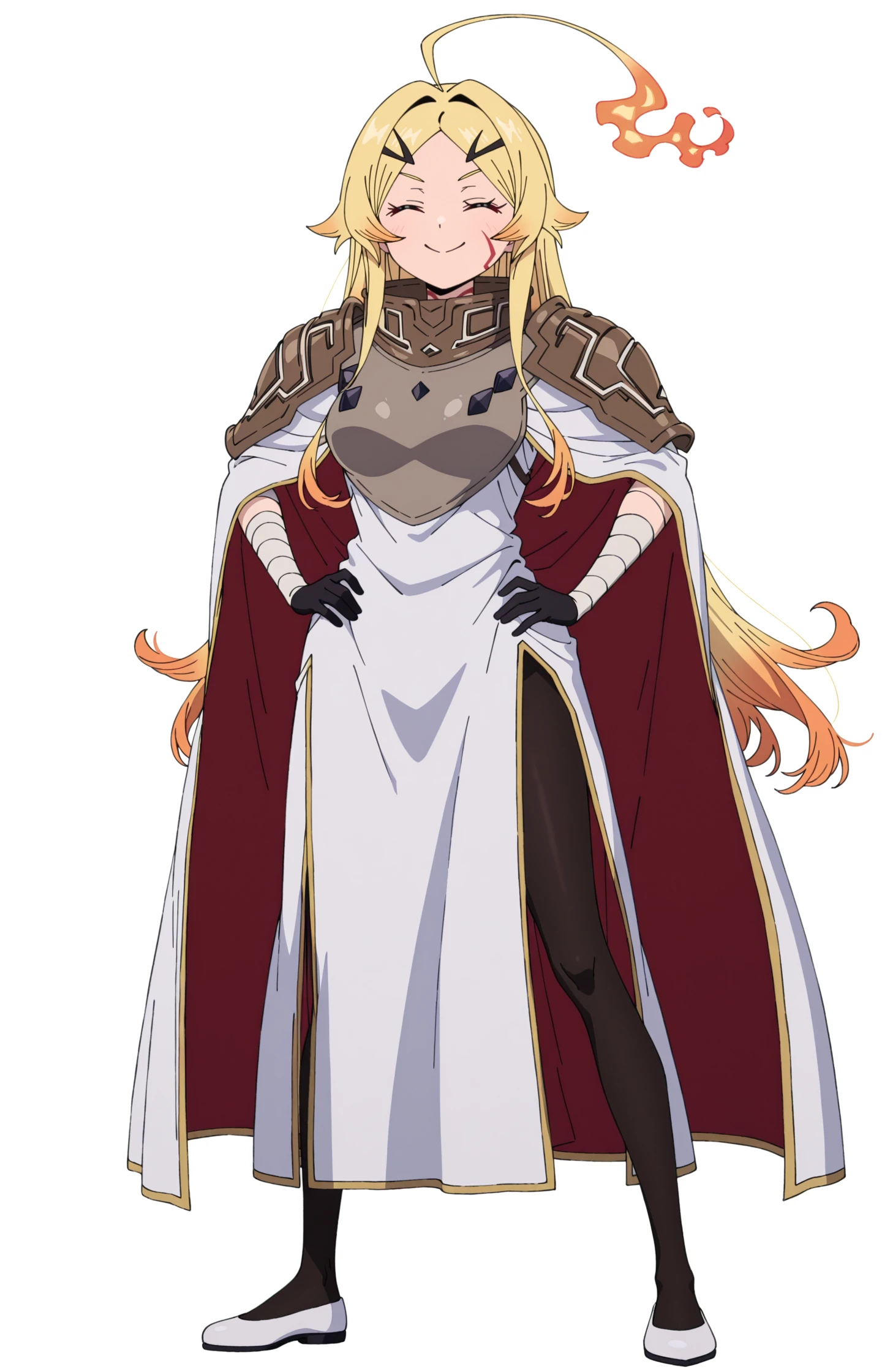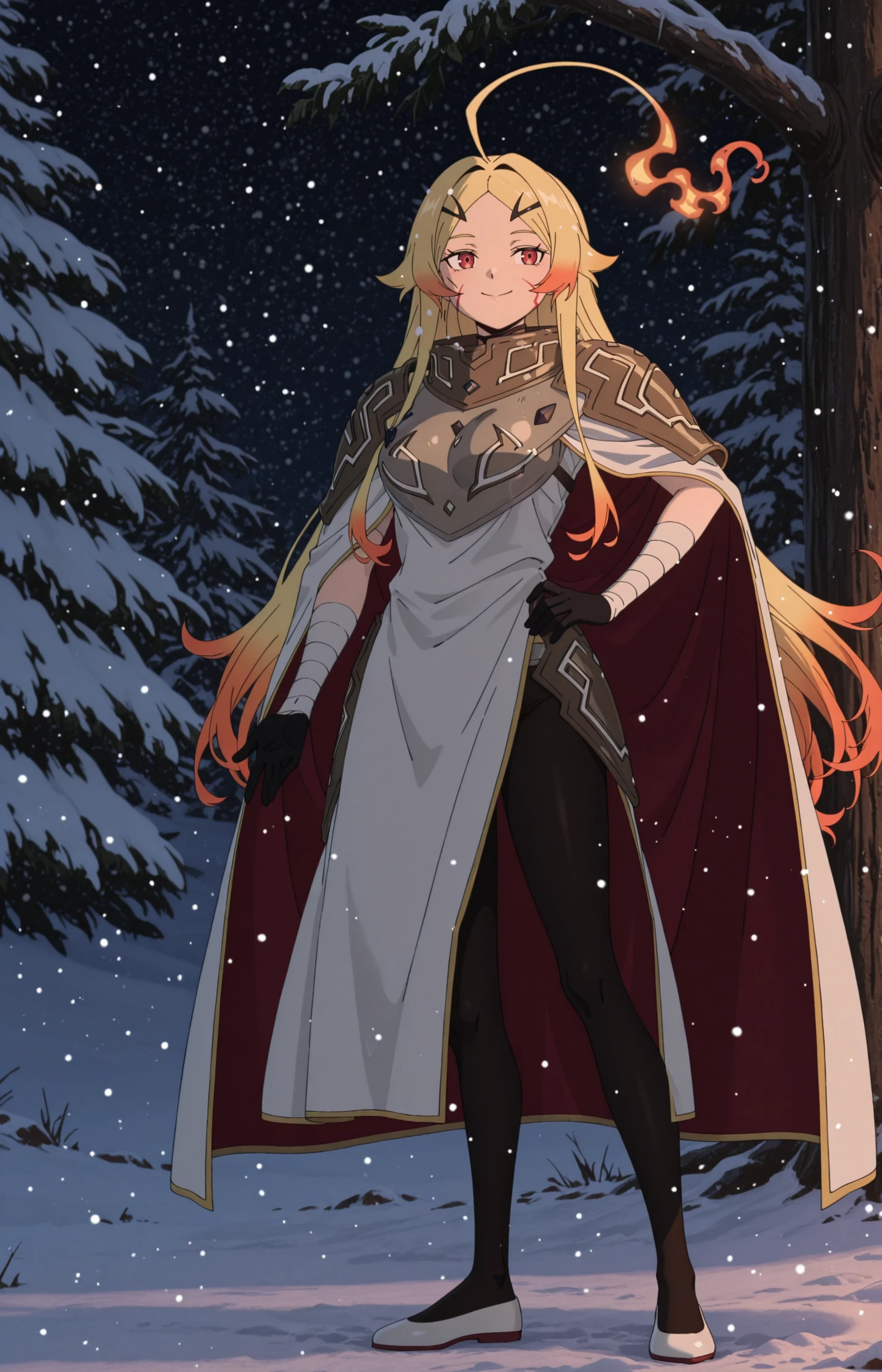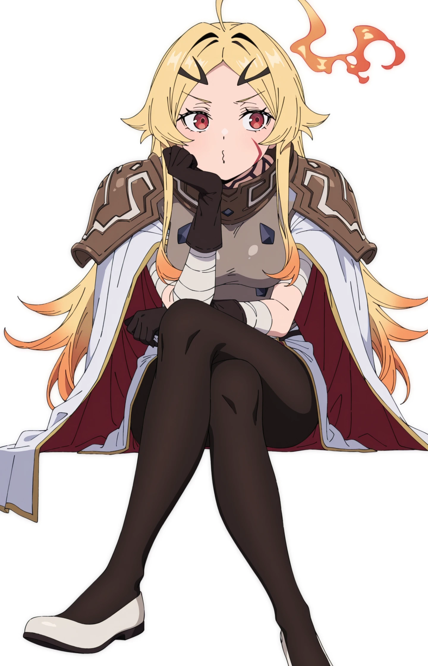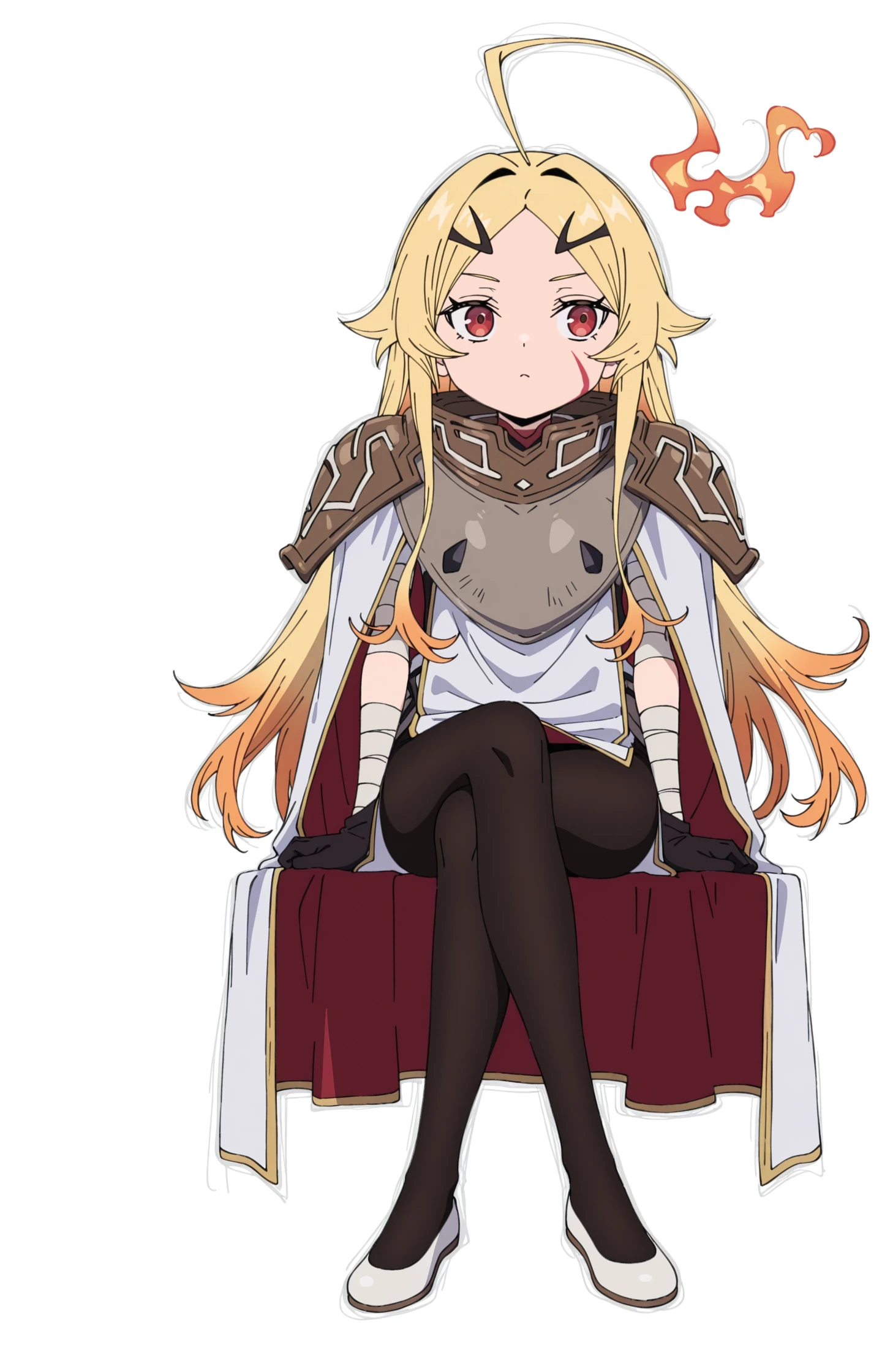 TeorittaSTBHV1, 1girl, blonde hair, ahoge, fire ahoge, fiery hair, red eyes, facial mark, hair ornament, gradient hair, multicolored hair, hairclip, armor,shoulder armor, cloak, bandaged arms, black gloves, black leggings, pantyhose, white shoes, flatsExtra: add '' anime screencap '' To get that style