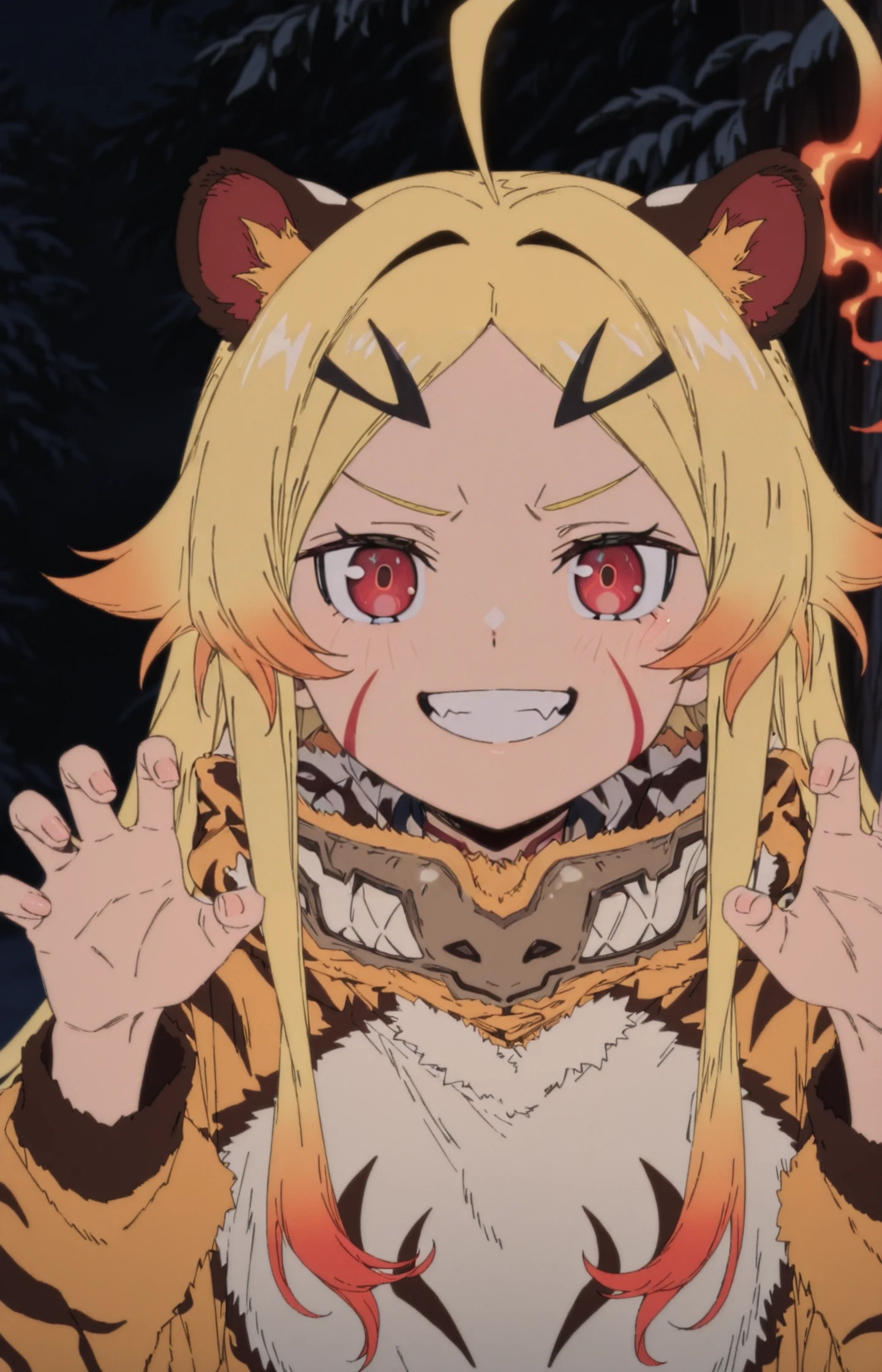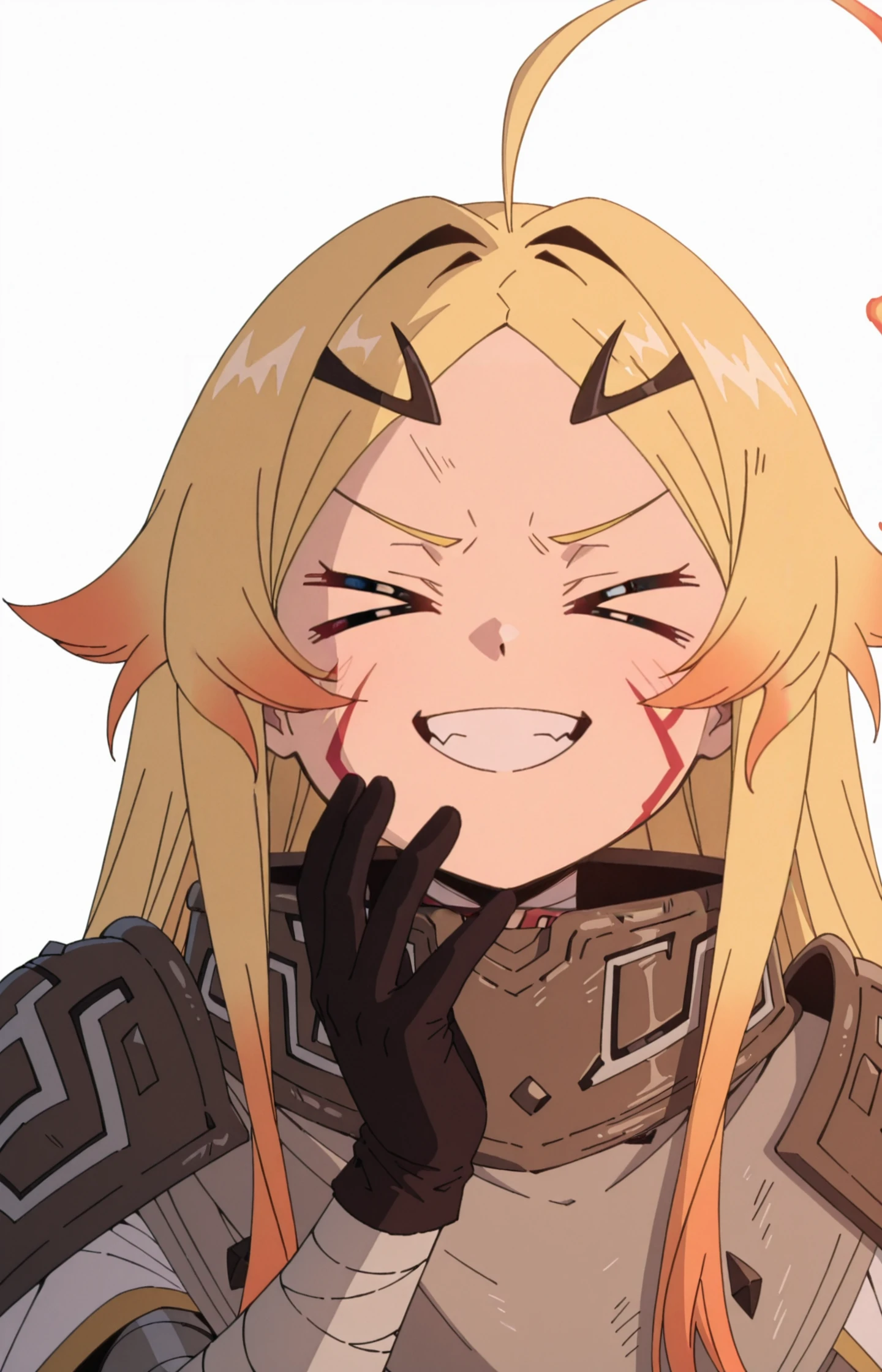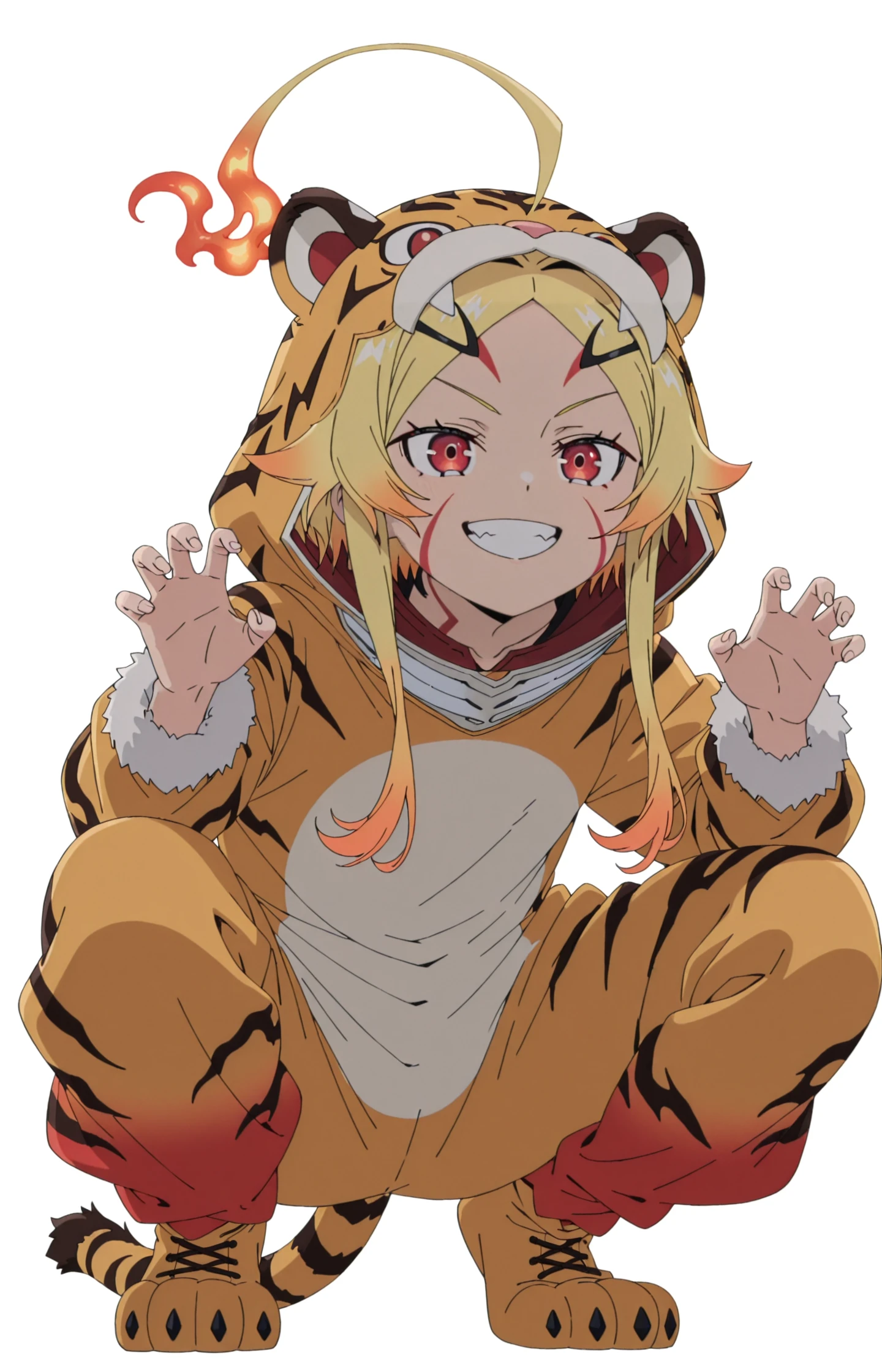 TeorittaSTBHV1, 1girl, blonde hair, ahoge, fire ahoge, fiery hair, red eyes, facial mark, hair ornament, gradient hair, multicolored hair, hairclipDefault: