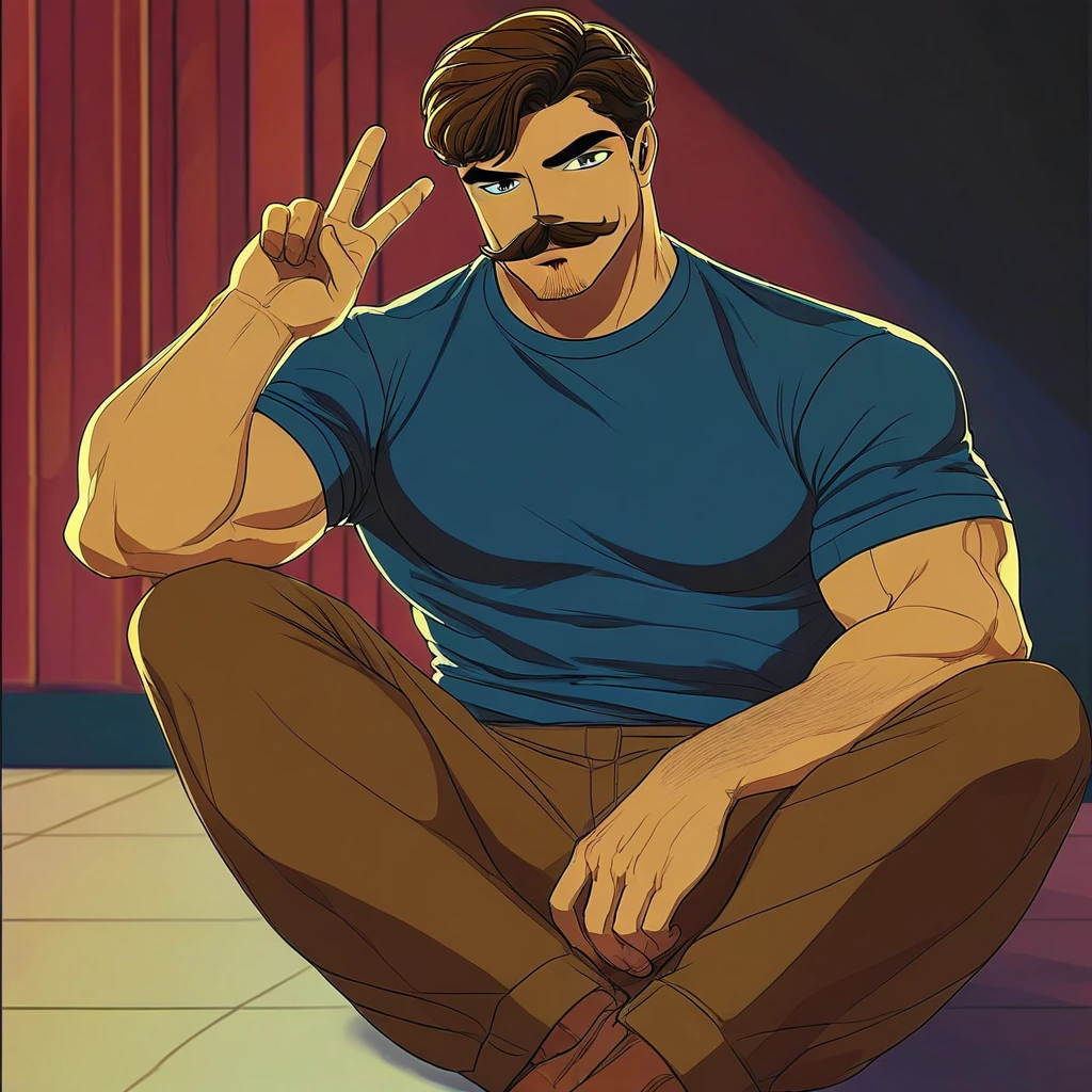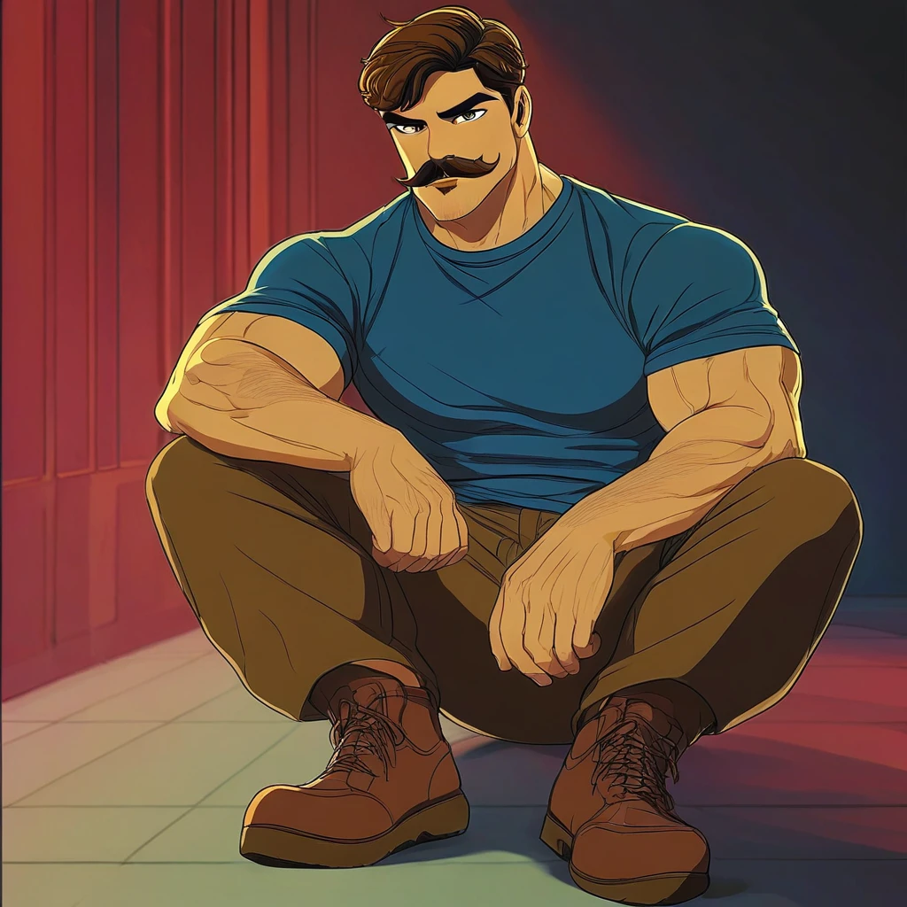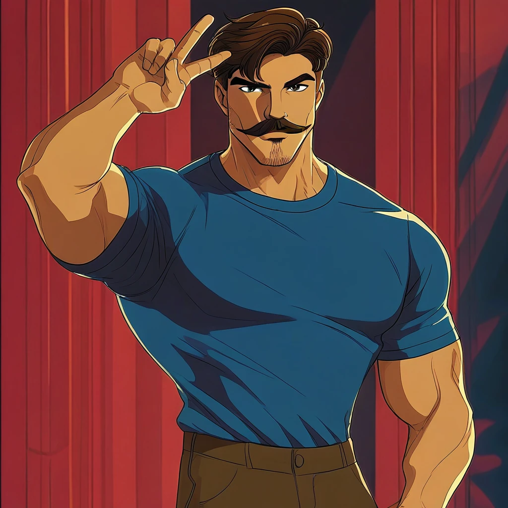 Trigger words (recommended): brown hair, short hair, brown hair, facial hair, mustache, red shirt