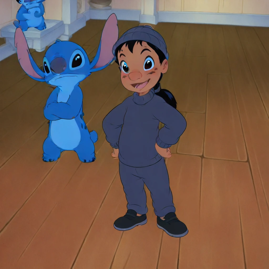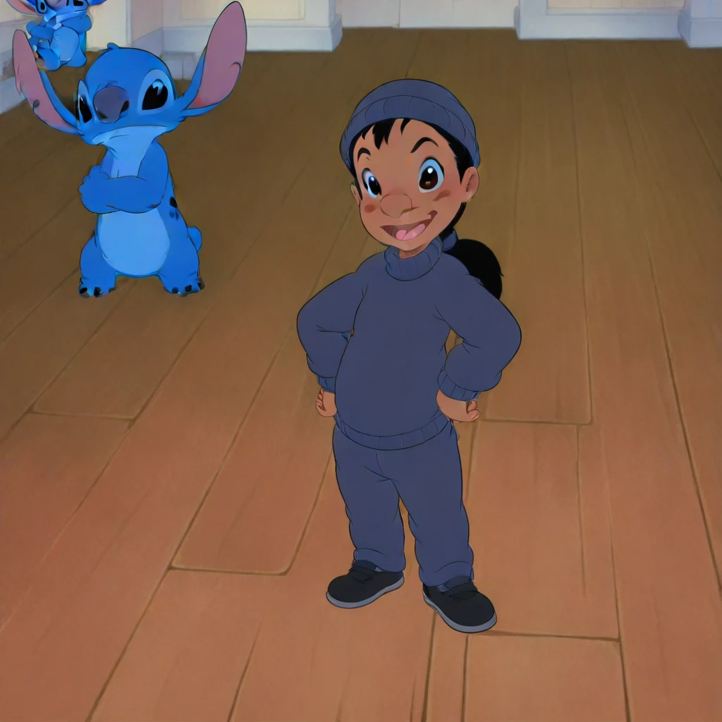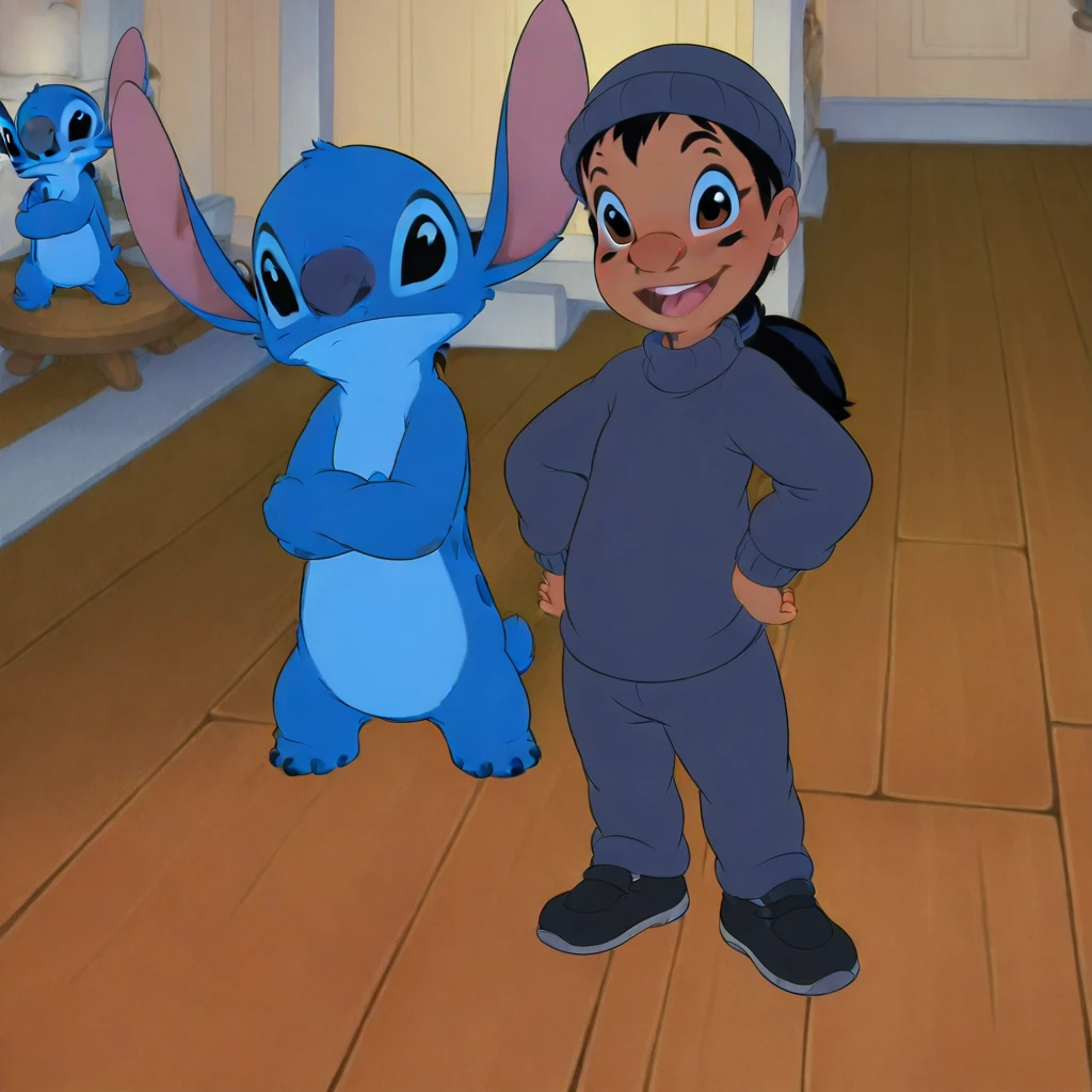 1girl, lilo pelekai, brown eyes ,dark skinned female, black long hair ,gray sweatshirt, gray sweatpants, gray beanie hat, black shoes, solo