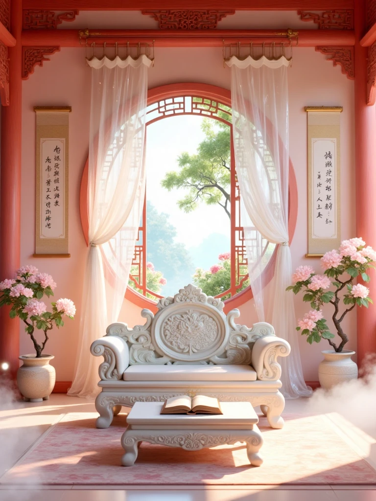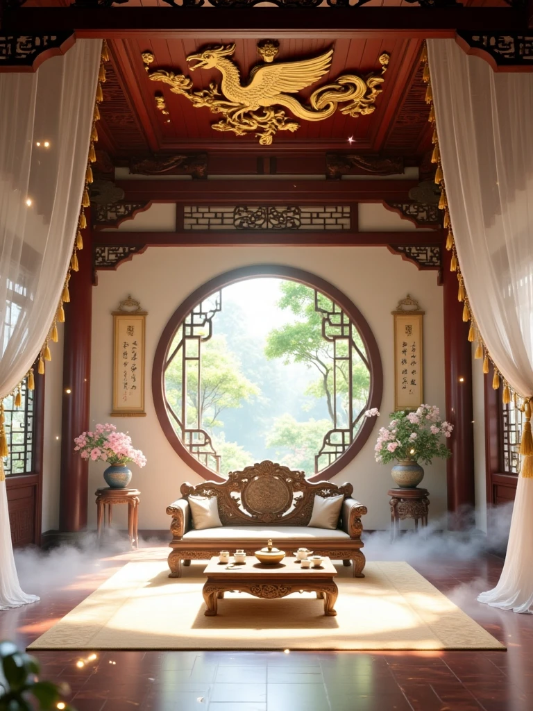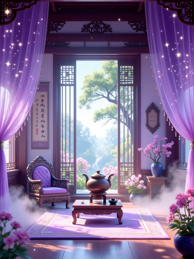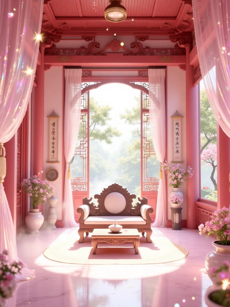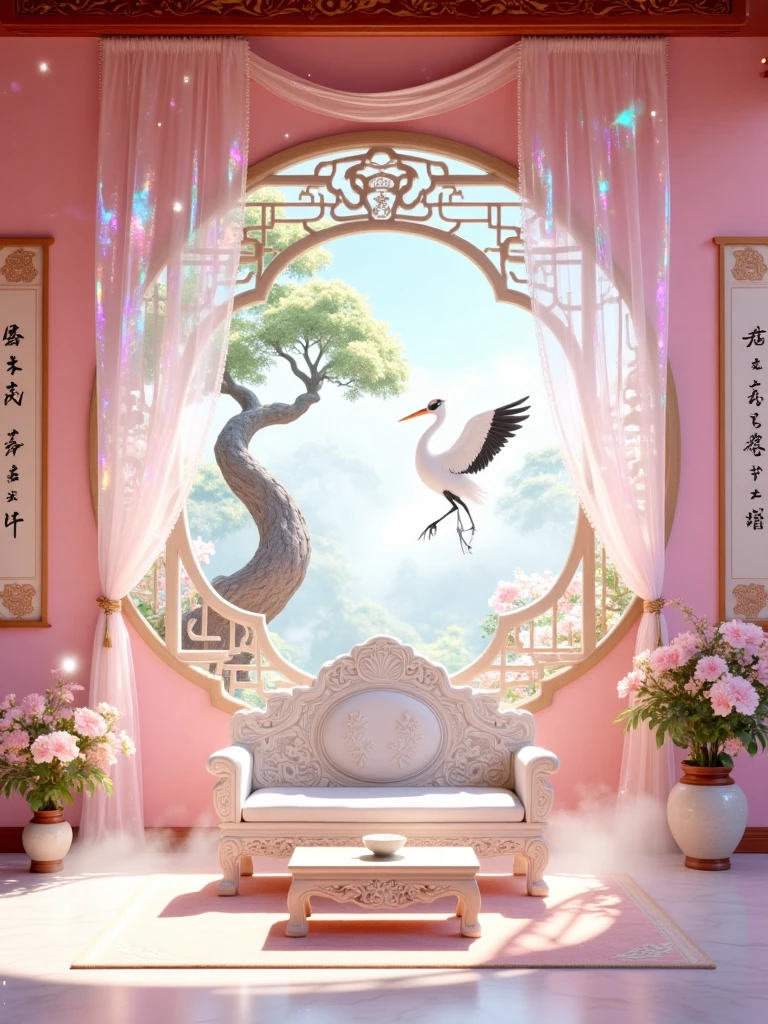 Oriental fantasy interior scenes, pastel - colored curtains flow, ancient - style furniture glows softly, 窗外有 crane - like clouds, with sparkling mist in the air.