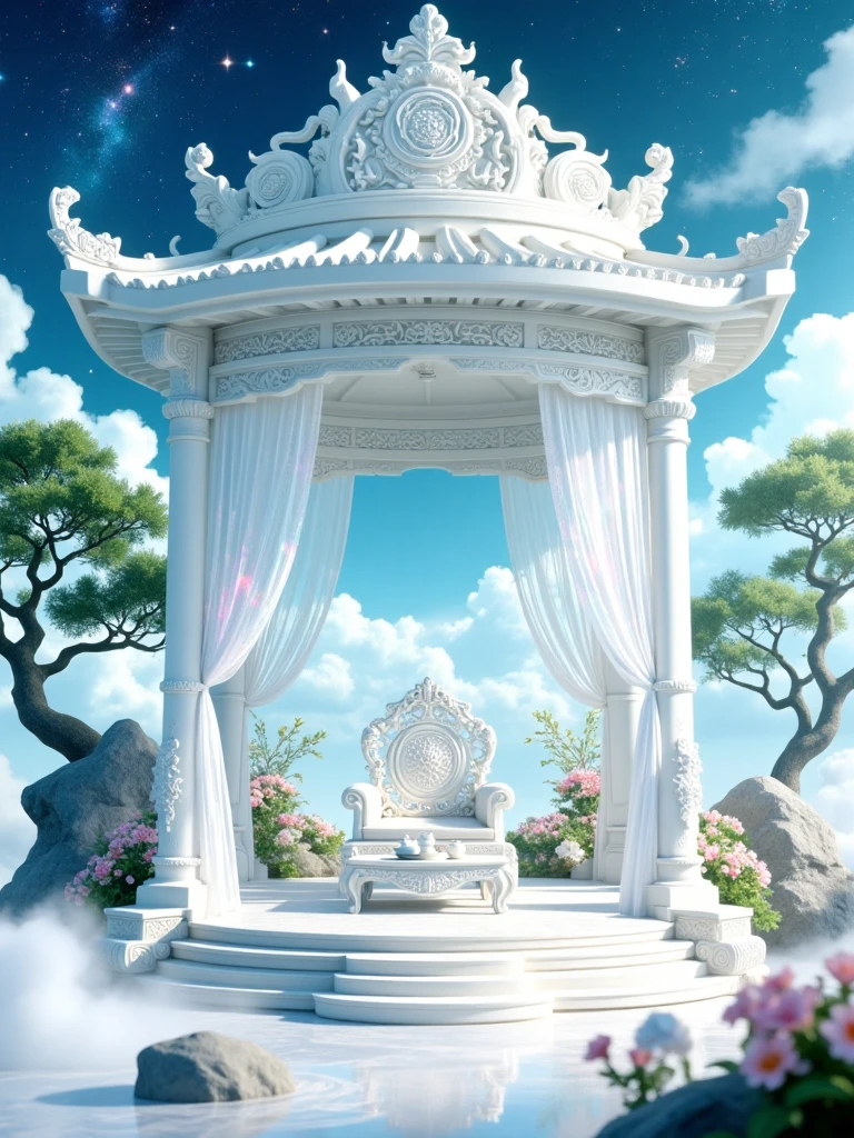 Oriental fantasy interior scenes, light - blue themed, a crystal - like chandelier, a simple chair, the window reveals a cloud - sea scene.