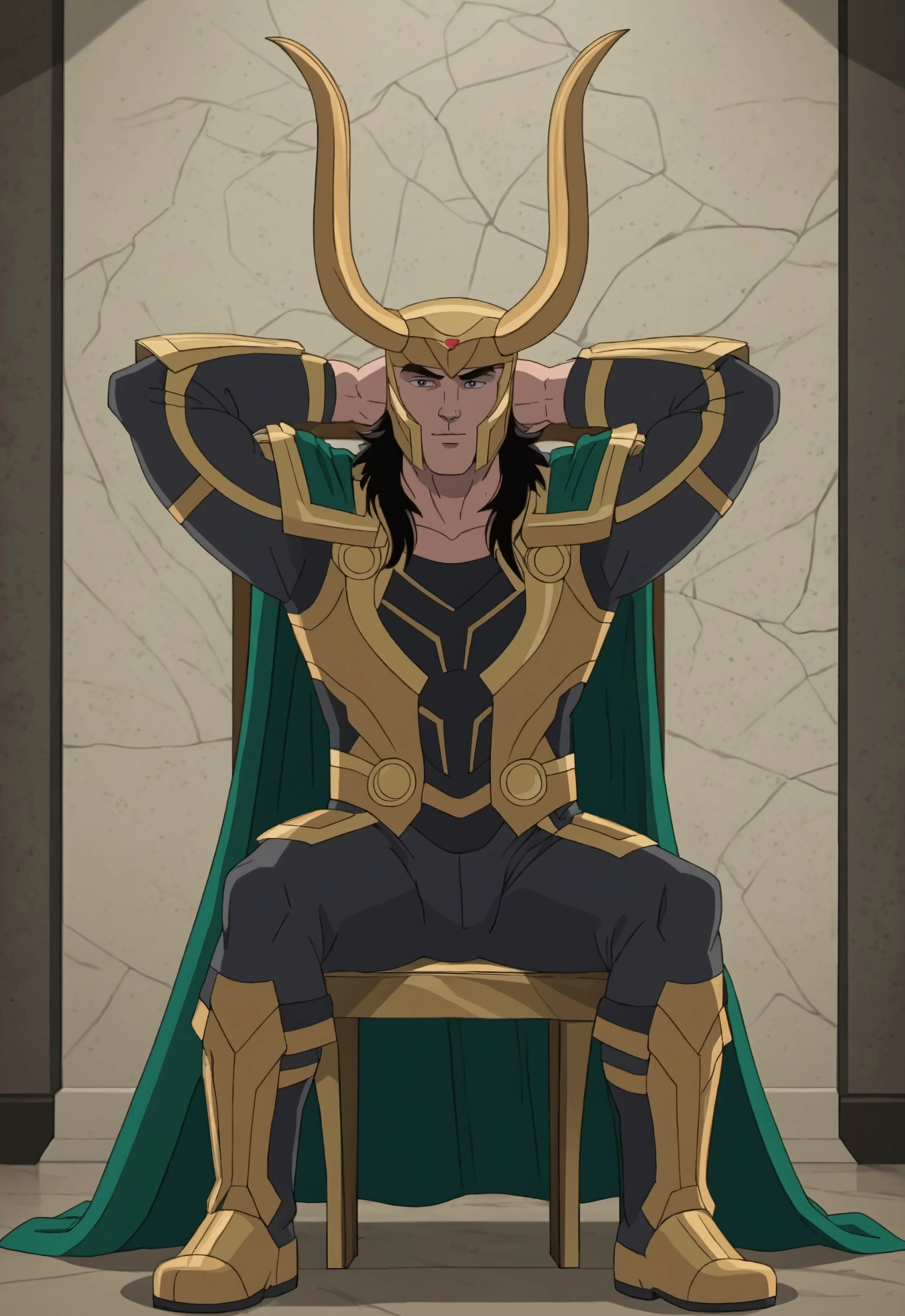 MarvelALoki, horned helmet, yellow helmet, black hair, cape, armor