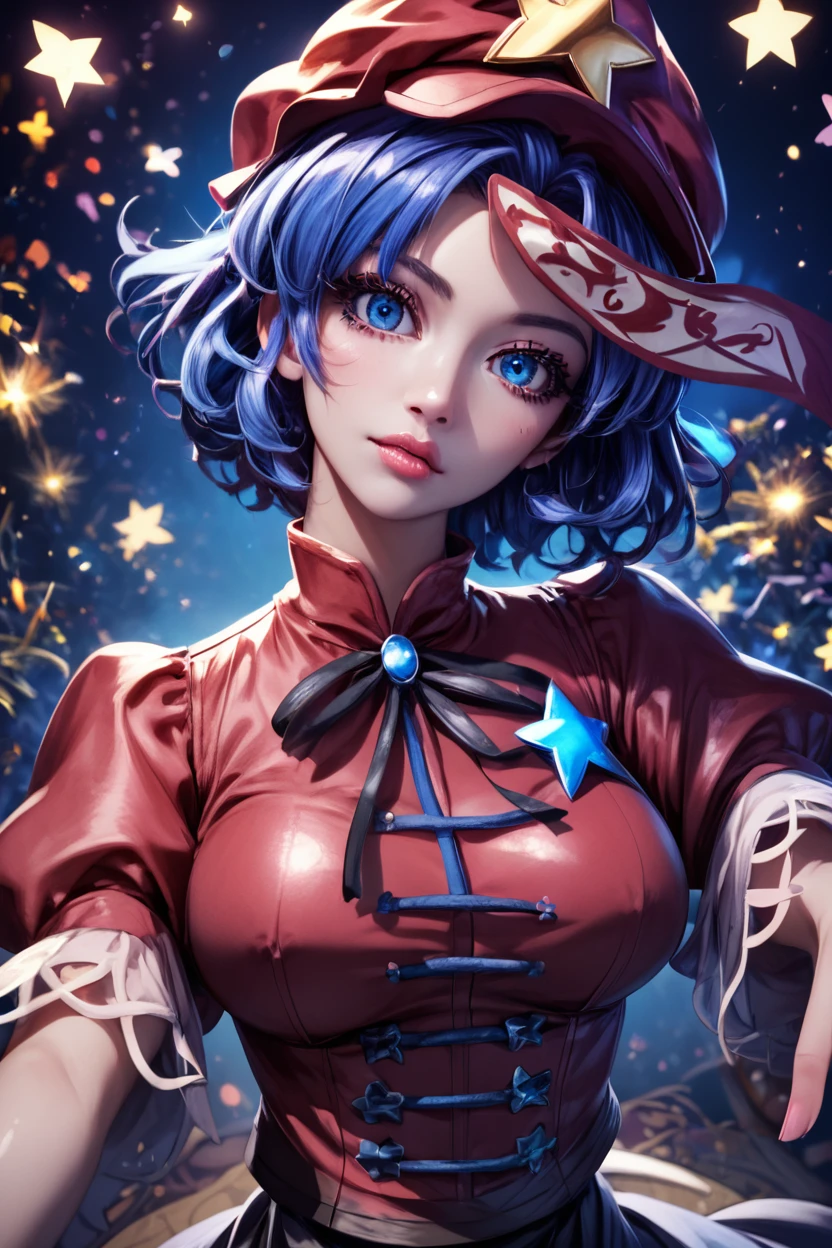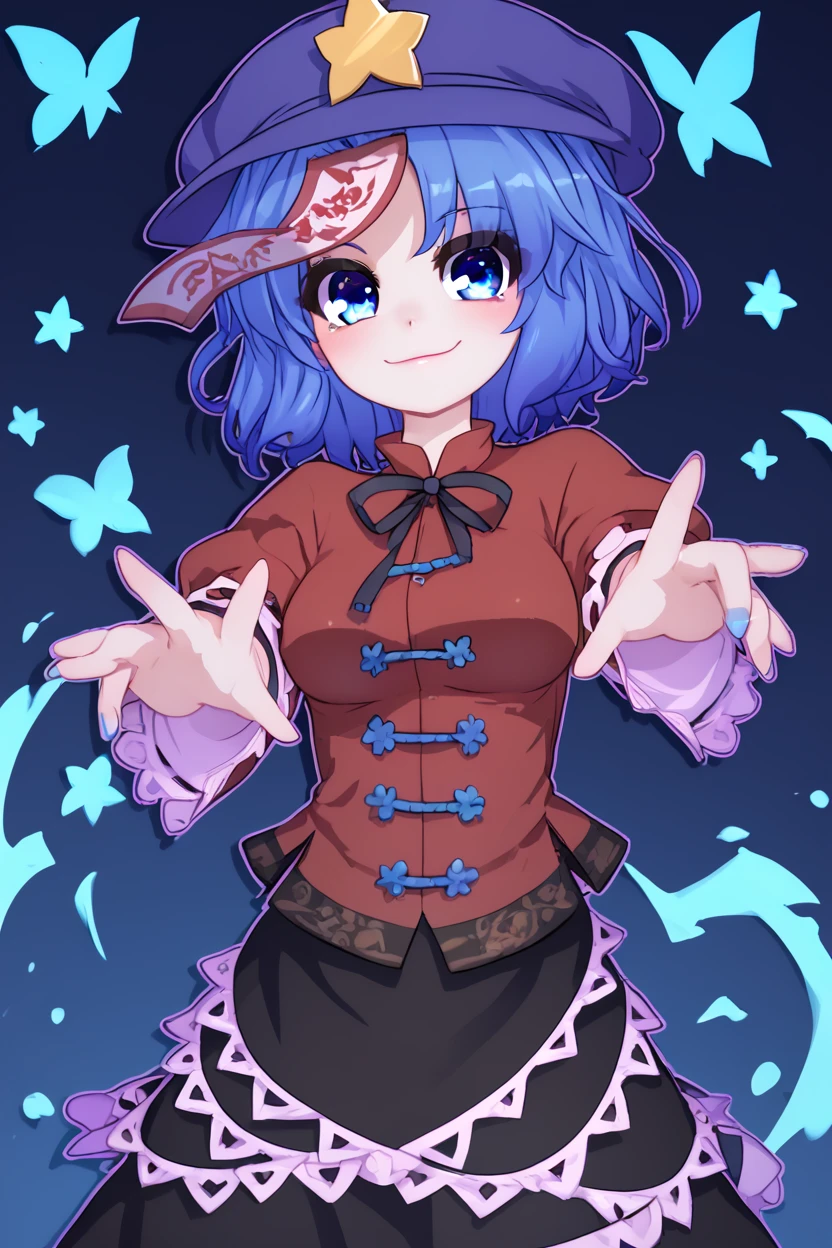 zzMiyako, blue eyes, blue hair, short hair, jiangshi, pale skin, hat ornament, ofuda, star hat ornament, zombie pose, outstretched arms, black skirt, shirt,