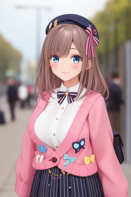 suzuhara lulu, beret, pink cardigan, white shirt, vertical-striped skirt, black pantyhose, striped pantyhose