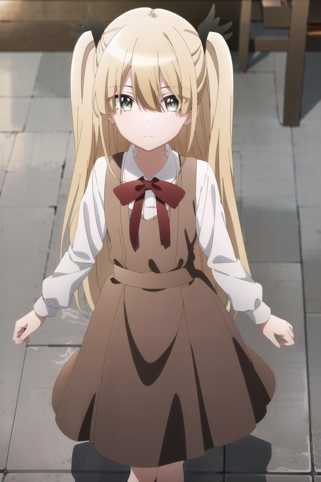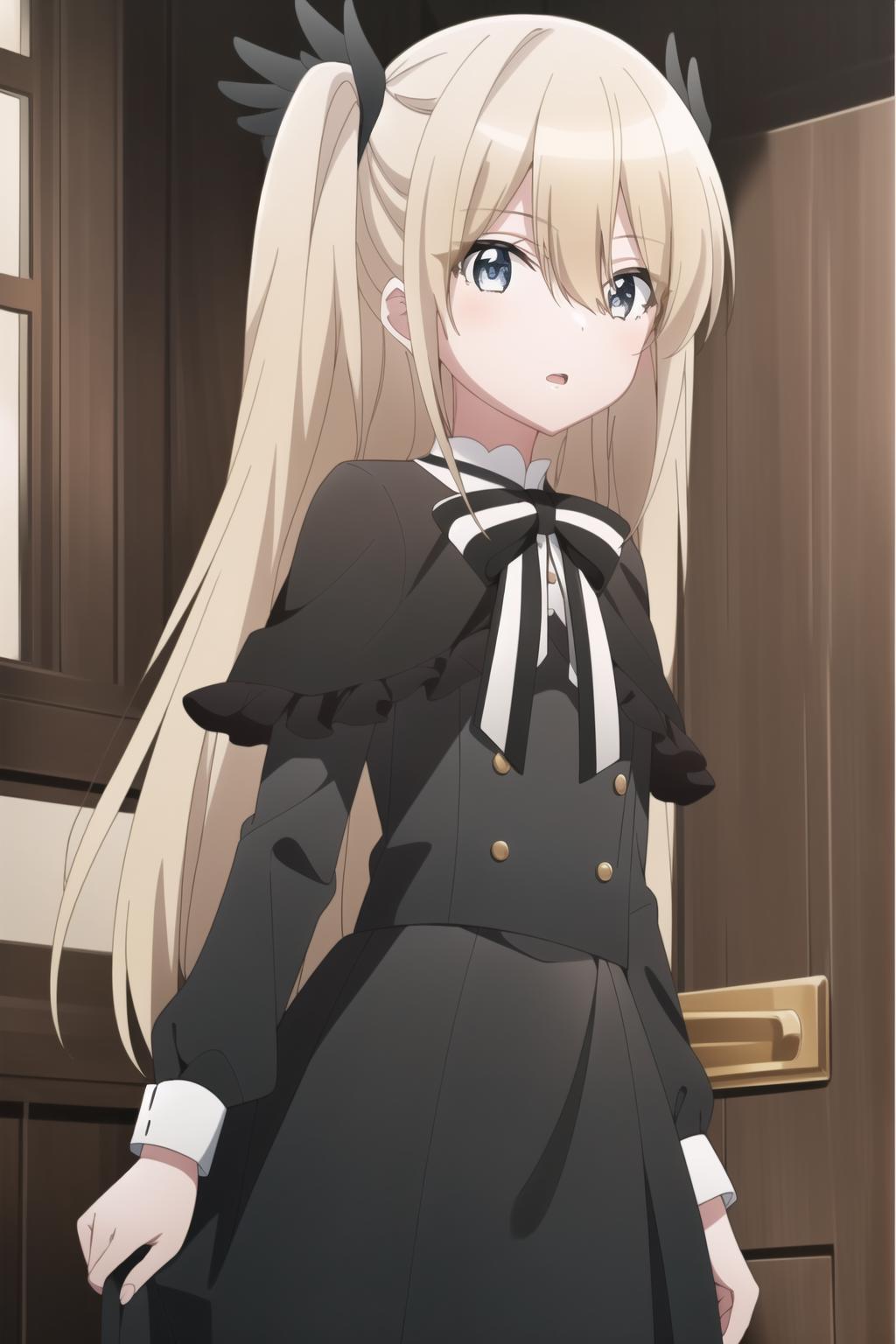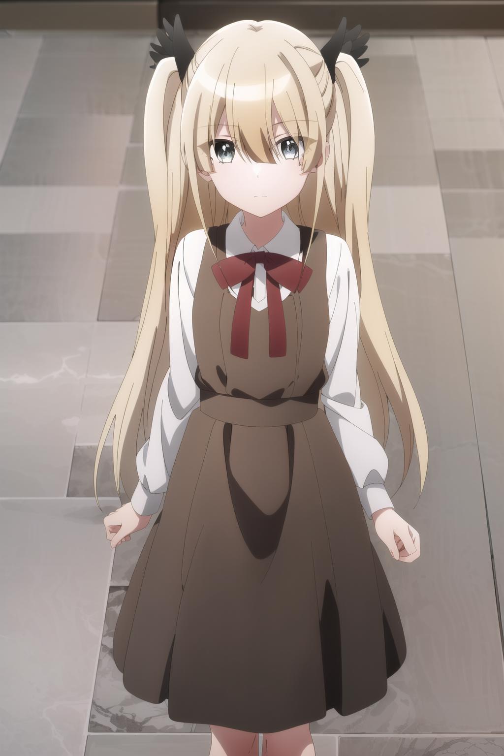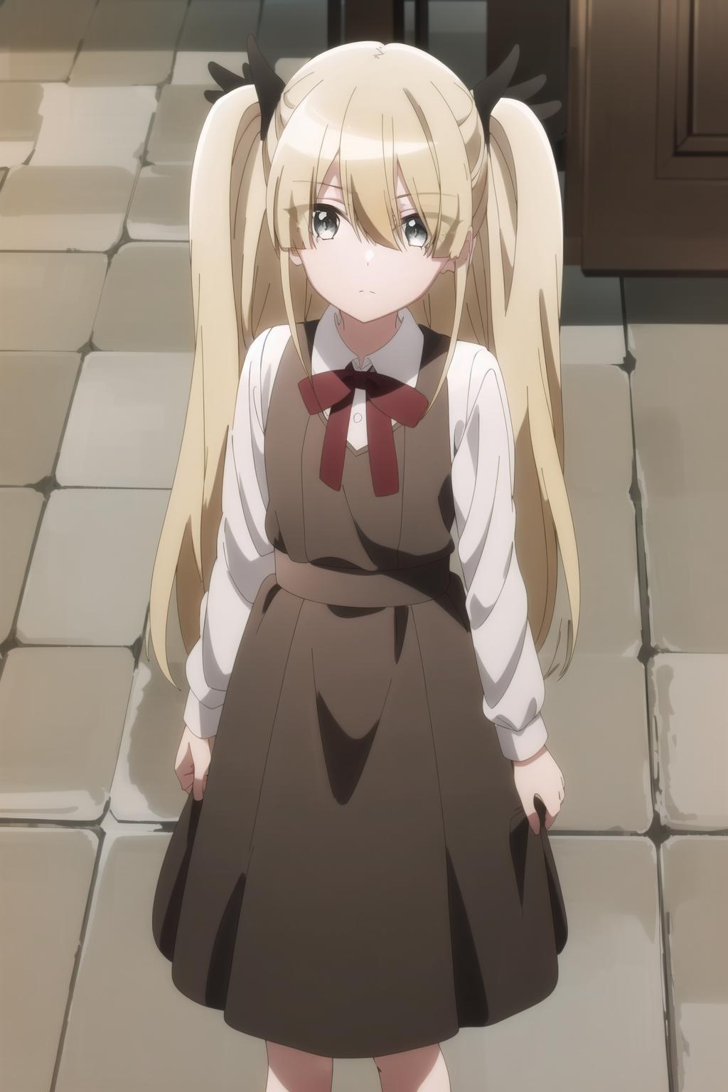 blunt bangs, twintails, black ribbon, eyes visible through hair, black dress, brown dressPlease ask my permission to use on generation services. You have to at least credit me.