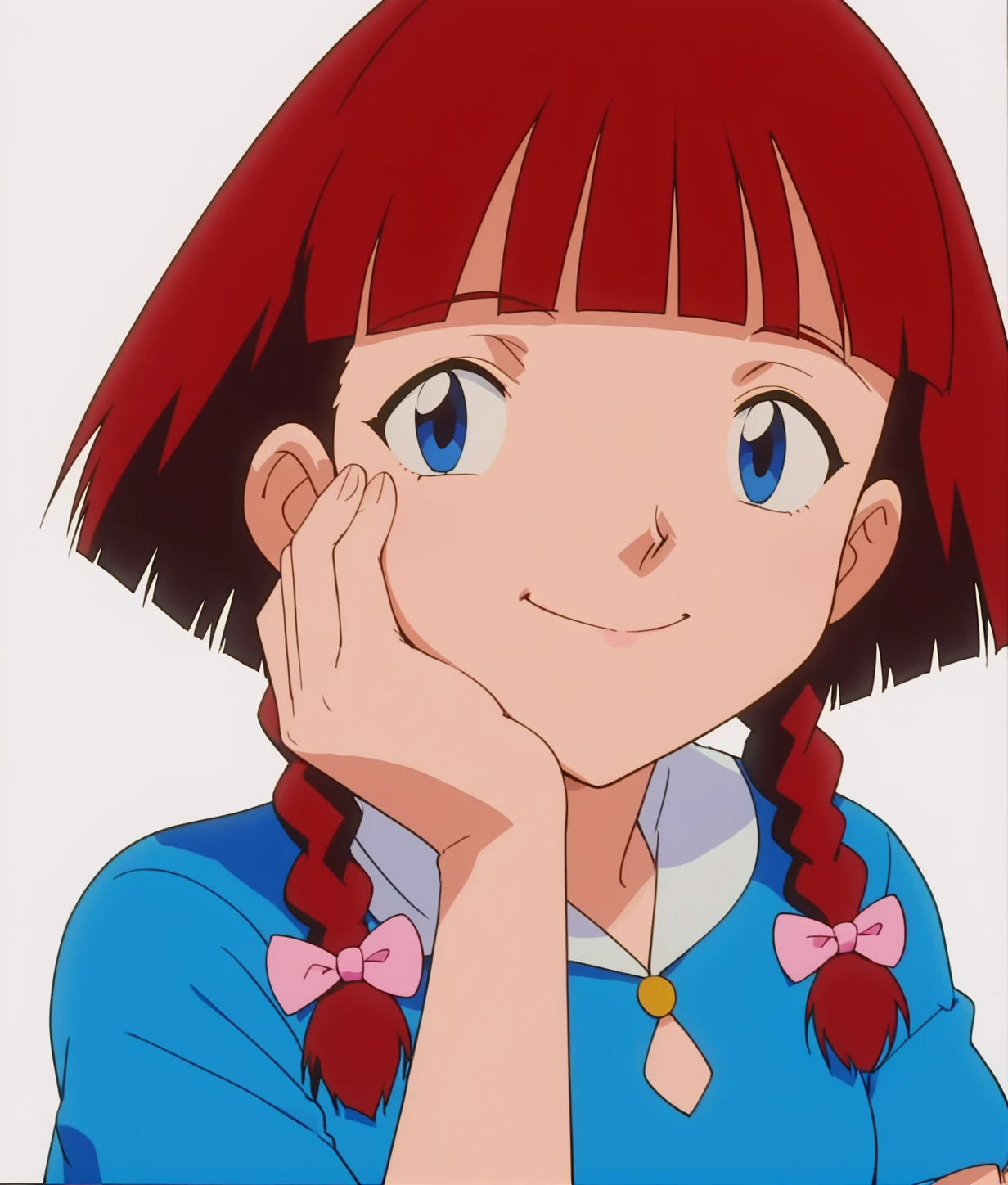 pkmkay, twin braids, blue eyes, bow, bangs, red hair, hair bow, blunt bangs, shorts, shirt, short sleeves
