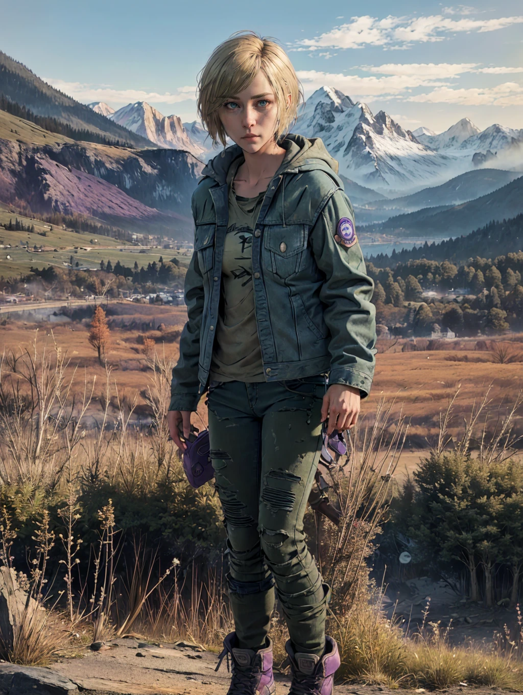 1girl, blonde hair, closed mouth, denim jacket, dirty face, layered sleeves, long sleeves, looking at viewer, brown boots, purple shoe laces, realistic, shirt, short hair, solo, violettwd, green eyes, beautiful eyes, masterpiece, high res, pants <lora:VioletV1.1:0.8>