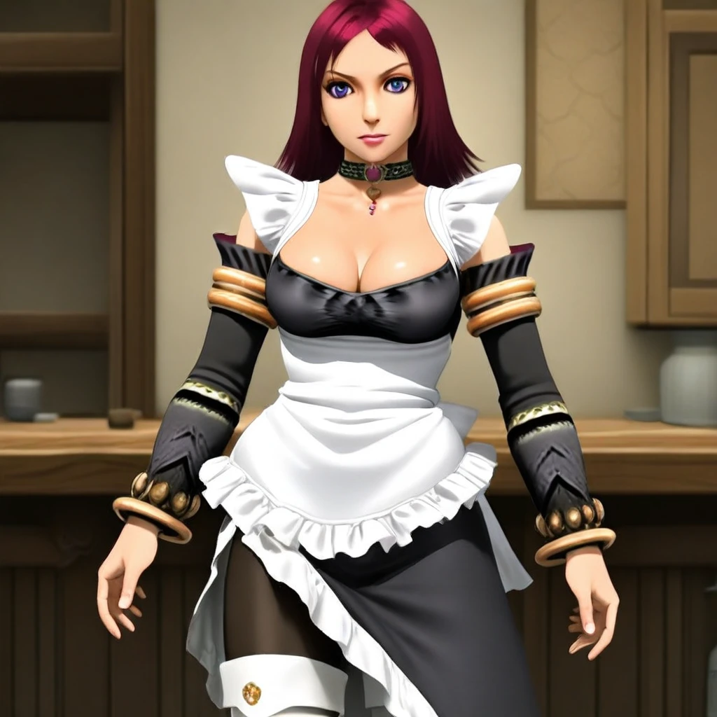 choker, black dress, frills, layered skirt, apron, detached sleeves, armlets, bracelets, thighhighs, pantyhose, boots,