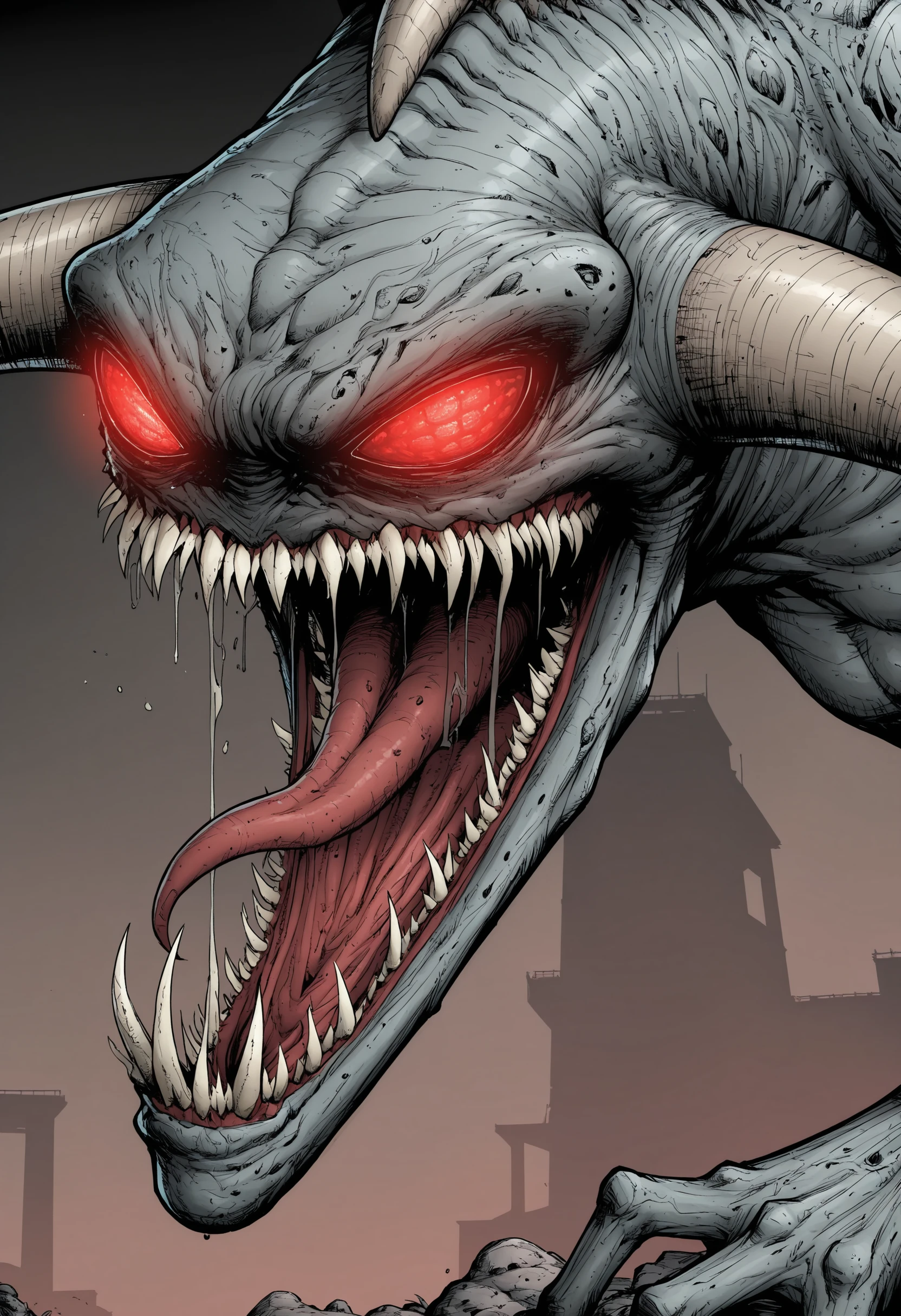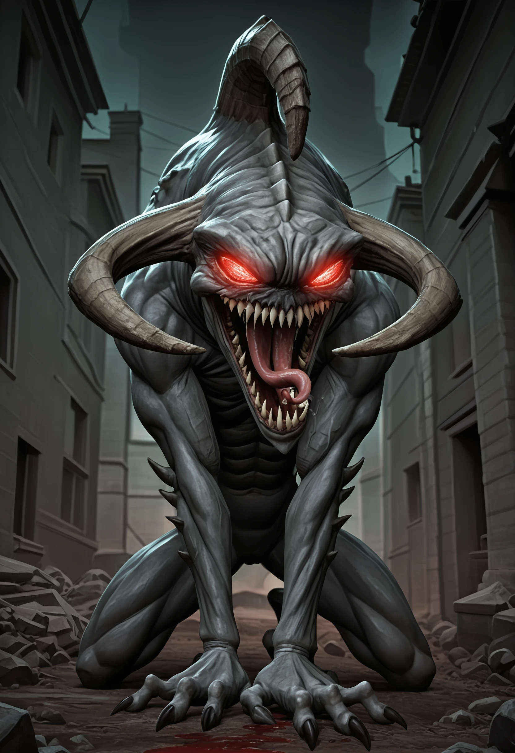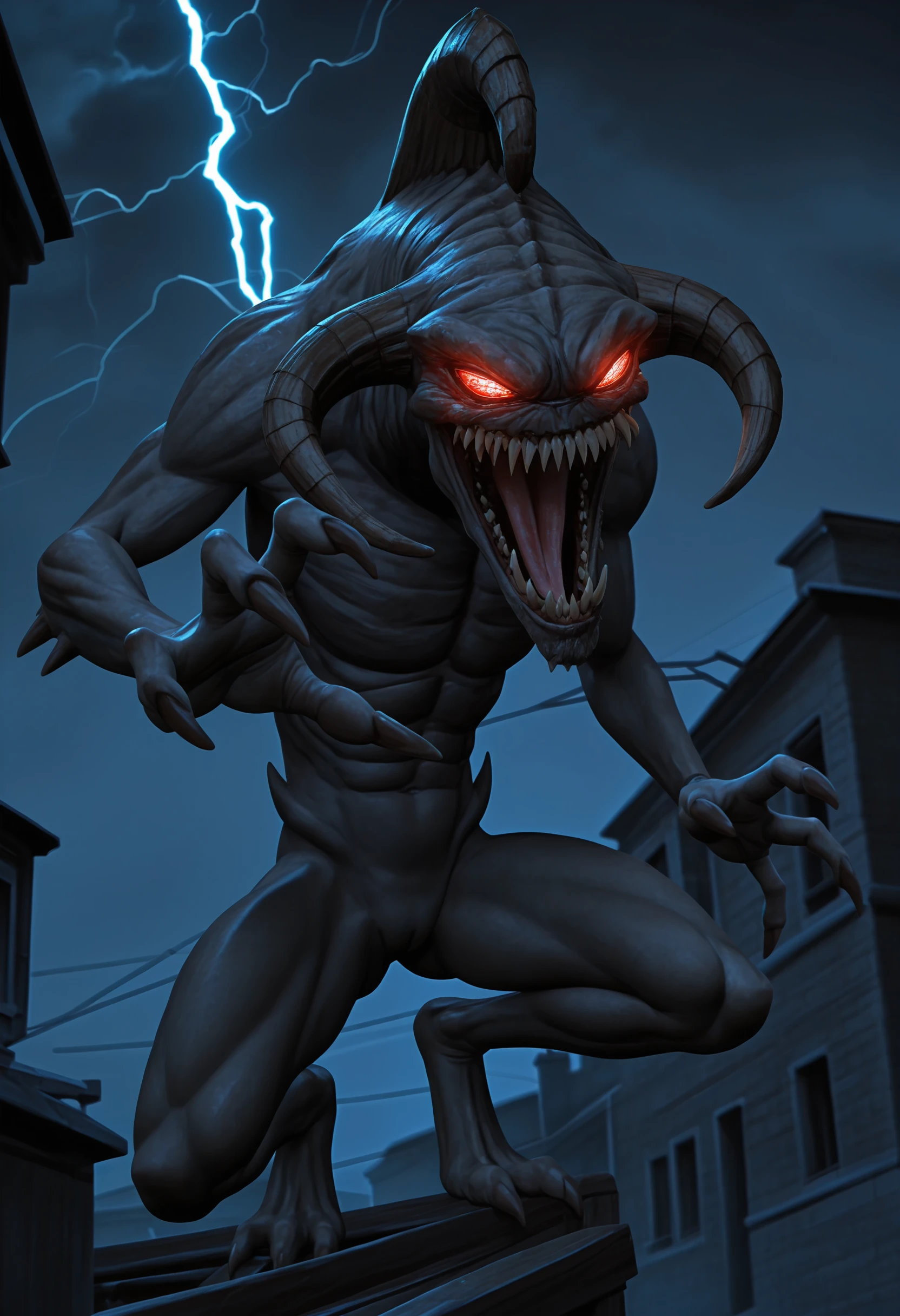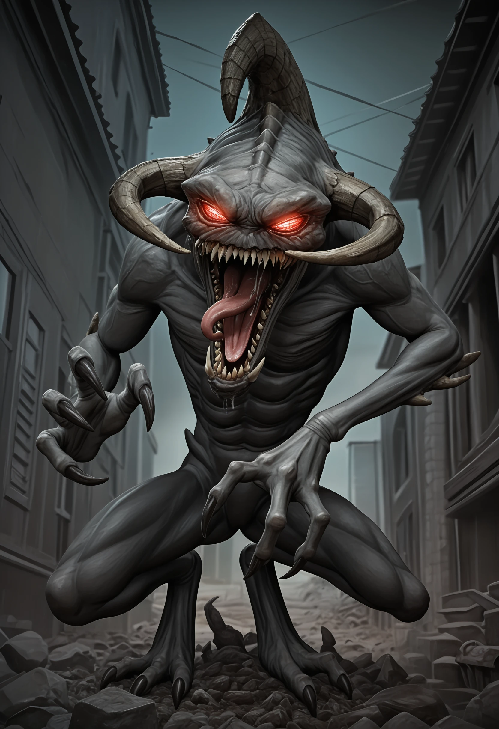 monster, sharp teeth, red eyes, claws, horns, tongue, glowing eyes
