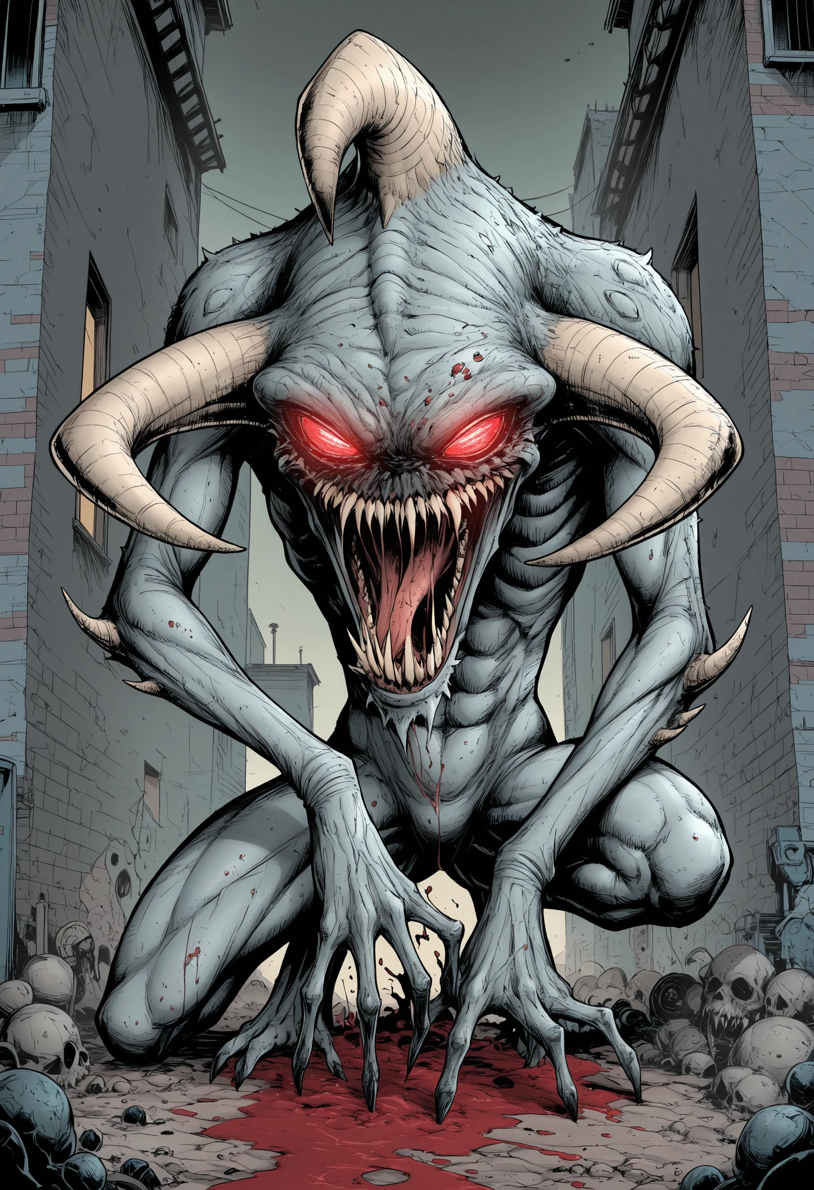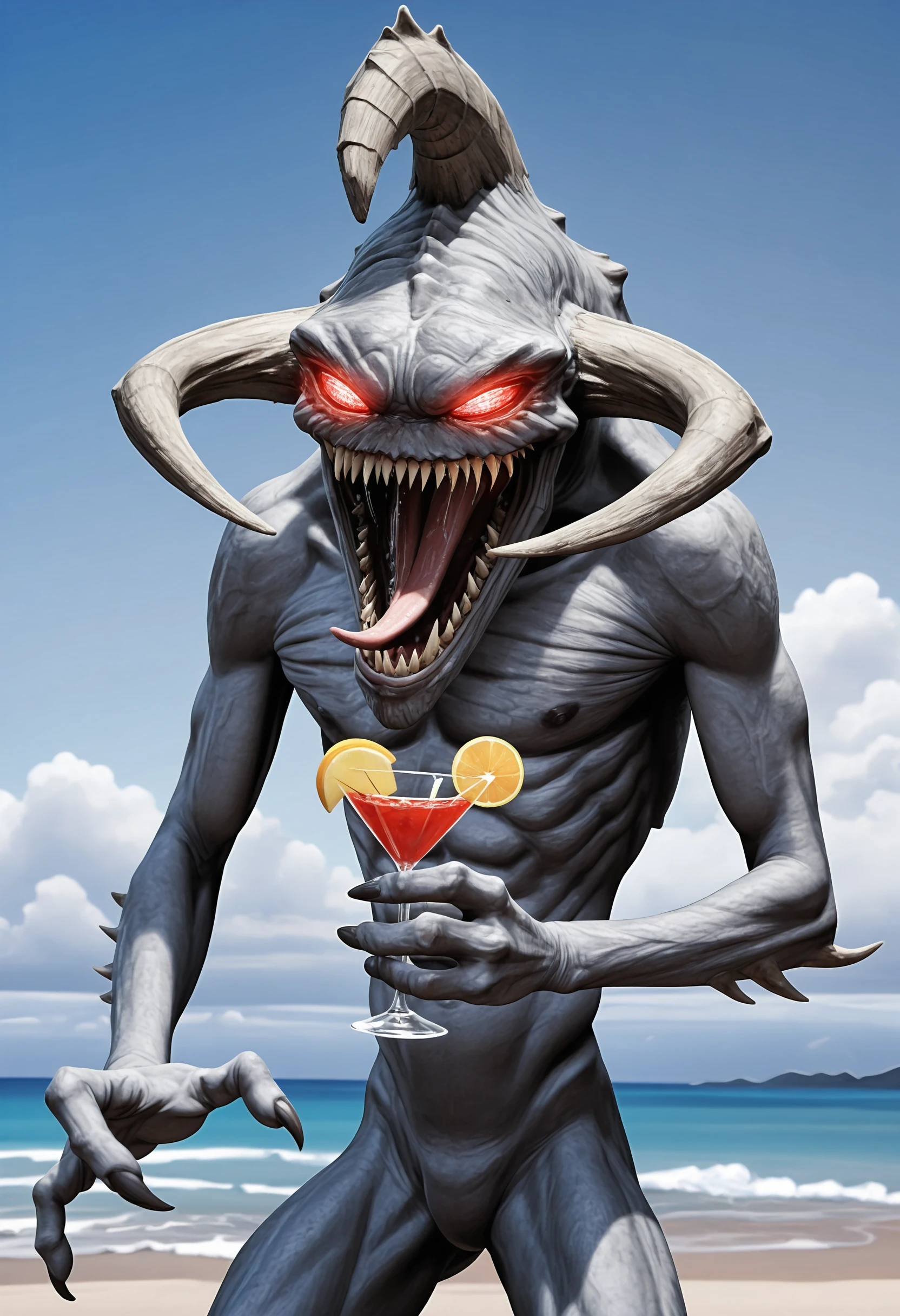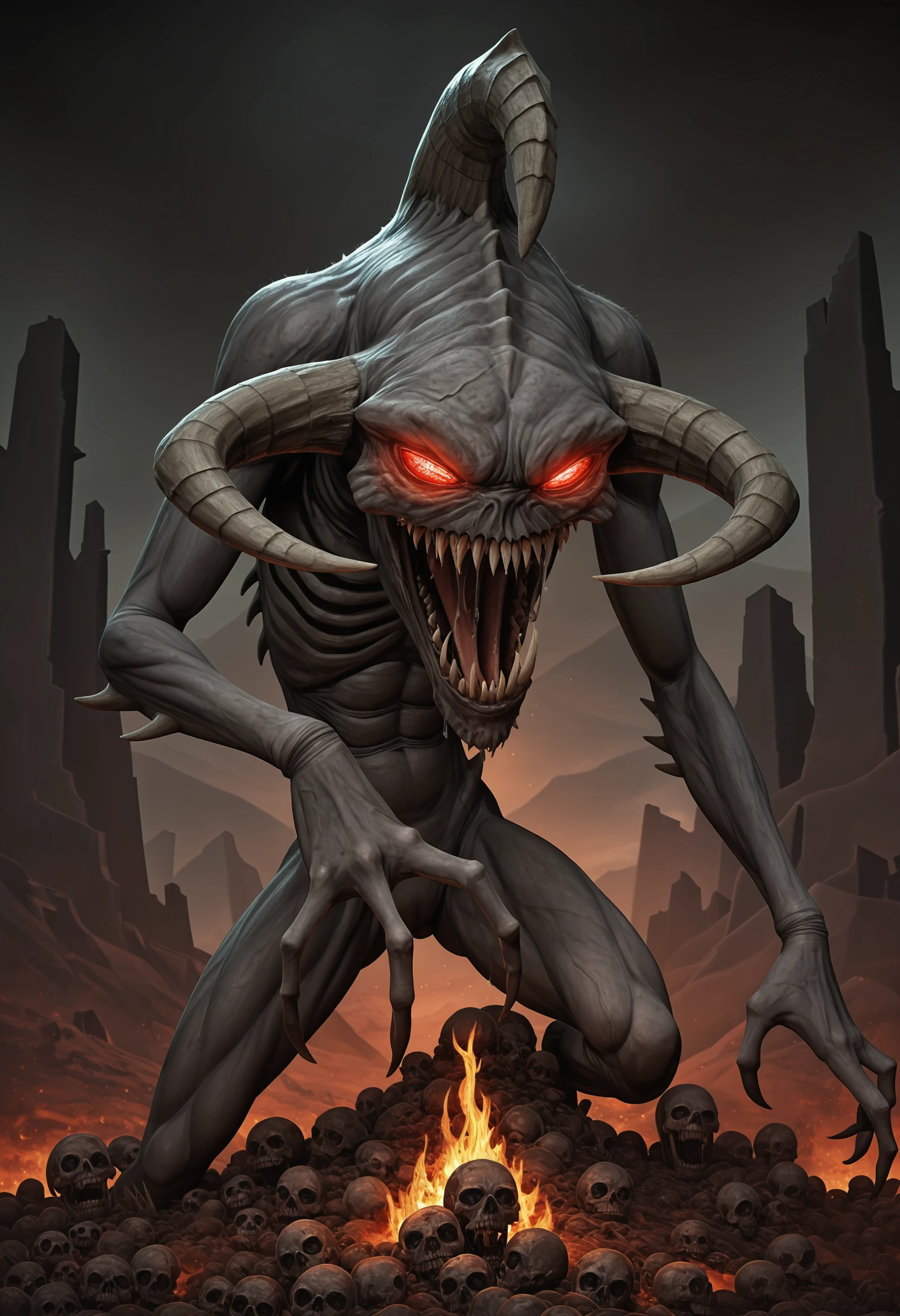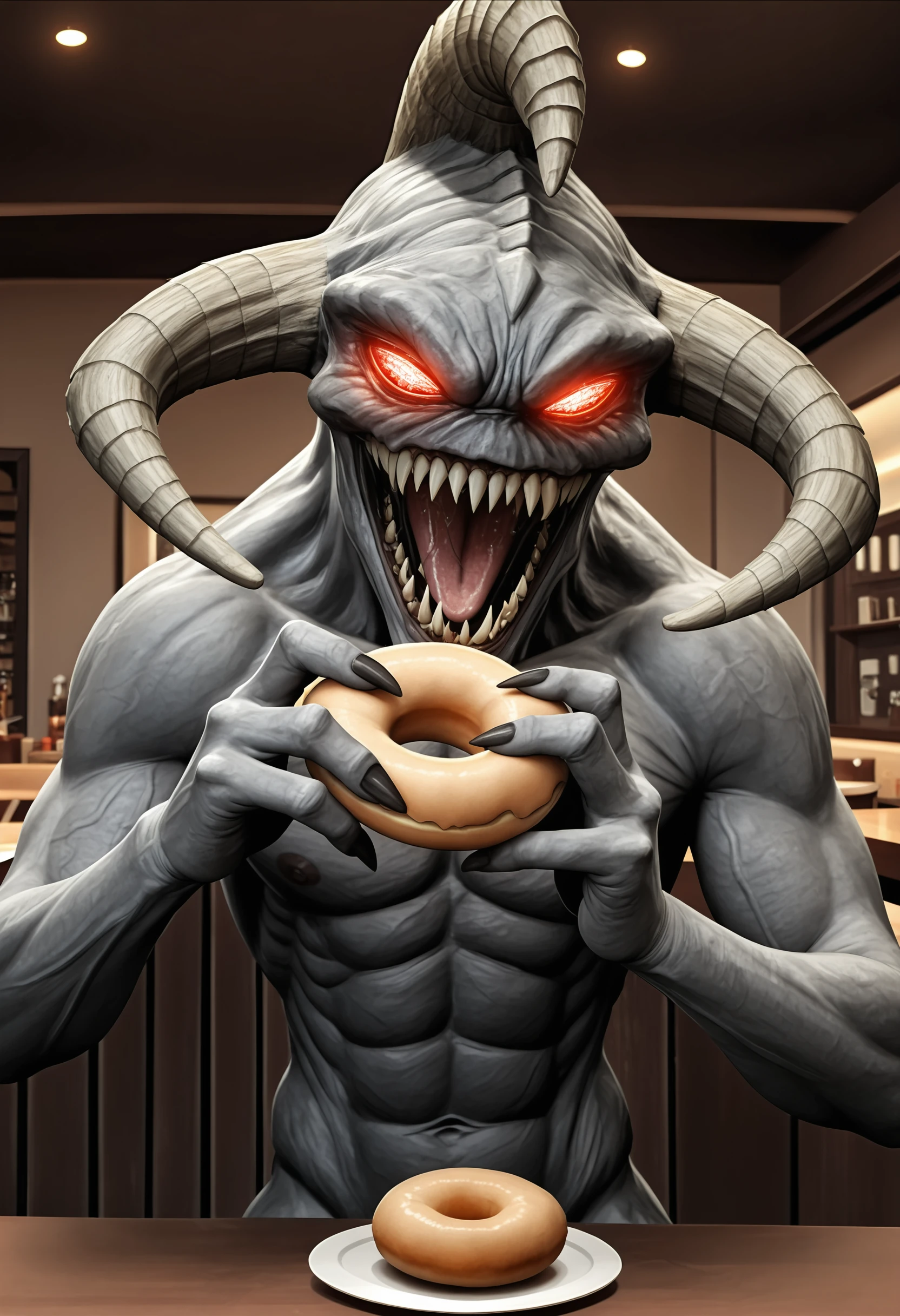 monster, sharp teeth, red eyes, claws, horns, tongue, glowing eyes
