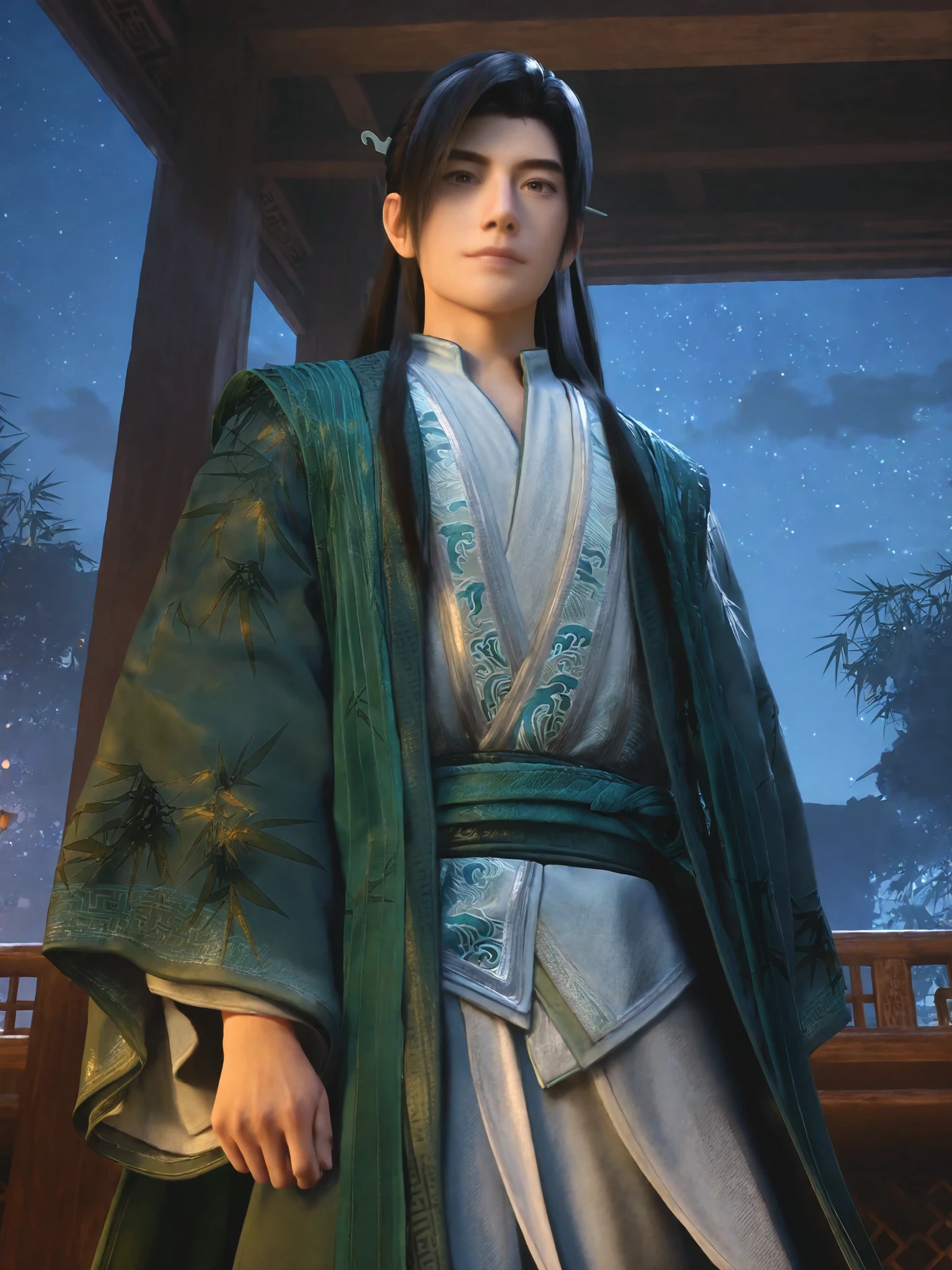 hl-outfit1,half updo,black hair,brown eyes,hair stick,stubble,bamboo print green rope,white hanfu clothes,wide sleeves, white pants, black chinese ancient boots