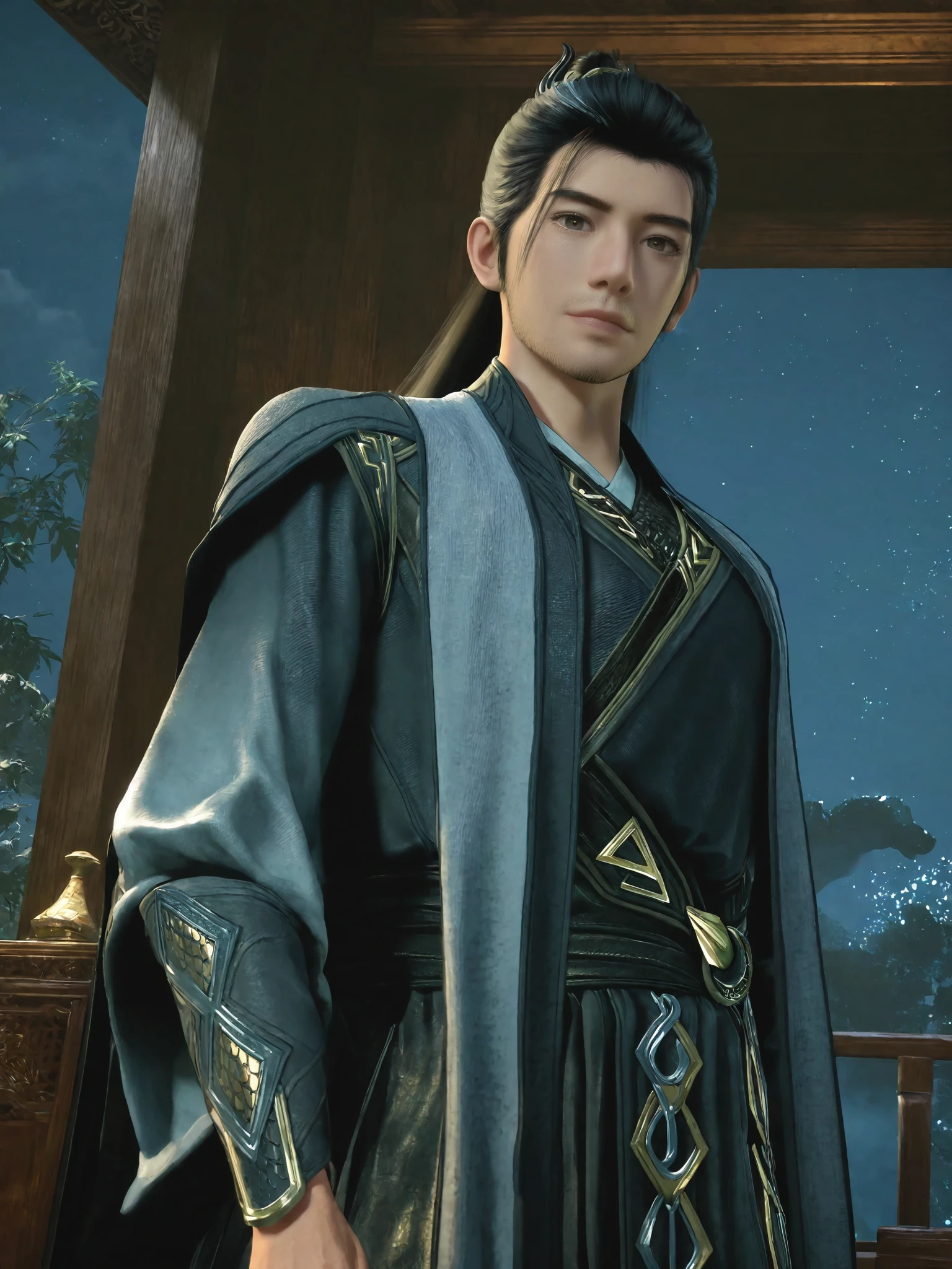 hl-outfit2,high ponytail,black hair,brown eyes,white streaked hair, stubble, dark grey hanfu-inspired clothes, long sleeves, grey cape, bracers,grey chinese ancient boots