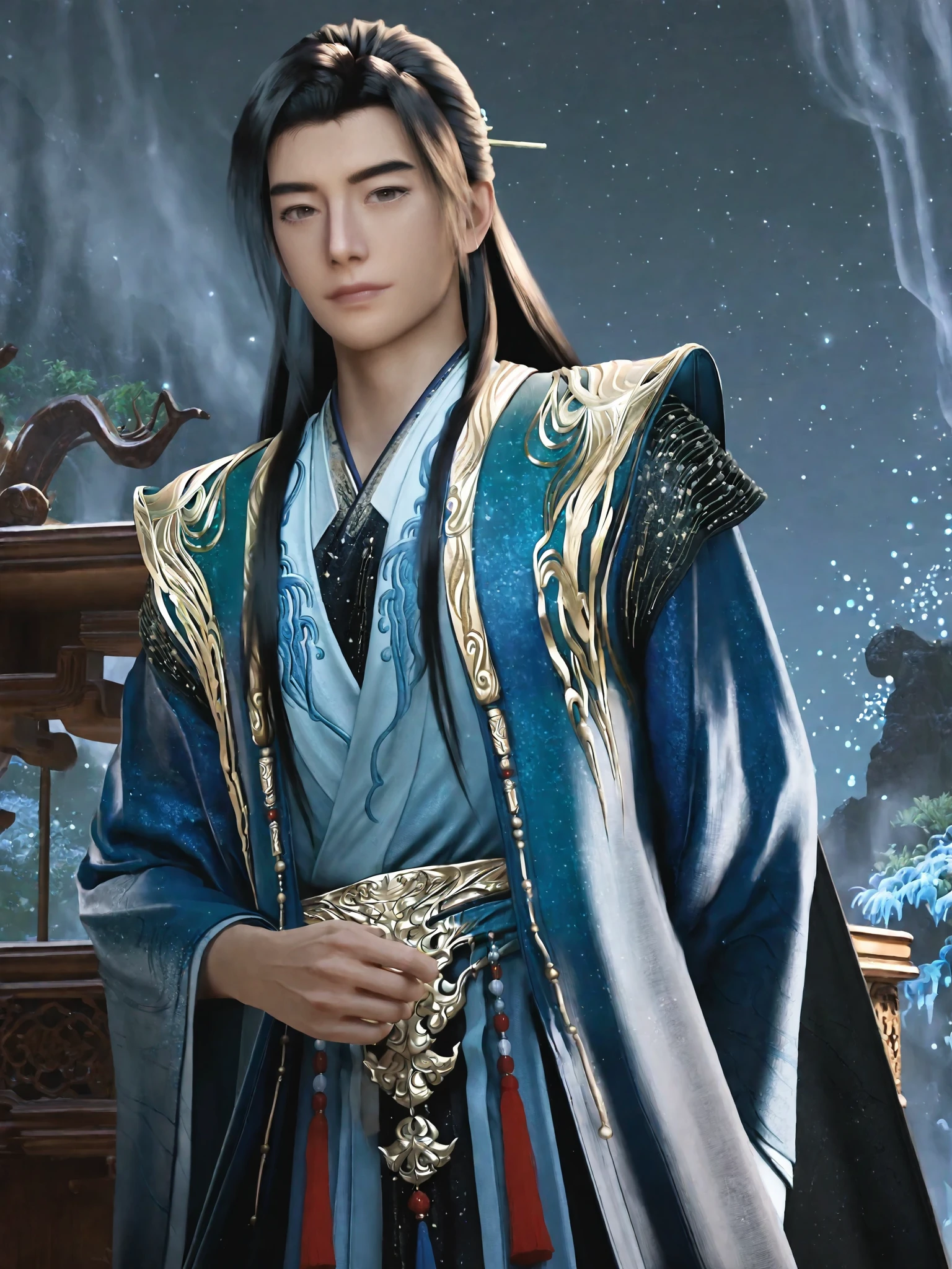 hl-outfit3, half updo,black hair,brown eyes,hl-of3 hair stick, hair ties, cyan robe, gold trim, hanfu-inspired clothes, wide sleeves, black chinese ancient boots