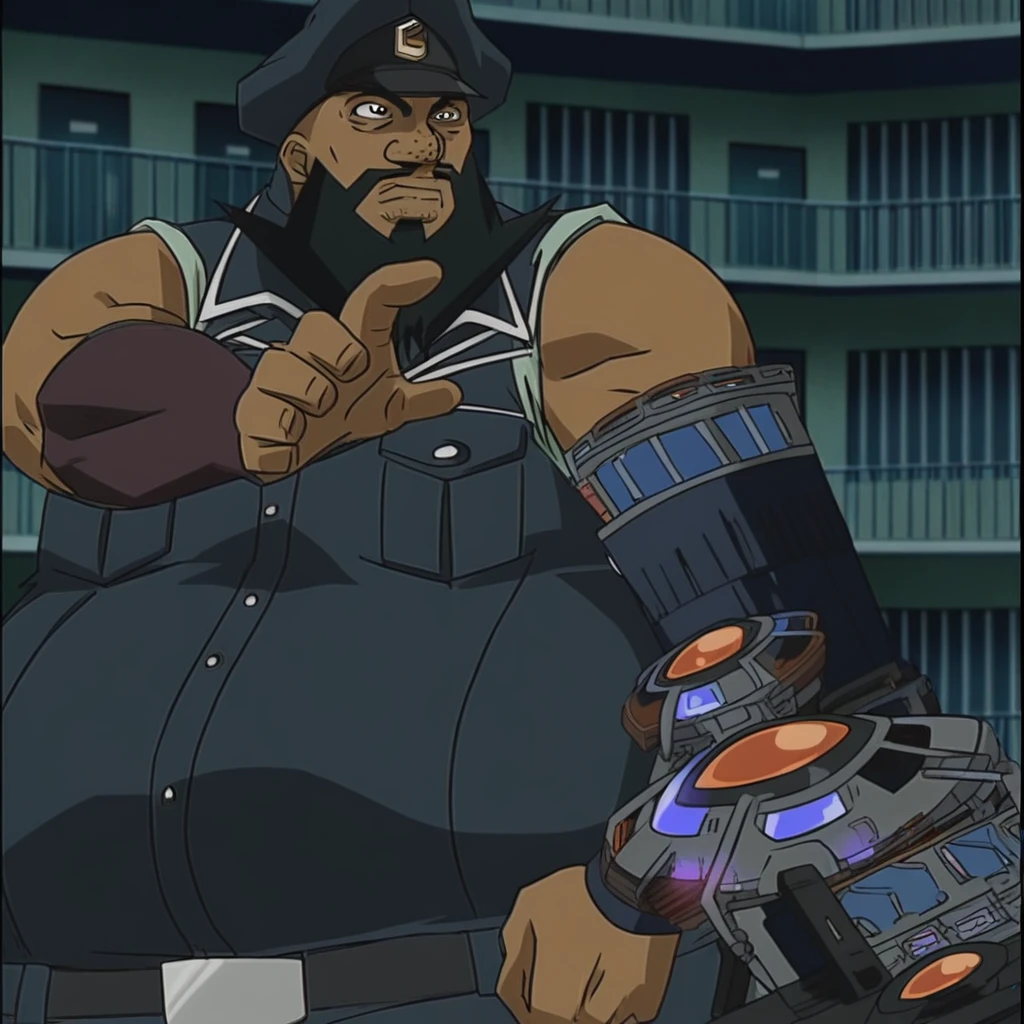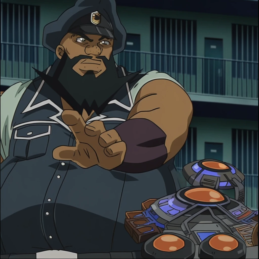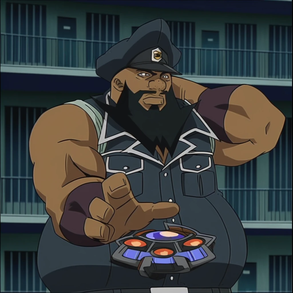 YugiohArmstrong, black hair, beard, dark skin, hat, police uniform