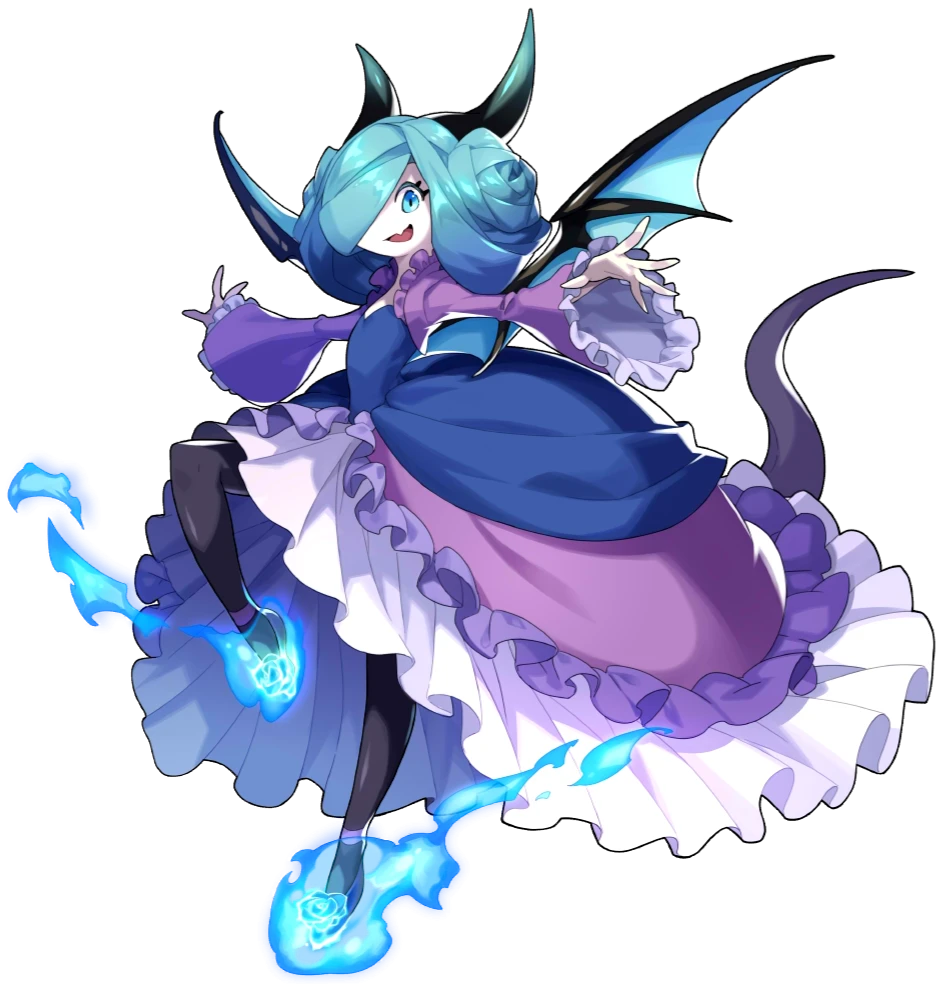 Sildraalo, blue eyes, blue hair, medium hair, hair over one eye, sidelocks tied back, braided bun, double bun, horns, bat wings, tail, dragon girl, skin fang, blue fire,