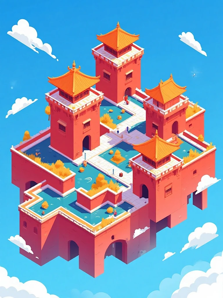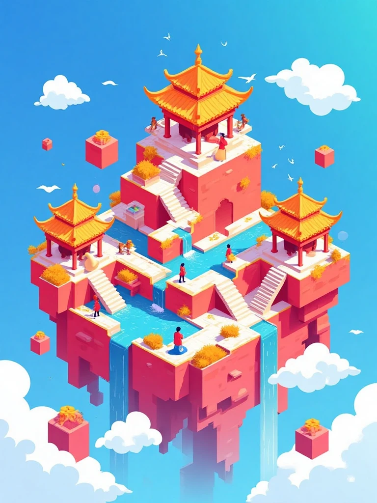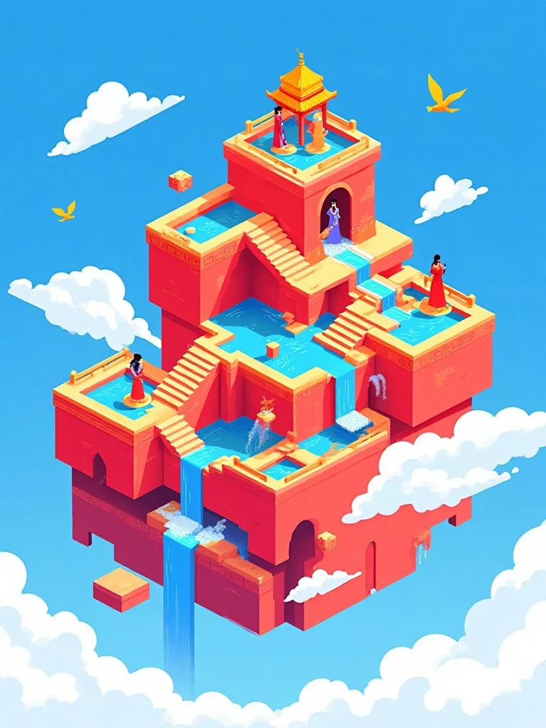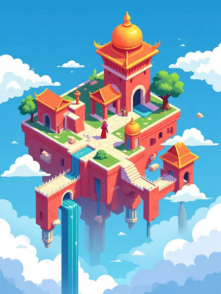 Isometric architectural illustration style, ancient Chinese temple on cloud, red-orange walls, blue sky, flowing waterfalls, tiny human figures, white clouds.