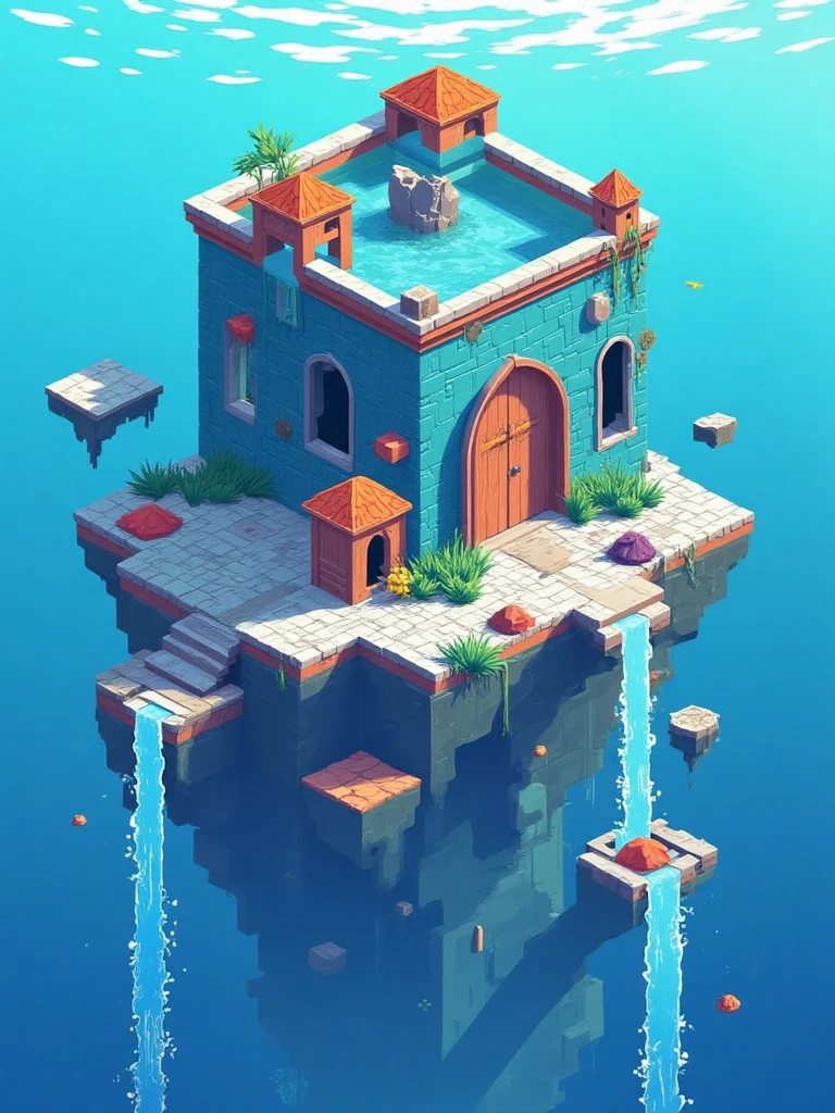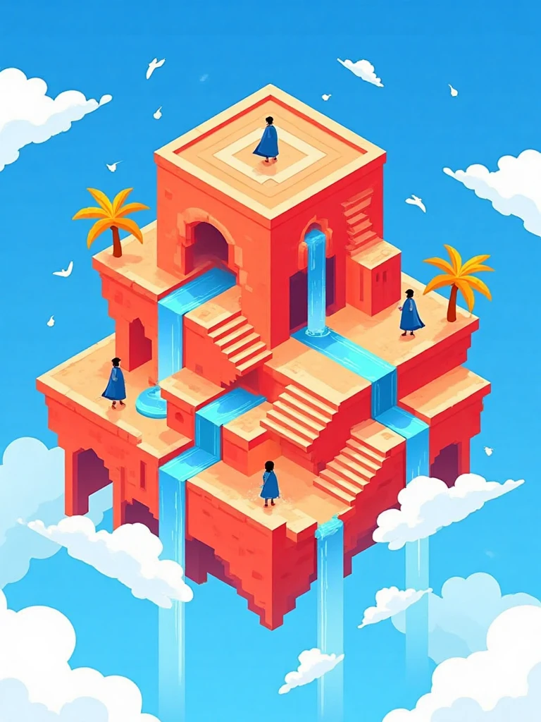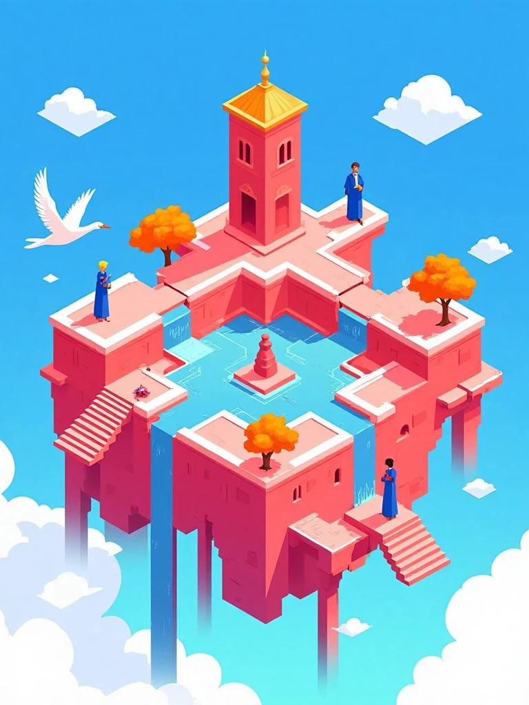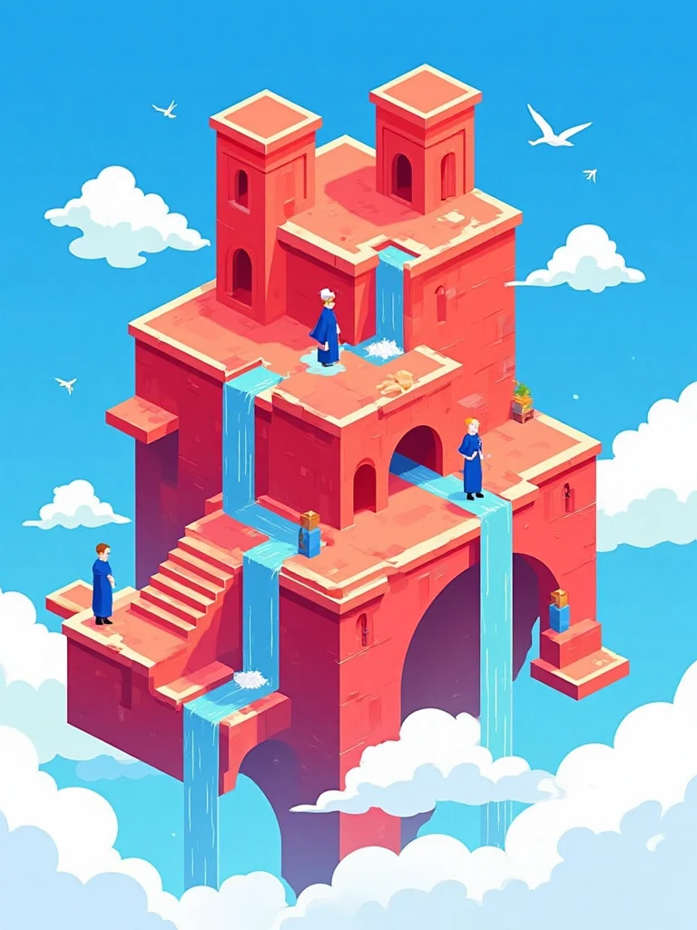 Isometric architectural illustration style, ancient Chinese temple on cloud, red-orange walls, blue sky, flowing waterfalls, tiny human figures, white clouds.