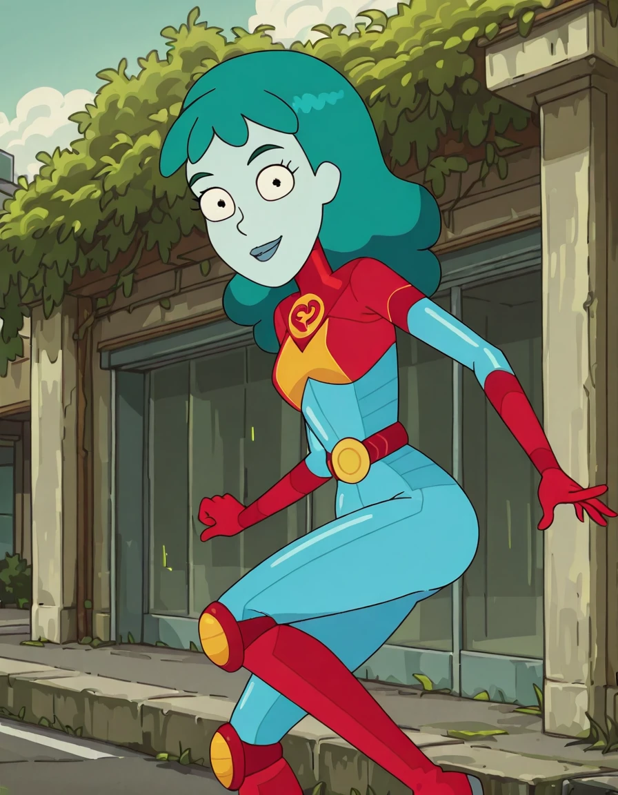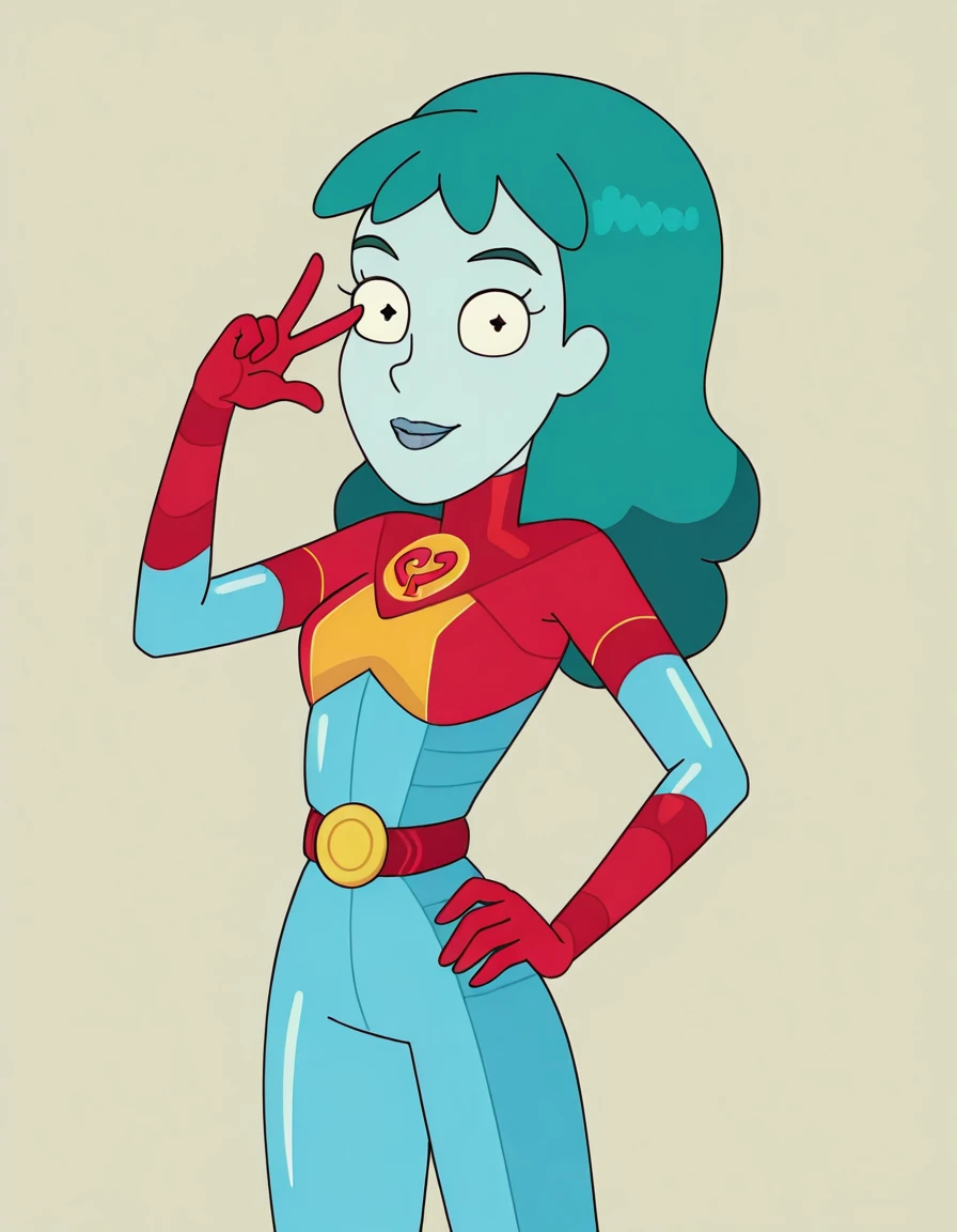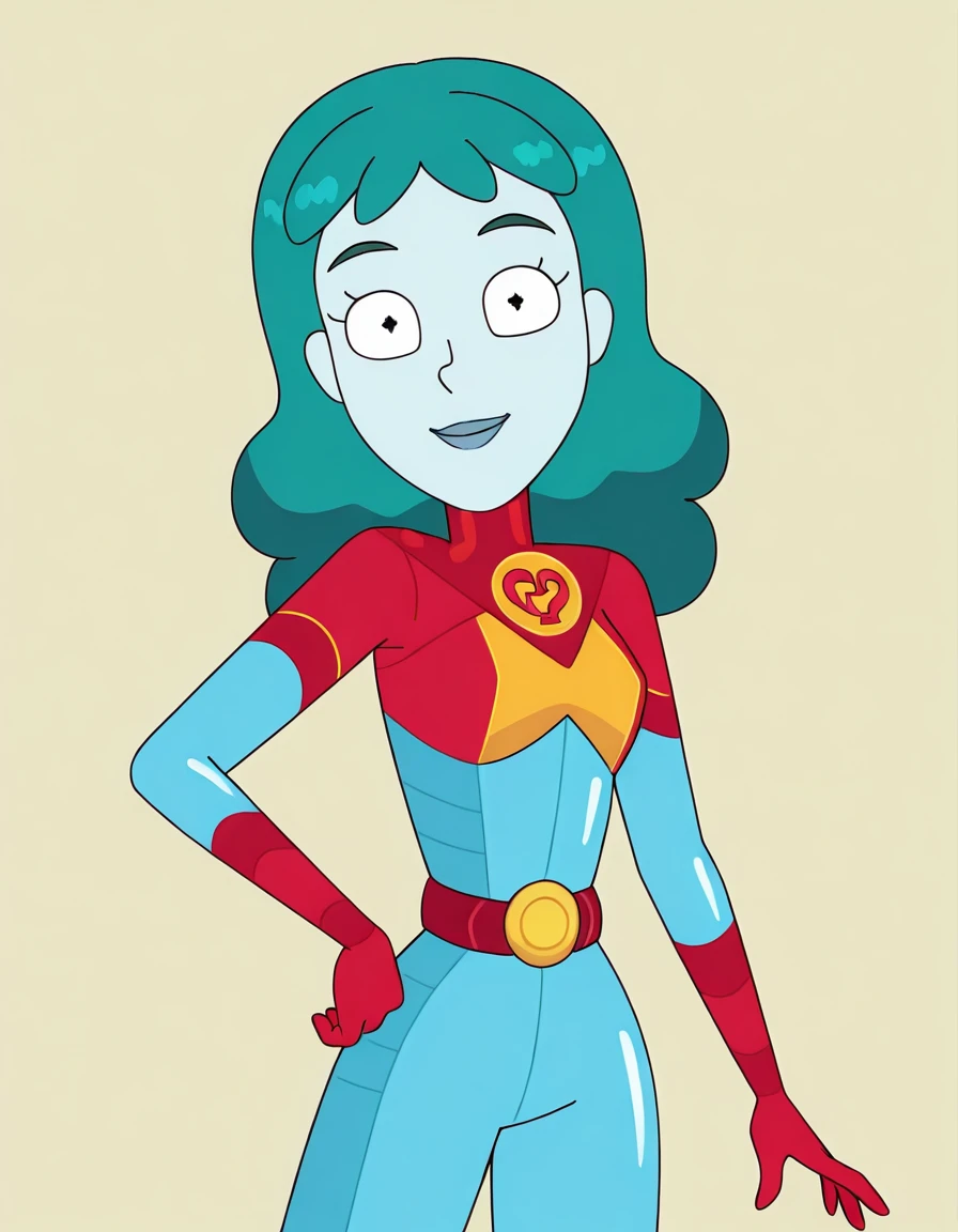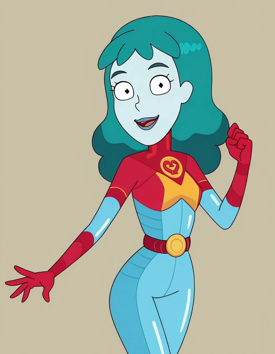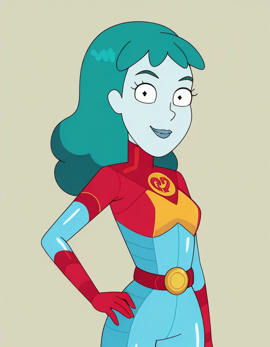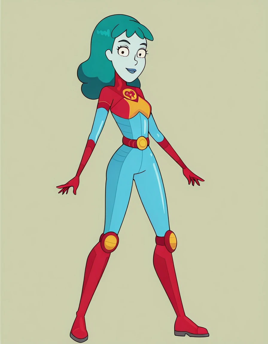planetina, 1girl, solo, bodysuit, blue lips, blue skin, aqua hair, long hair, red gloves, belt,knee boots