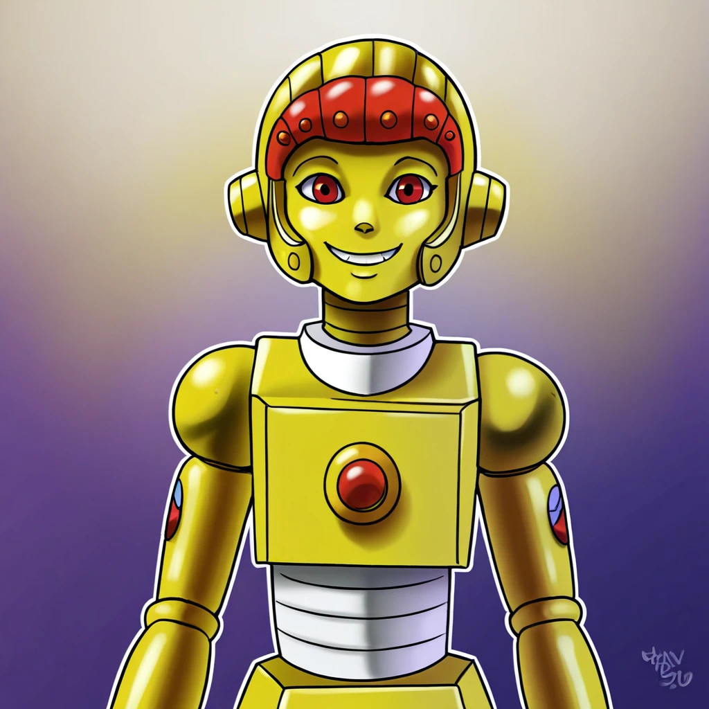 boo, yellow skin, robot girl, helmet, 1girl, solo