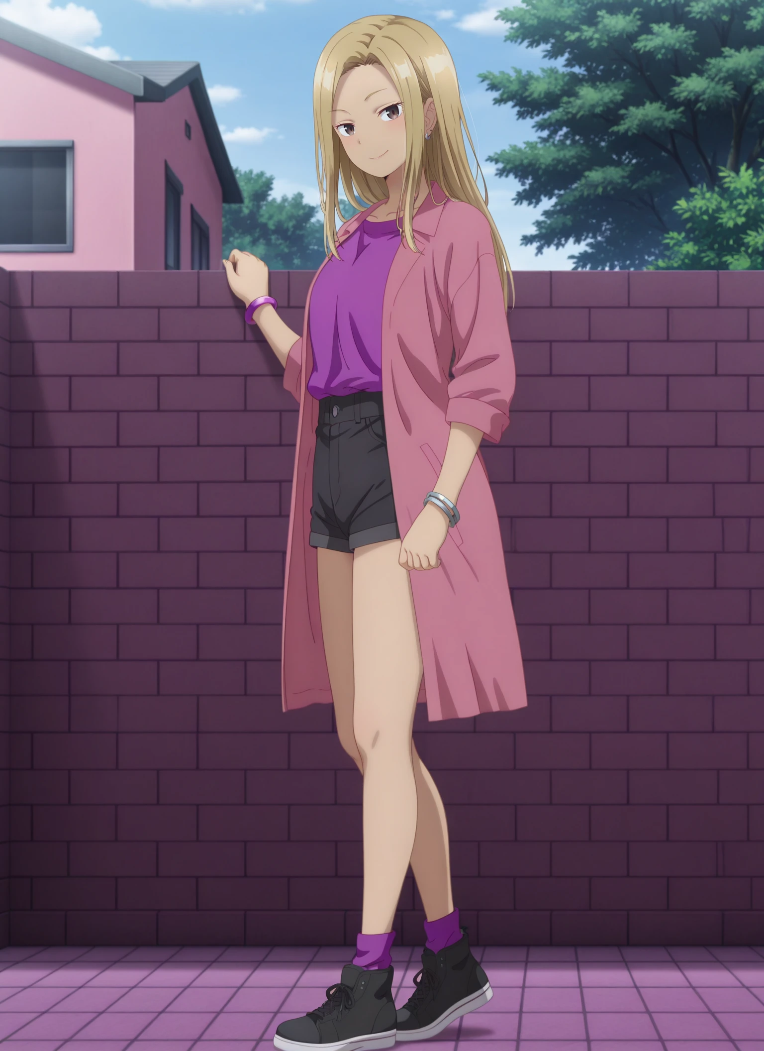 casual_outfit, earrings, blouse, purple blouse, pink long coat, shorts, dark gray shorts, short shorts, purple socks, sneakers, black footwear, bracelet
