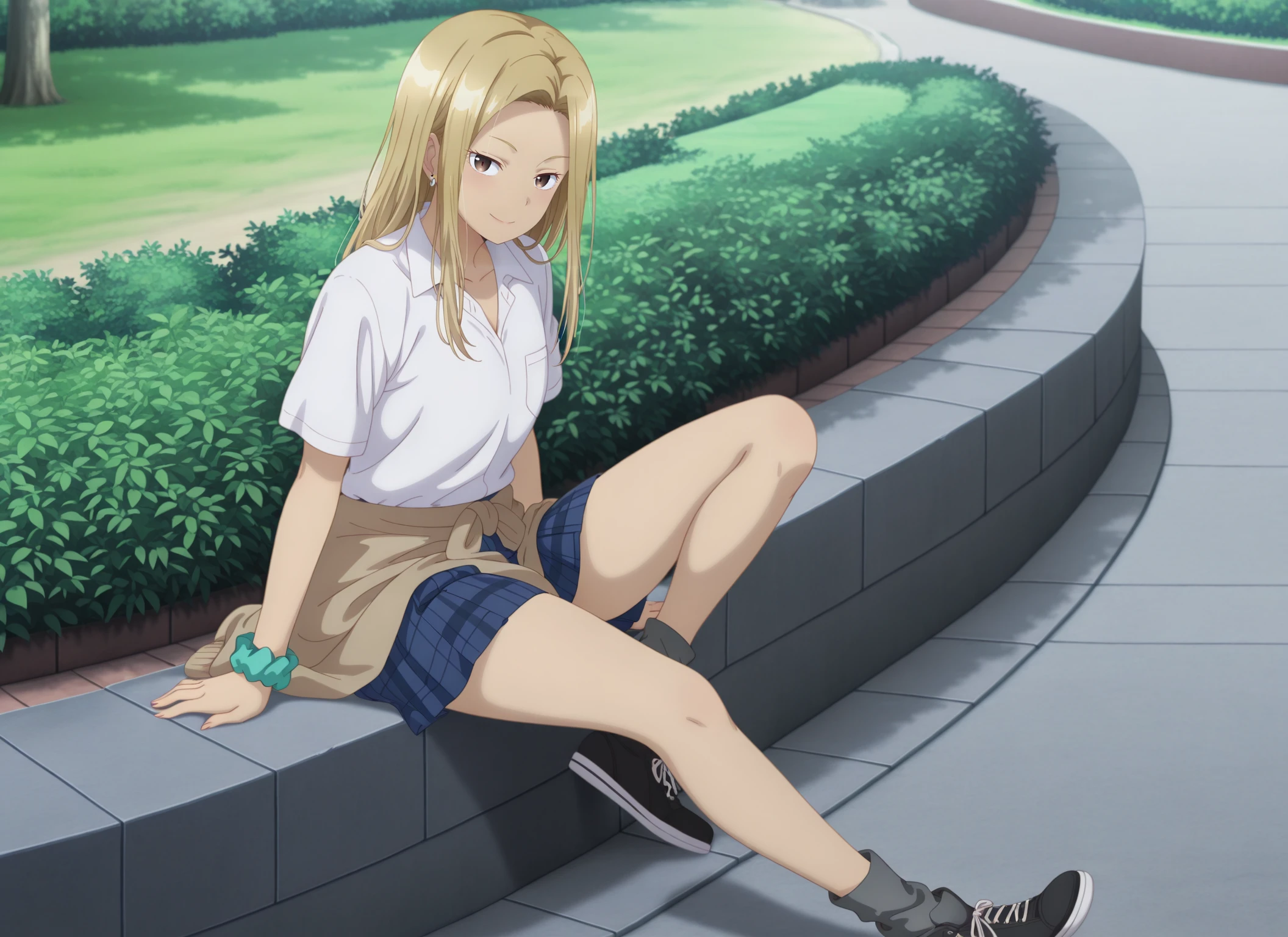 school_uniform_outfit, school uniform, earrings, shirt, white shirt, short sleeves, clothes around waist, sweater around waist, brown sweater, blue skirt, pleated skirt, plaid skirt, grey socks, shoes, black footwear, single aqua wrist scrunchie,