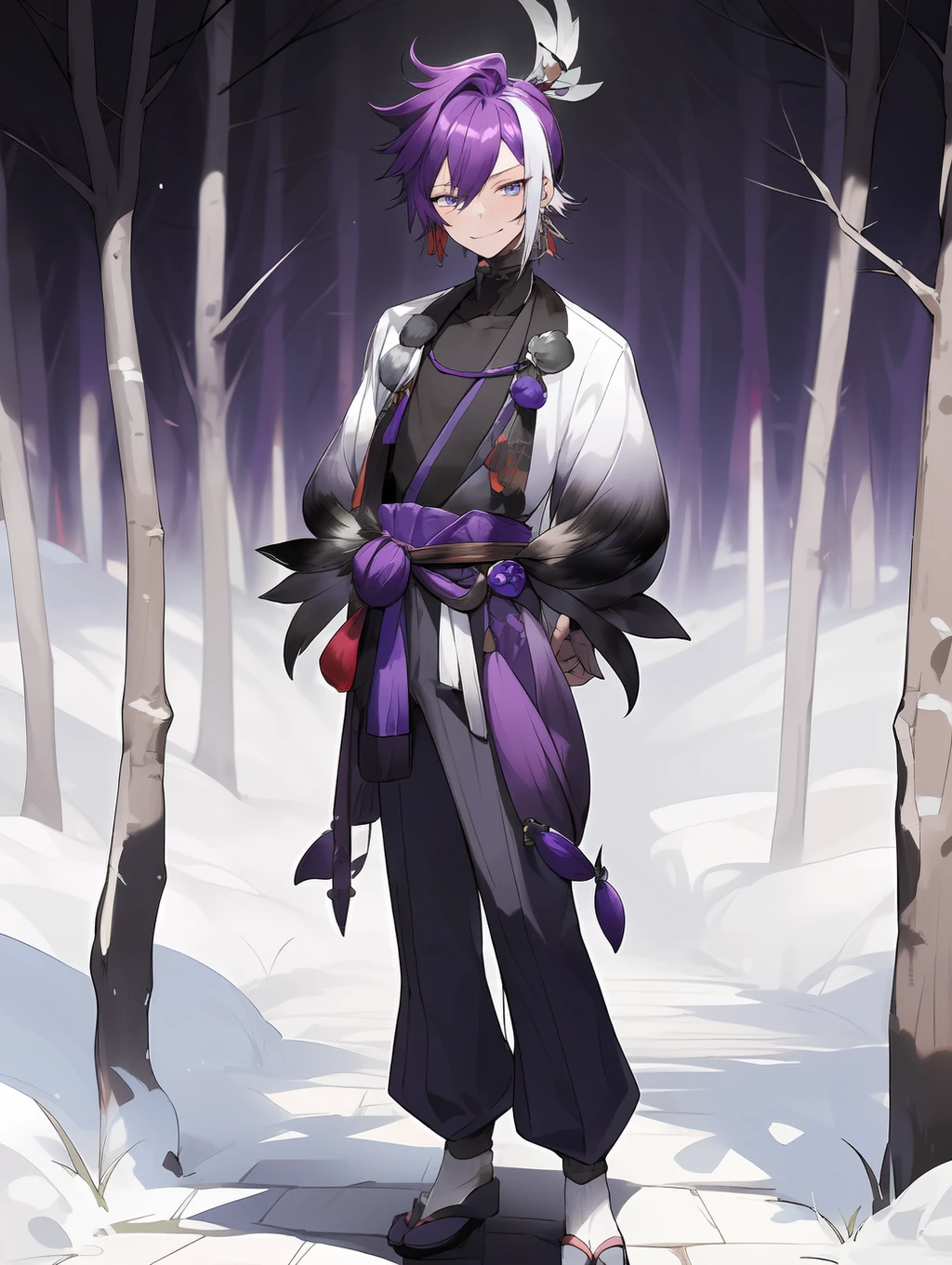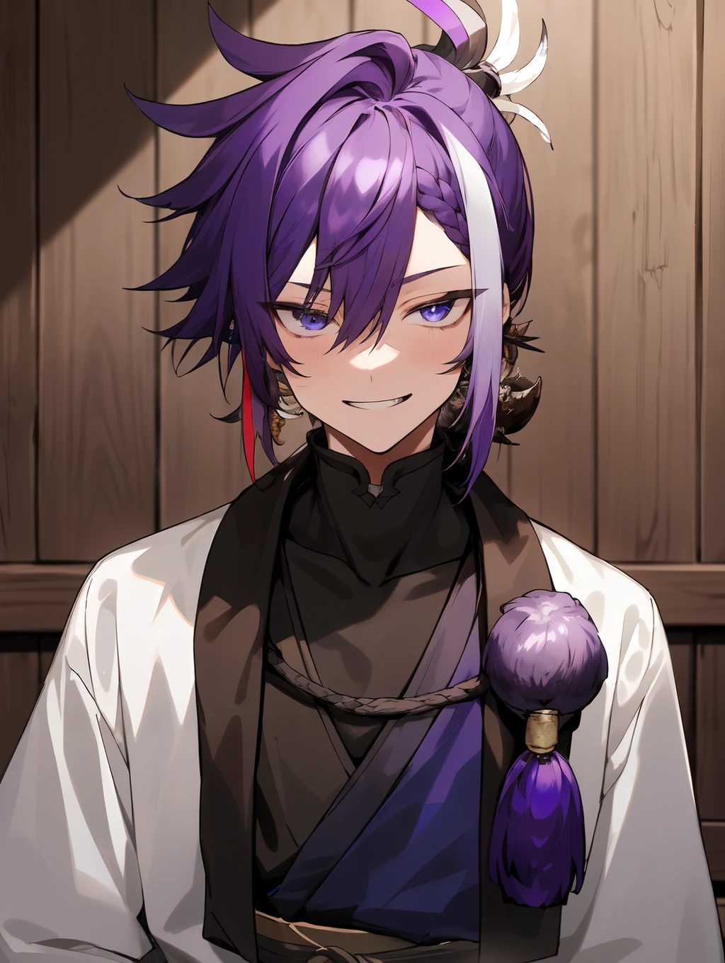 Tags: 1boy, BanzoinHakka, purple hair, purple hair, white streaked hair, spiky hair, bangs, feathers in hair, blue eyes, earrings,