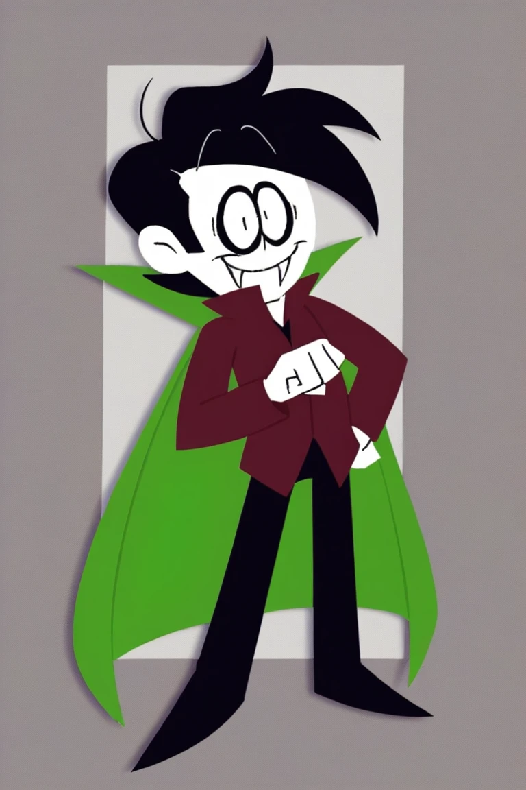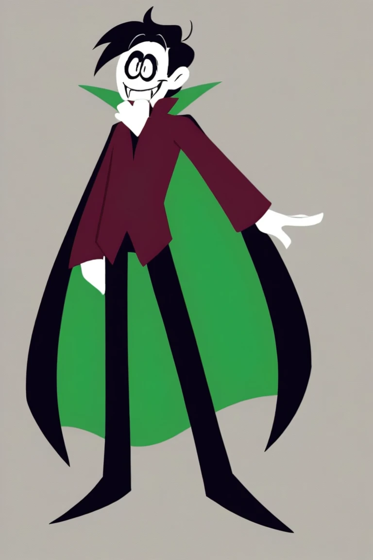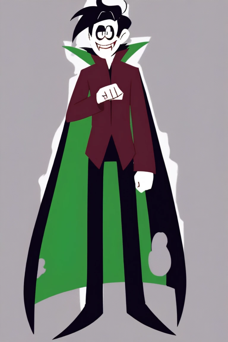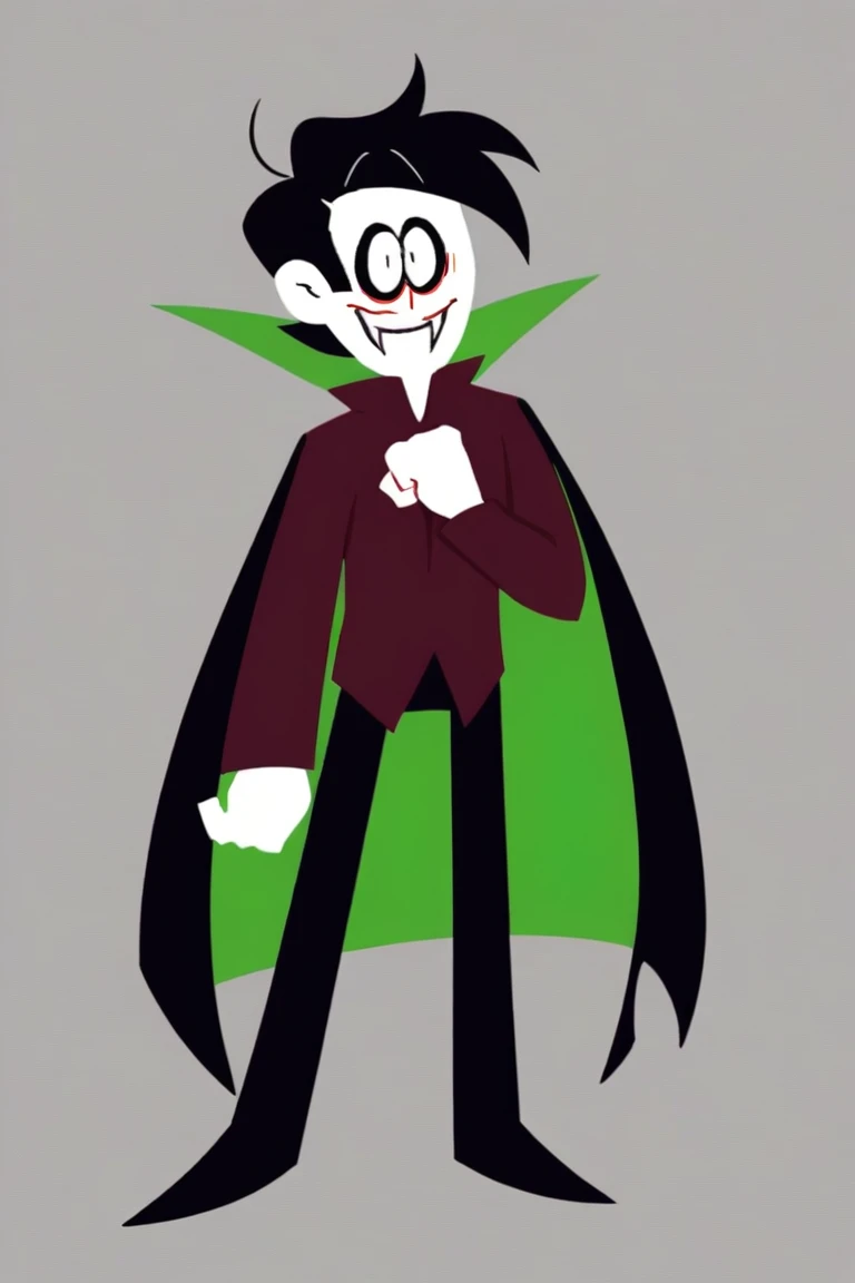 Streber, 1boy, solo, black hair, pale white skin, black eyes, male focus, sharp fangs, vampire, dark red shirt, high collar, black pants, black shoes, cape, green cape, long sleeves,