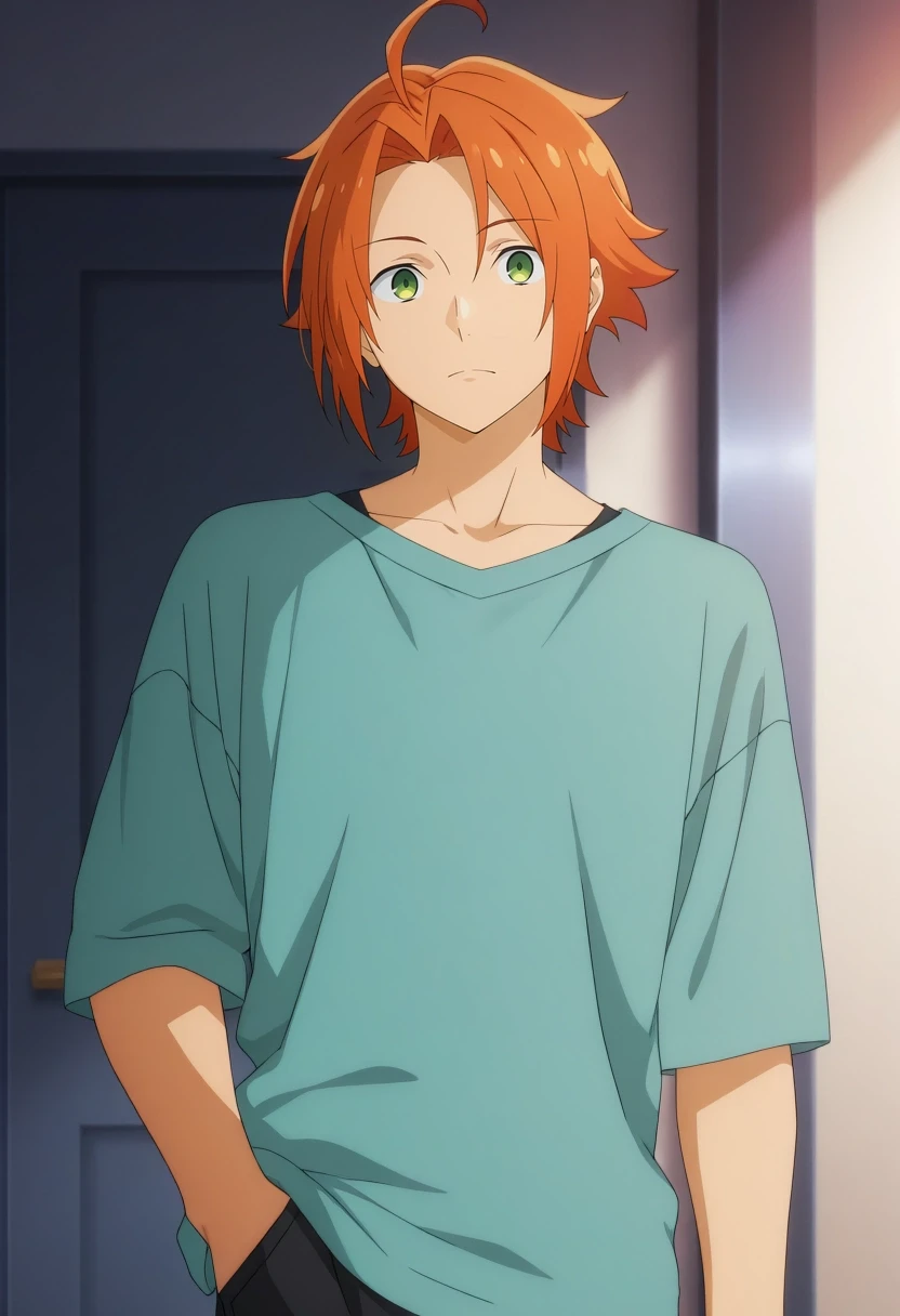 kouichi_shindou, orange hair, green eyes, ahoge, short hair, bangs, parted bangs
