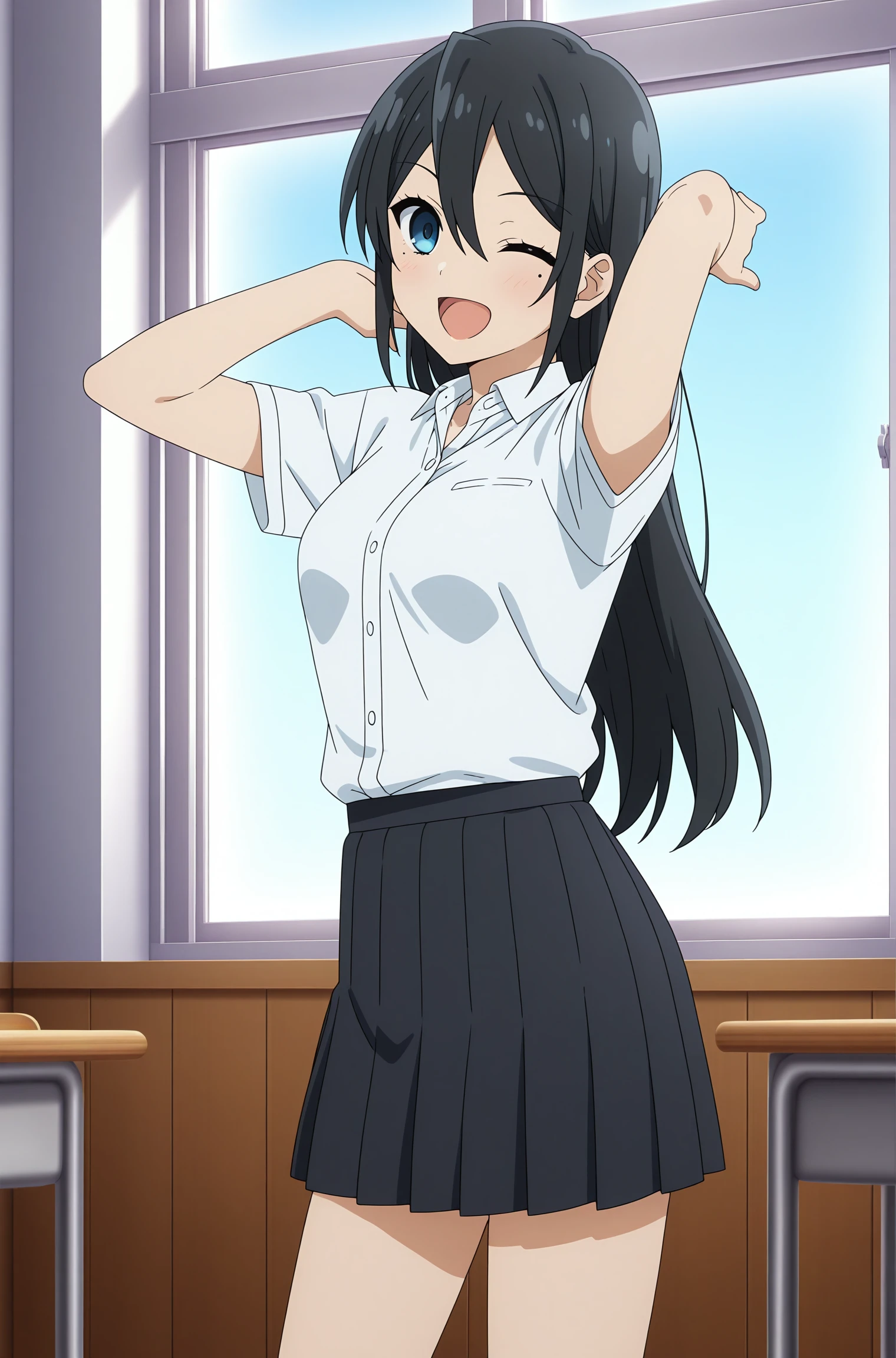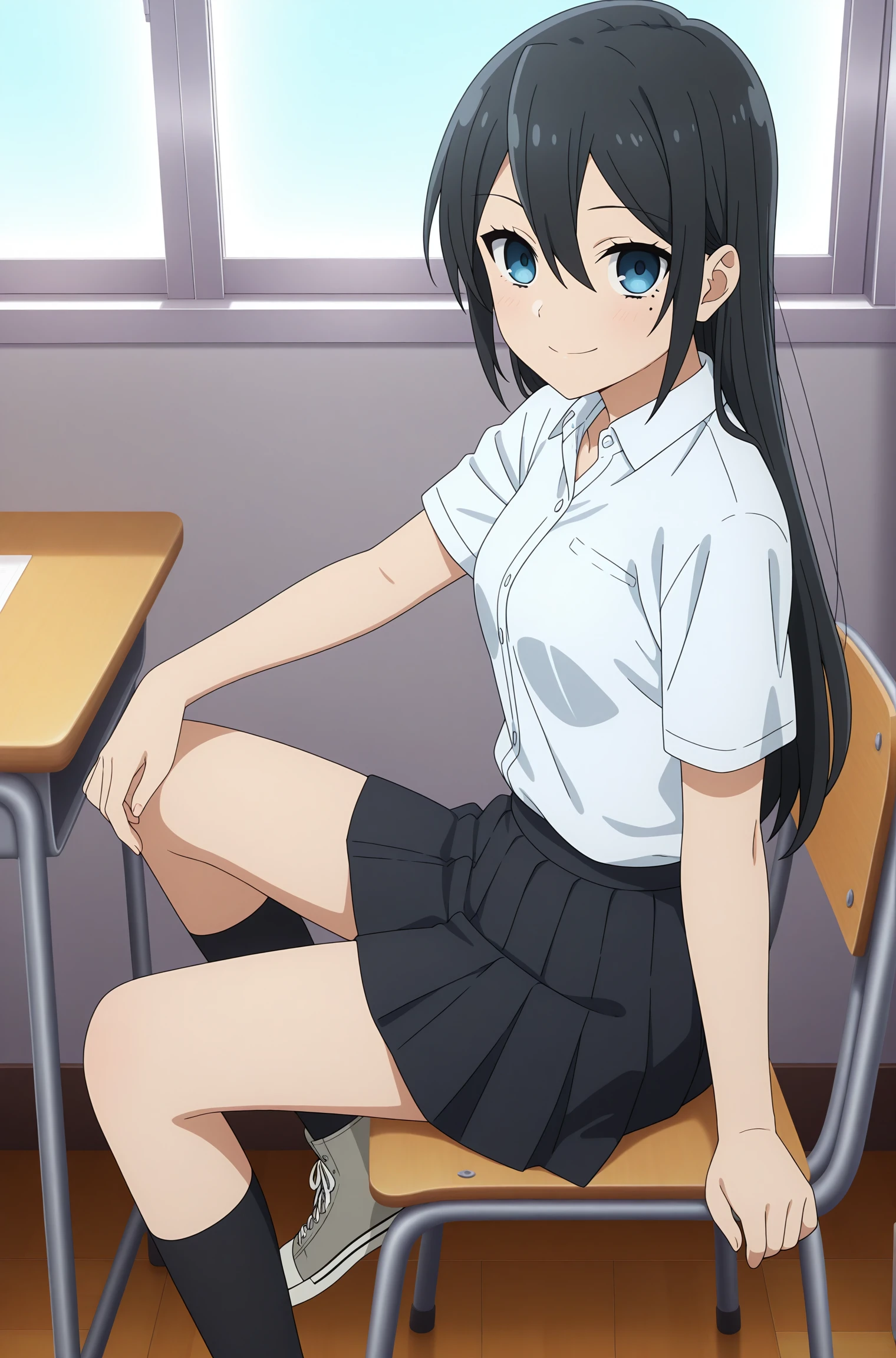 sawada honoka, long hair, black hair, hair between eyes, blue eyes, mole under eye, school uniform, short sleeves, white shirt, collared shirt, black skirt, pleated skirt, black kneehighs, grey footwear, converse, high topsSchool Uniform (Winter)