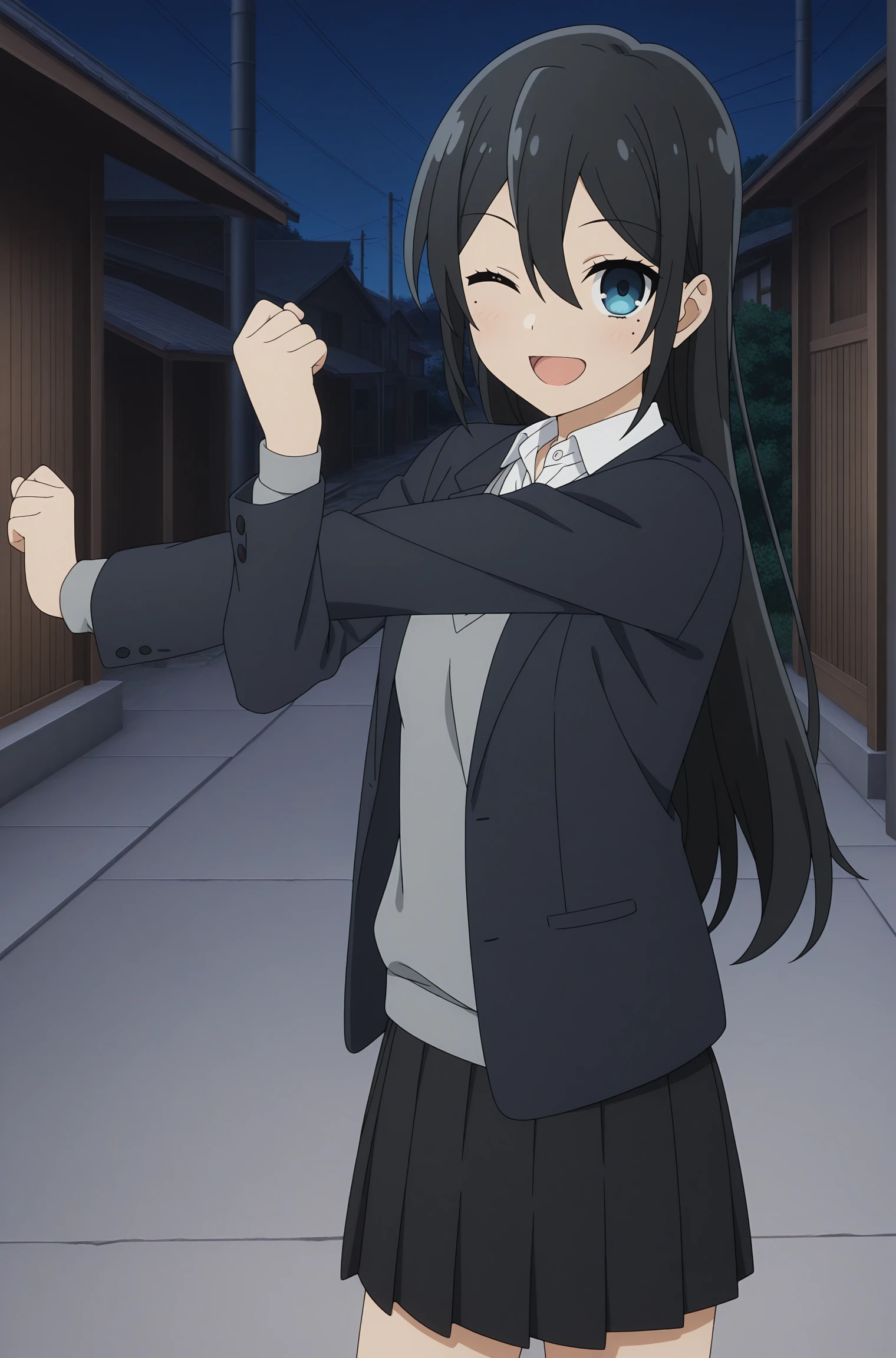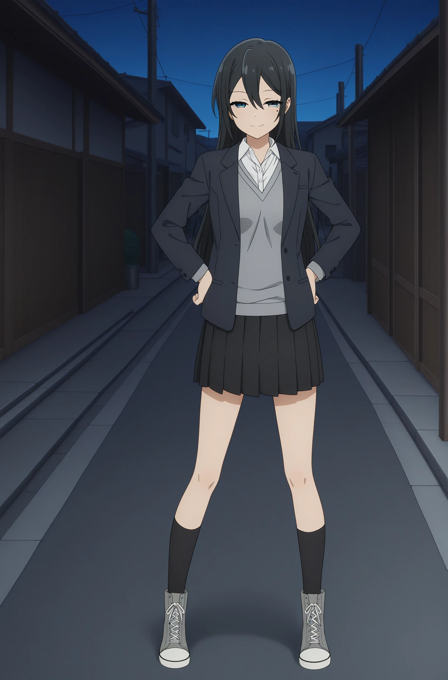 sawada honoka, long hair, black hair, hair between eyes, blue eyes, mole under eye, school uniform, long sleeves, black jacket, open jacket, grey sweater, white shirt, collared shirt, black skirt, pleated skirt, black kneehighs, grey footwear, converse, high topsDescription
