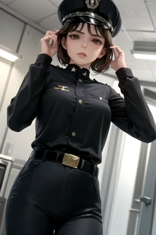 MeiLingMGS4, 1girl, solo, short hair, brown hair, long sleeves, brown eyes, belt, black pants, black uniform, military uniform, peaked cap,