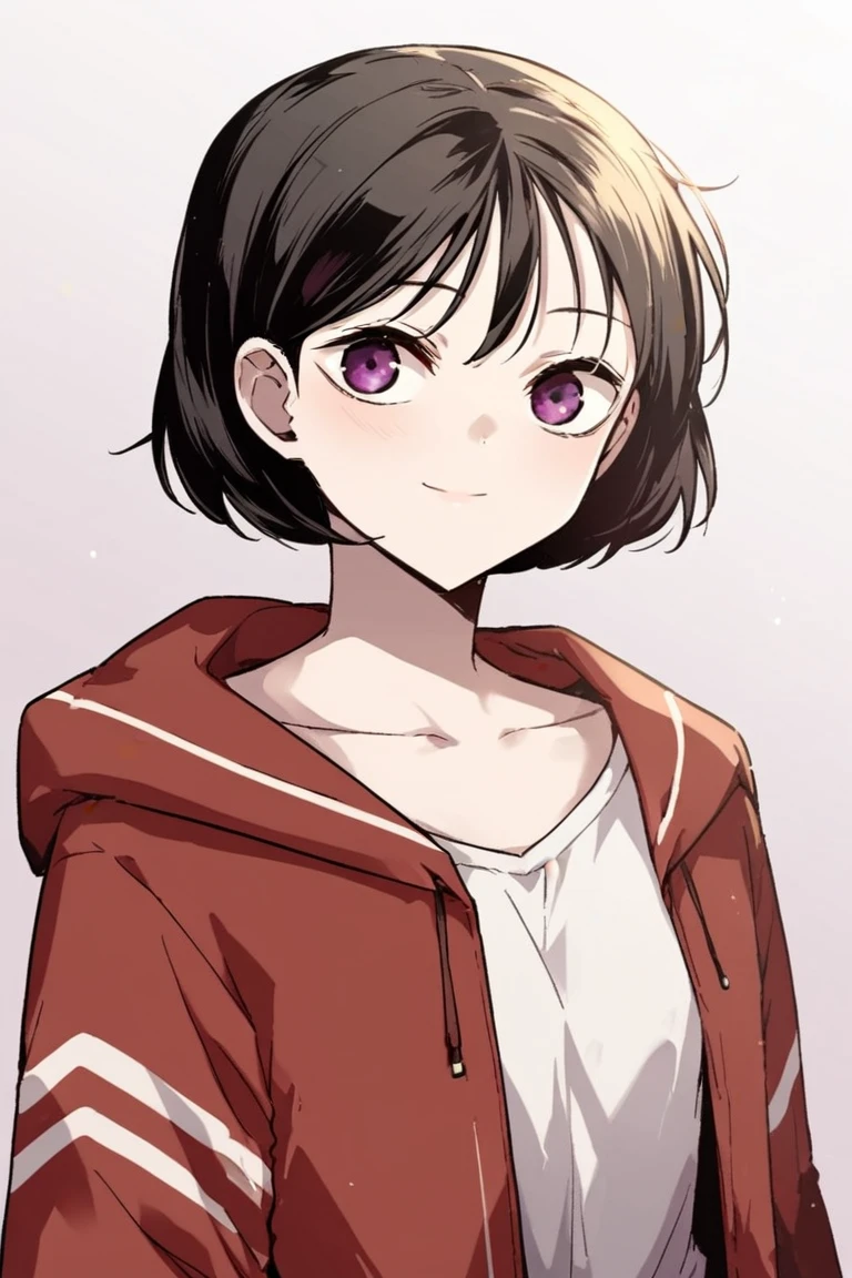 short hair, bangs, shirt, black hair, long sleeves, purple eyes, collarbone, jacket, white shirt, open clothes, hood, open jacket, hood down, red jacket