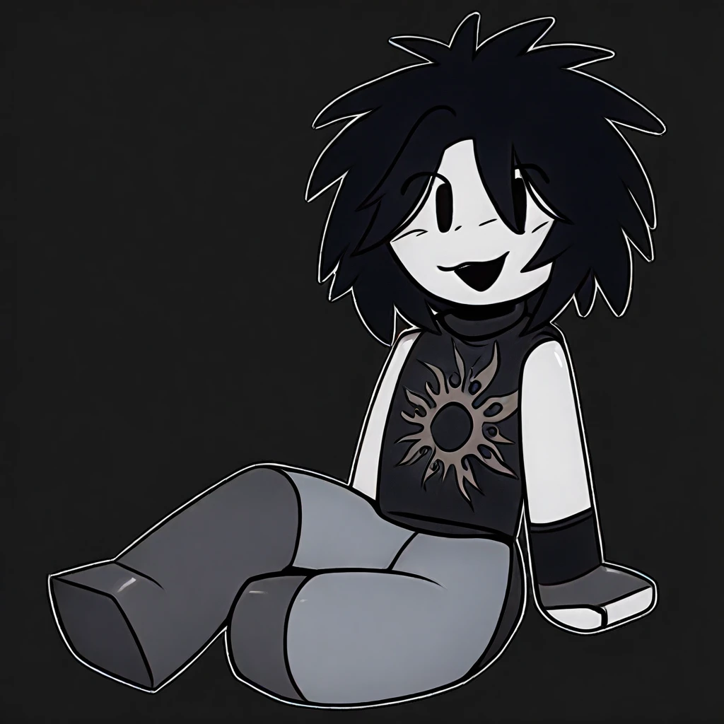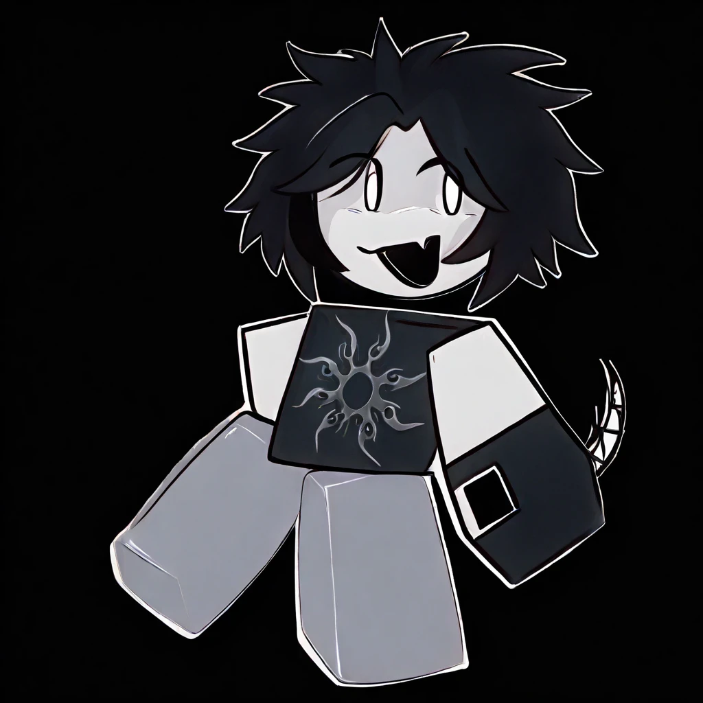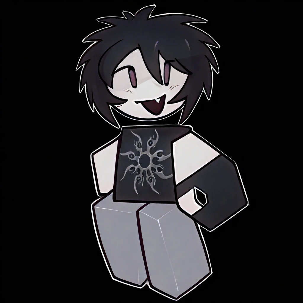 anthro, cartoony, roblox, white skin, simple face, messy black hair, black t-shirt, subtle skull emblem on chest, dark blue pants,