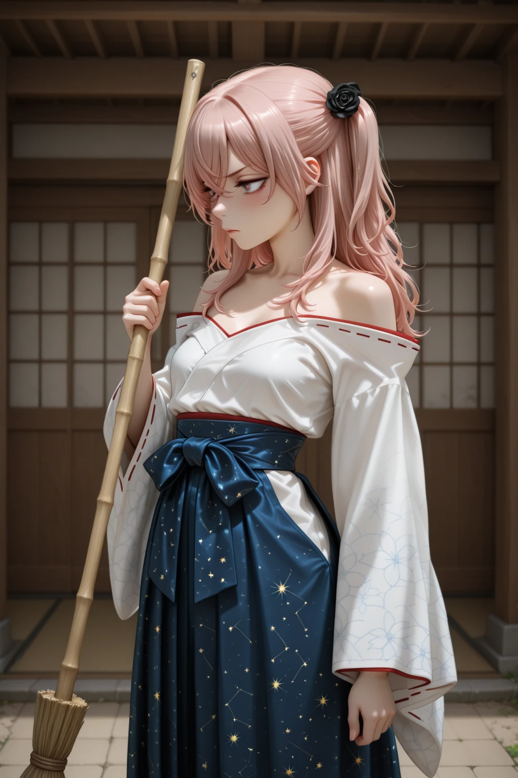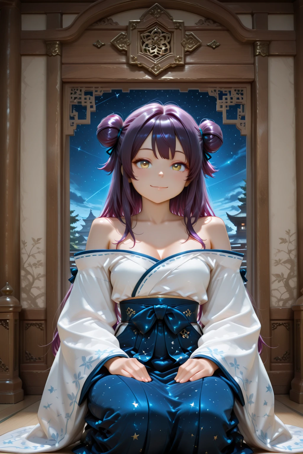 Celestial_Shrine_Maiden_Outfit, long sleeves, bare shoulders, japanese clothes, wide sleeves, off shoulder, blue hakama skirt, blue hakama, bow, blue bow, star print, sash, obi, collarbone, star(symbol), starry sky print, constellation print, long skirt, socks, ribbon trim, ribbon-trimmed sleeves, zouri, miko