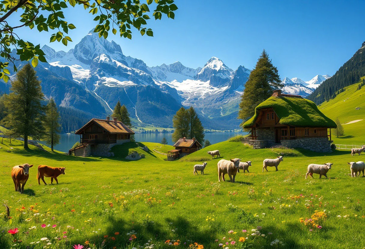 Mountain landscape with houses and animals - V1