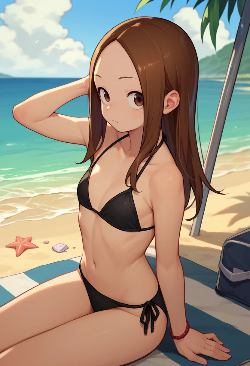 Takagi, brown hair, brown eyes, long hair, white serafuku, red necktie, blue stripes, blue skirt