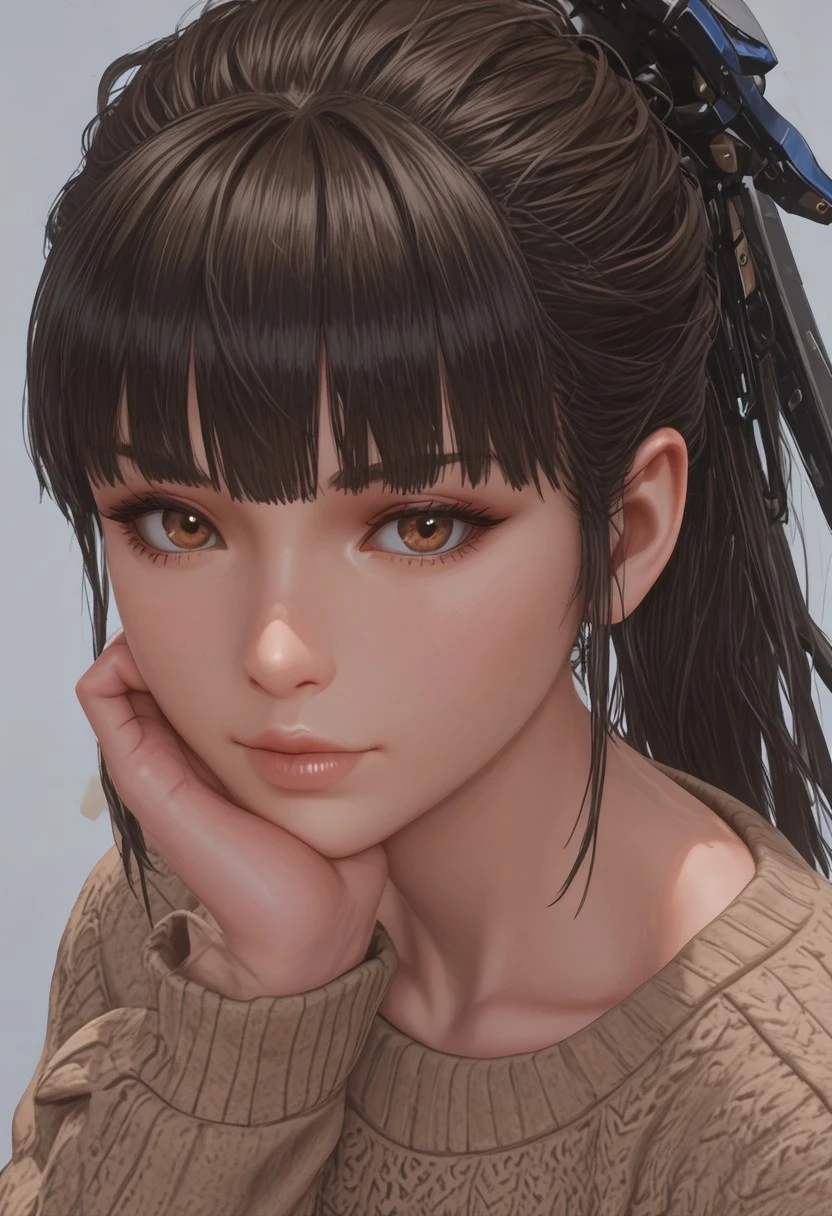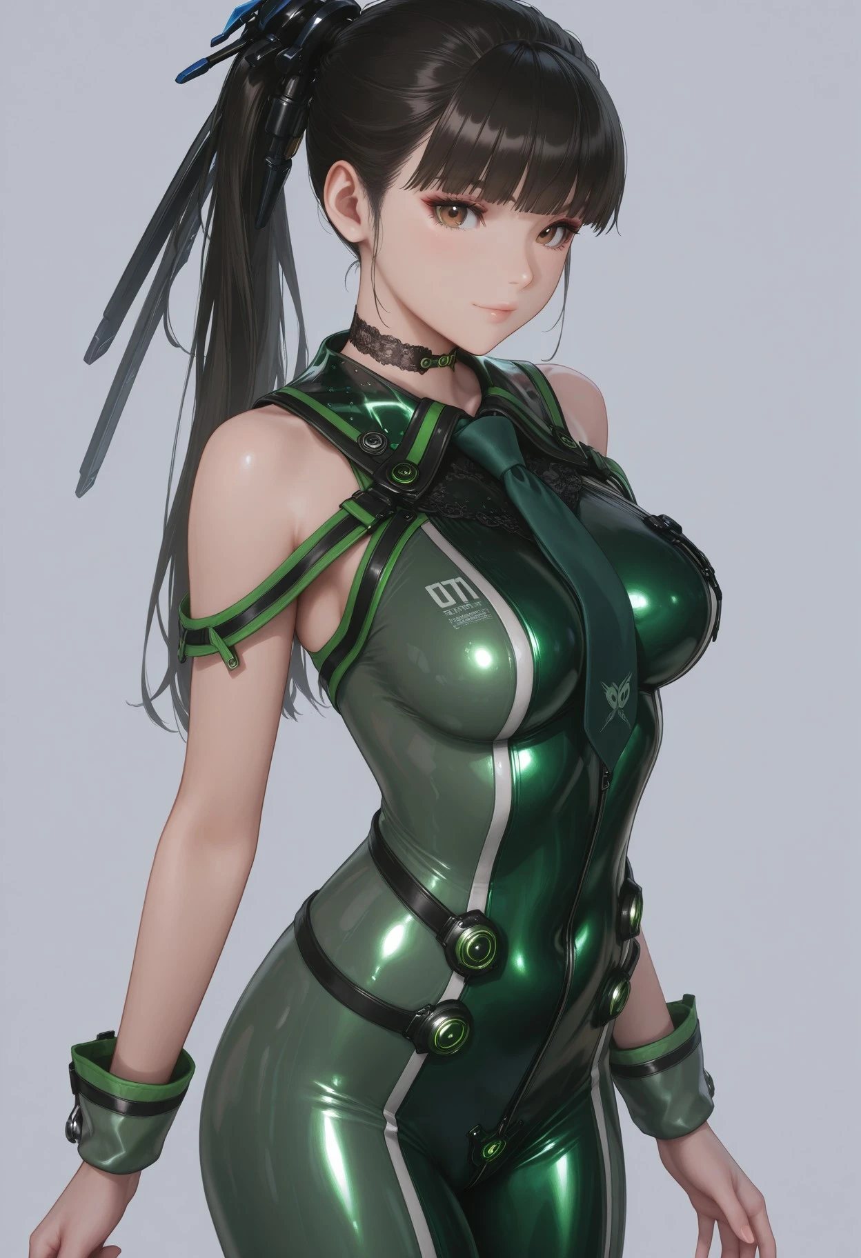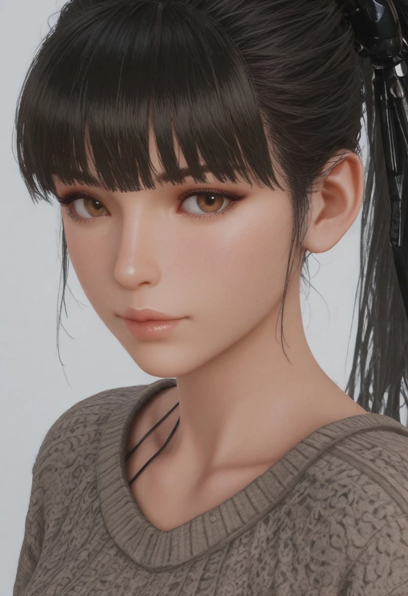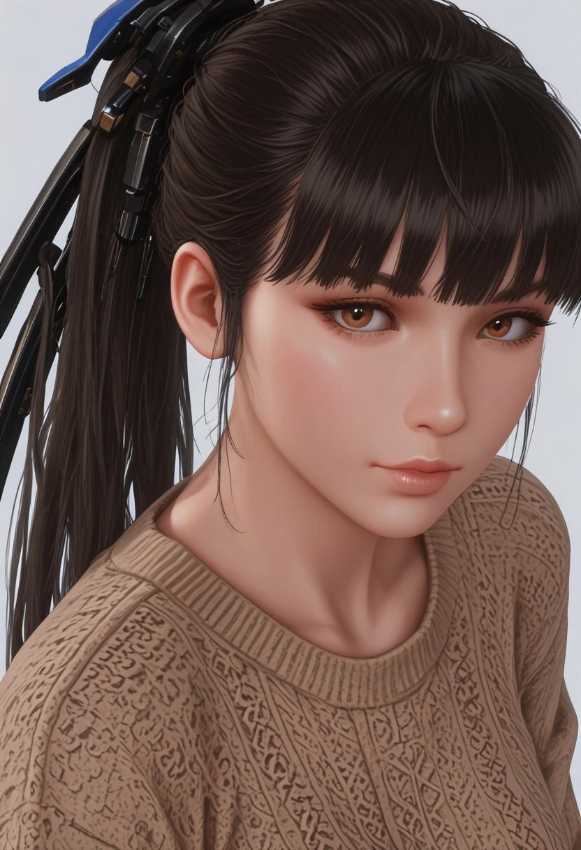 1 girl, solo, Eve \(stellar blade\), black hair, brown eyes, ponytail, hair ornament, blunt bangs,