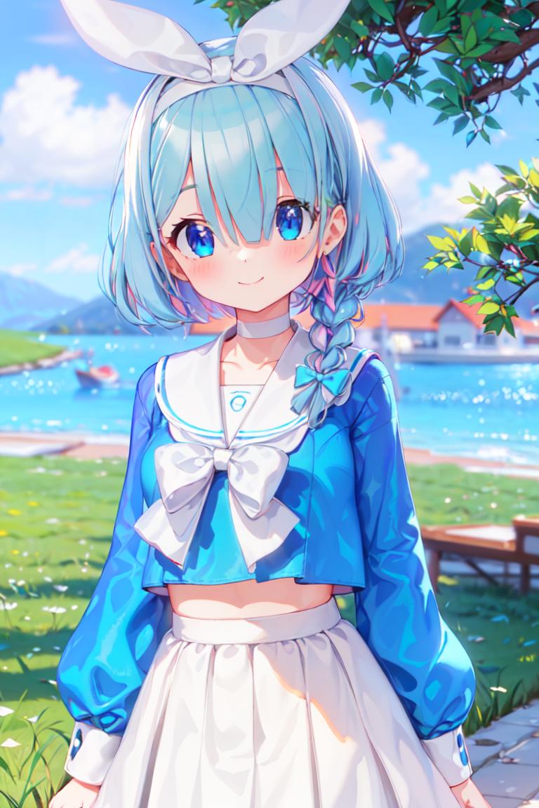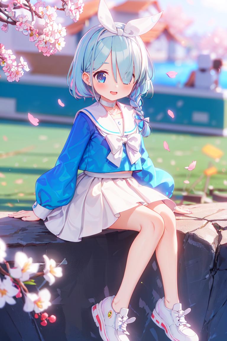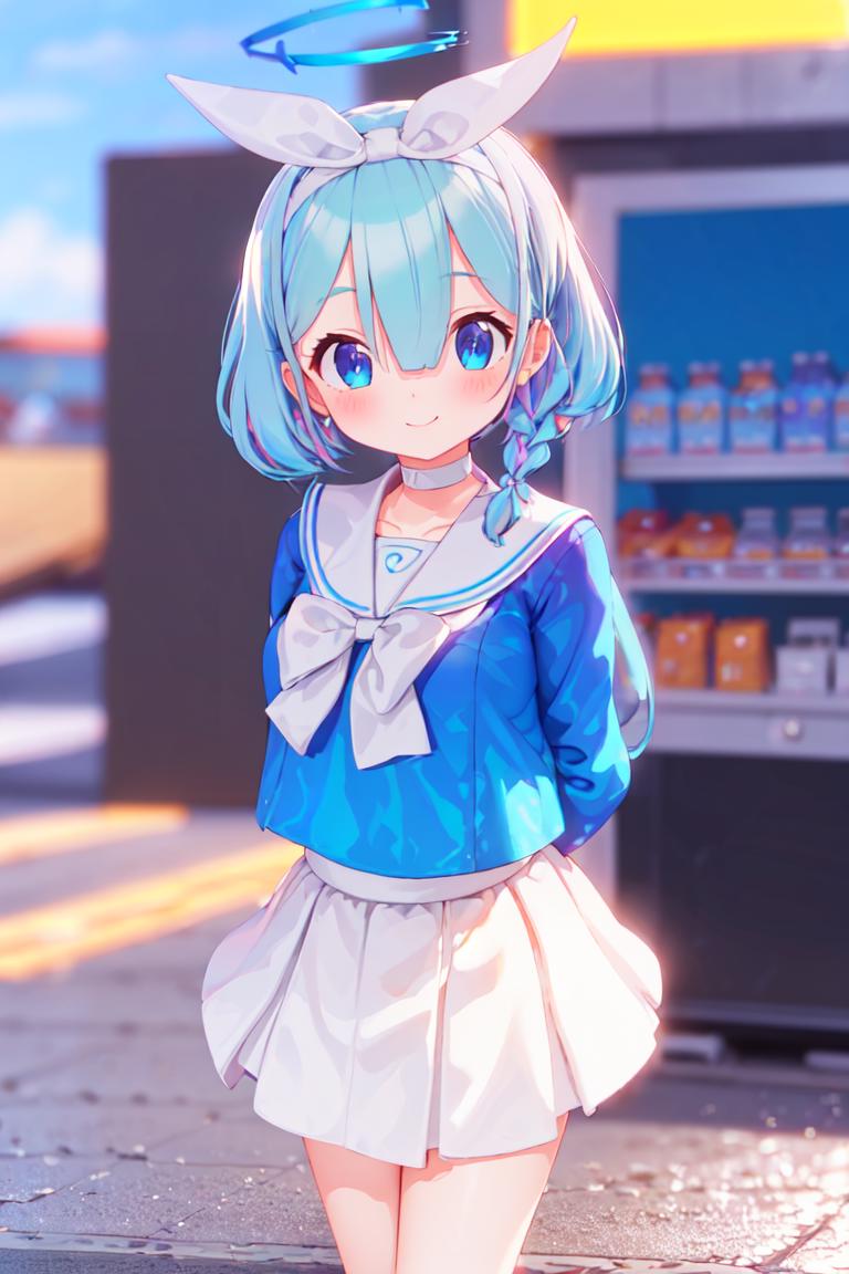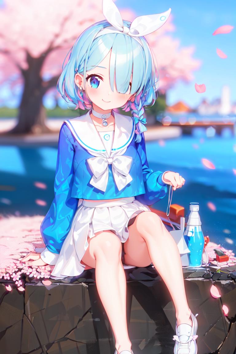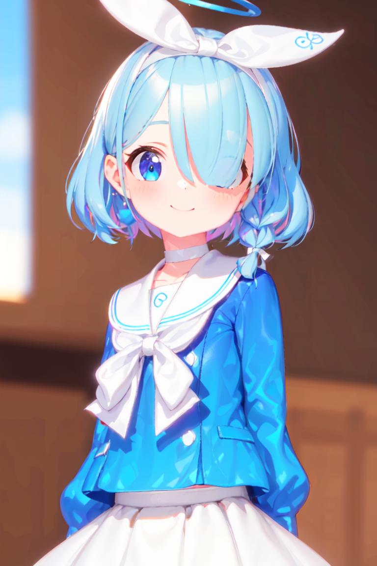 Arona,1girl,solo,shoes,white footwear,braid,blue shirt,serafuku,long sleeves,white sailor collar,hairband,white choker,bangs,smile,closed mouth,single braid,white half skirt,bow hairband,