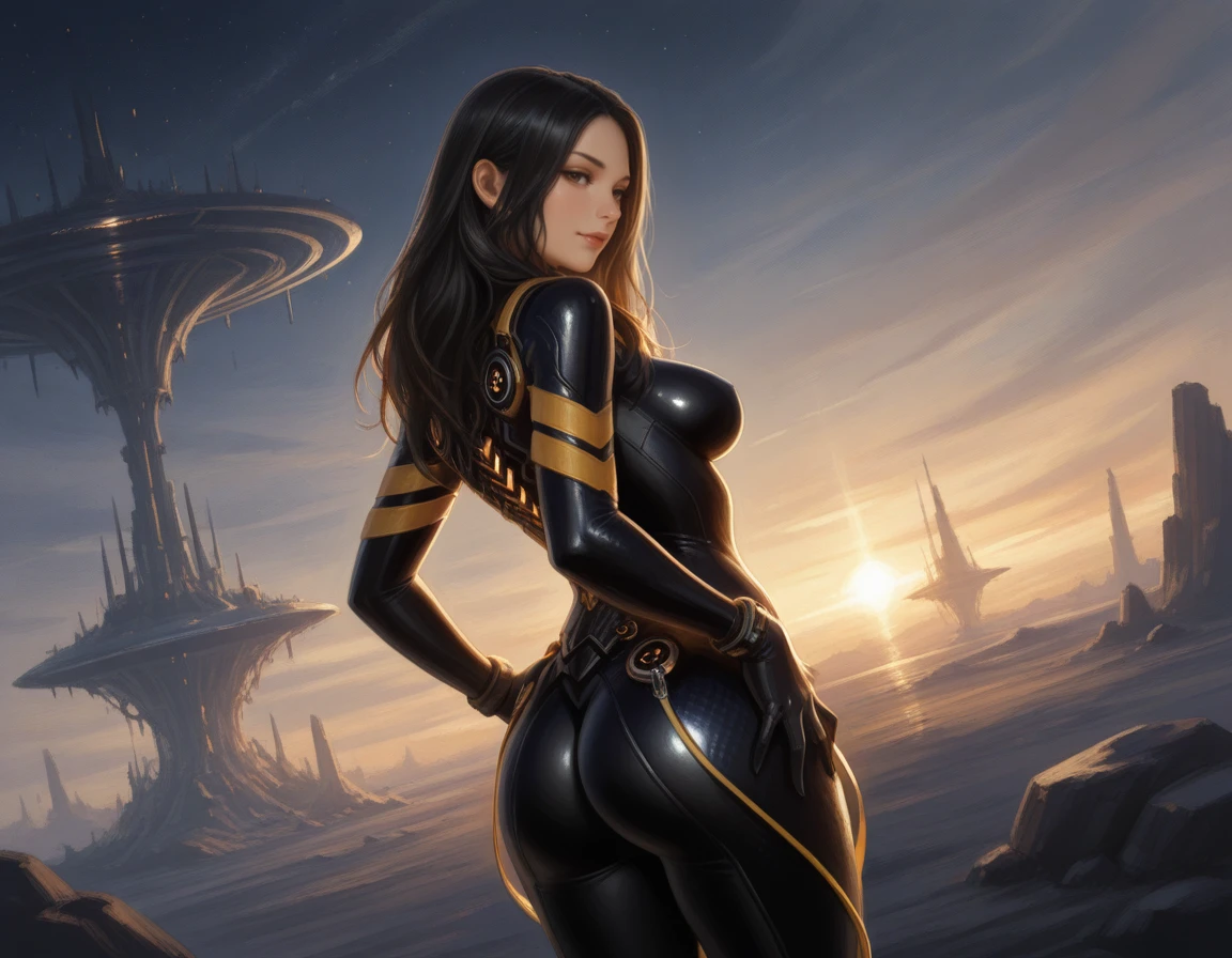 Starting prompt: 1girl, tachy \(stellar blade\), long hair, black hair, breasts, science fiction, skin tight, black bodysuit
