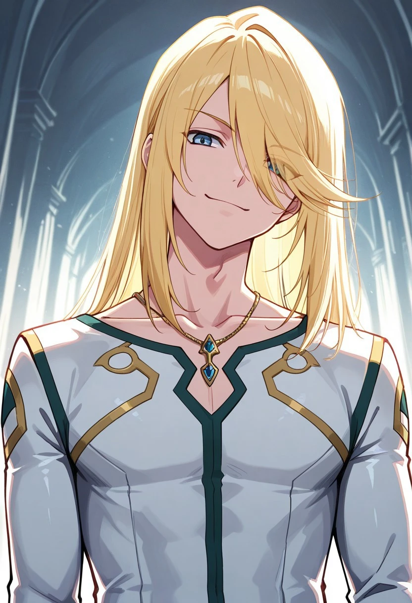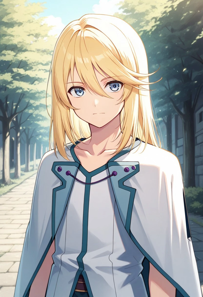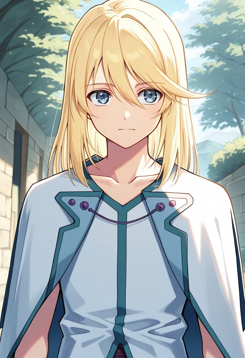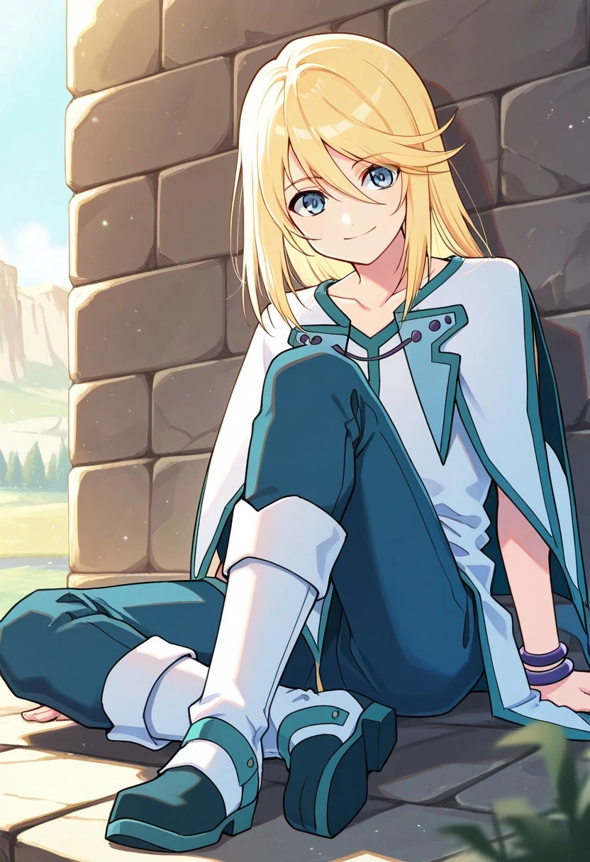 mithos, 1boy, male focus, solo, blue eyes, blonde hair, long hair, hair between eyes, bangs, shirt, white shirt, collarbone, sleeveless, capelet, white capelet, jewelry, bracelet, pants, blue pants, boots, white footwear,