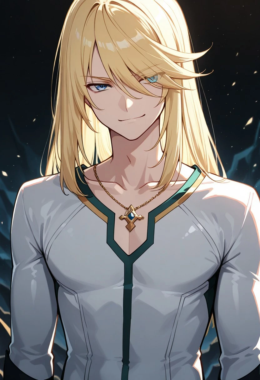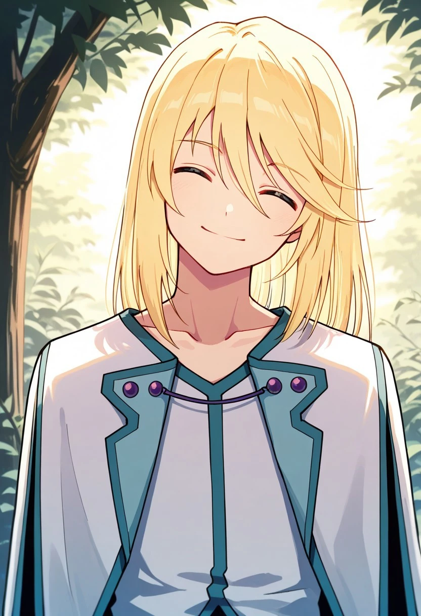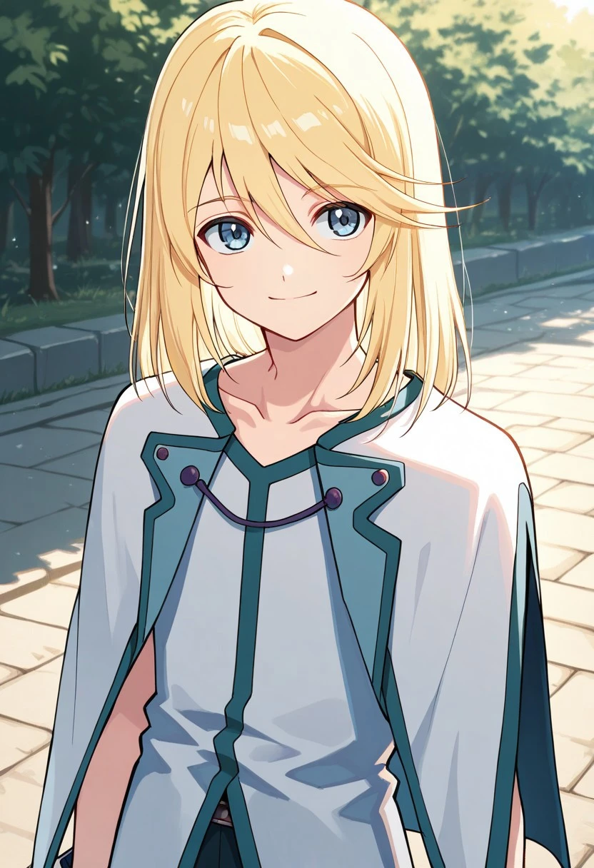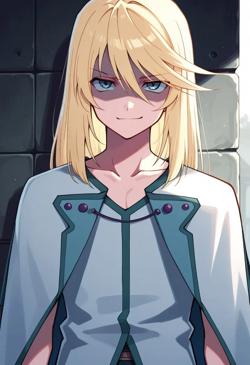mithos, 1boy, male focus, solo, blue eyes, blonde hair, long hair, hair between eyes, bangs, shirt, white shirt, collarbone, sleeveless, capelet, white capelet, jewelry, bracelet, pants, blue pants, boots, white footwear,