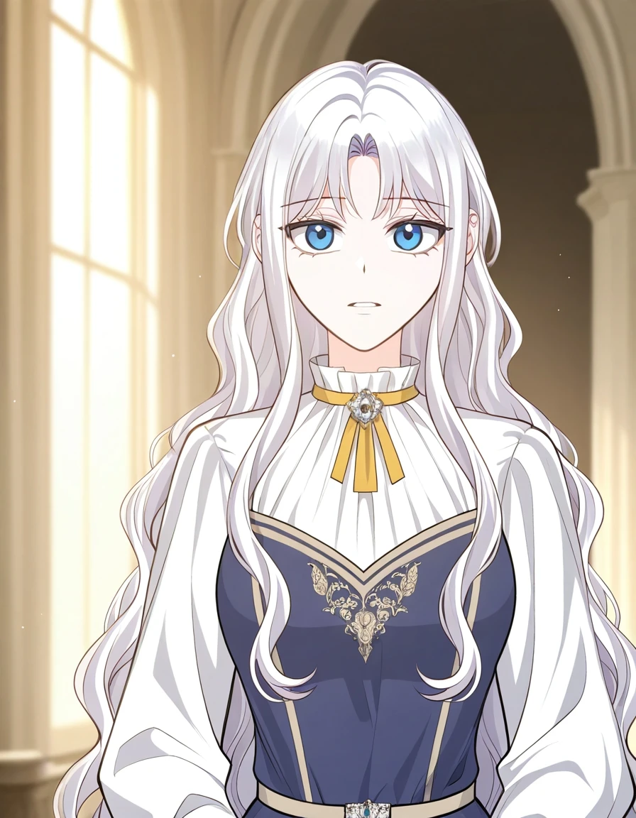 cassia_hall, silver hair, long hair, wavy hair, parted bangs, very long sidelocks, hair over shoulders, blue eyes
