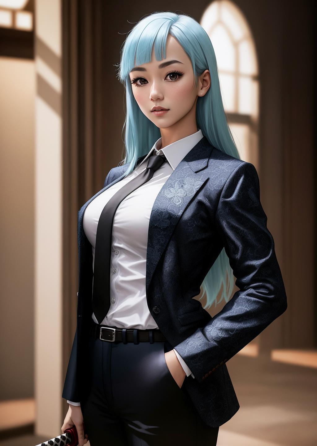 To use this LoRA, including the trigger word miwaKasumi at a weight of around 0.7-0.9. Adding descriptive words like light blue hair, long hair, and blunt bangs should also help bring out the character's features. To generate her default outfit, include suit, black jacket, black tie, white shirt, and black pants with open jacket added to the negative prompts.