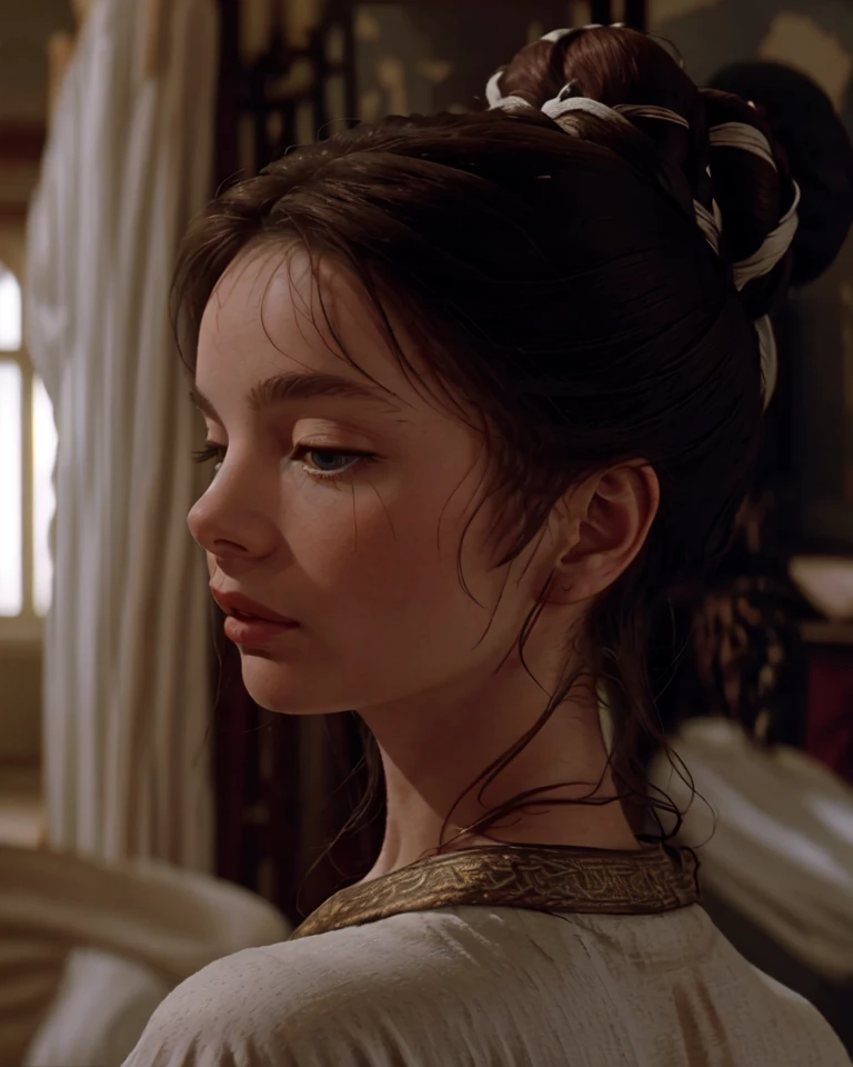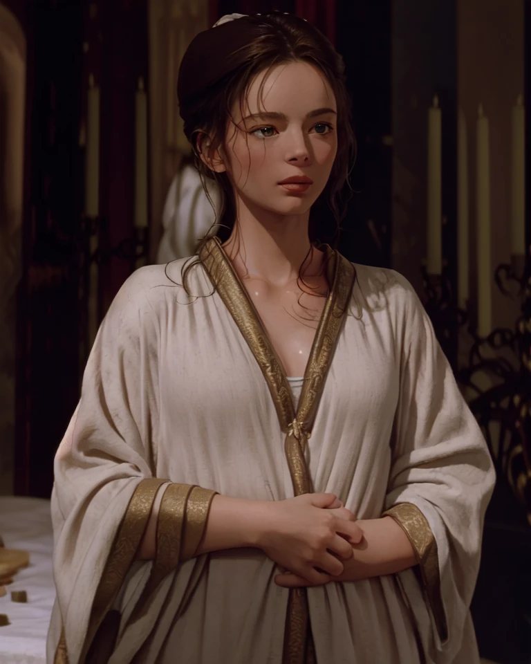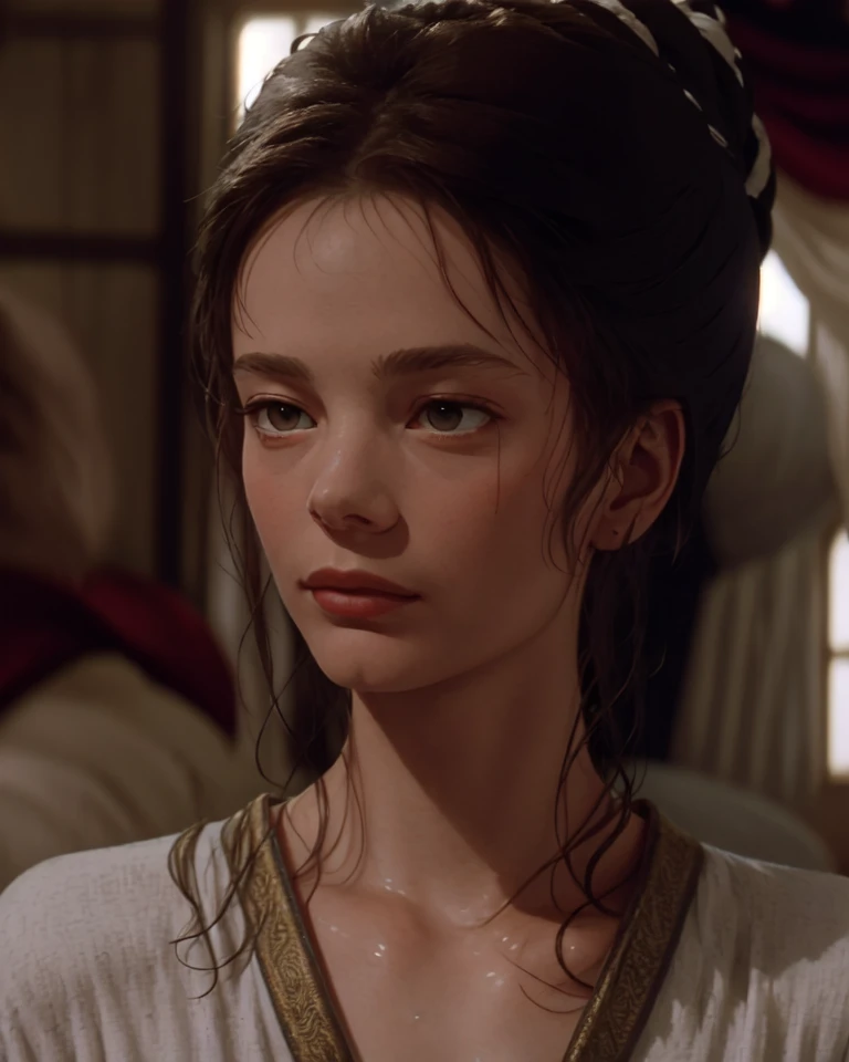 3manne_02, grey eyes, brunette, hair up, hair bun, eyebrows, lips, realistic, white robe gold trim
